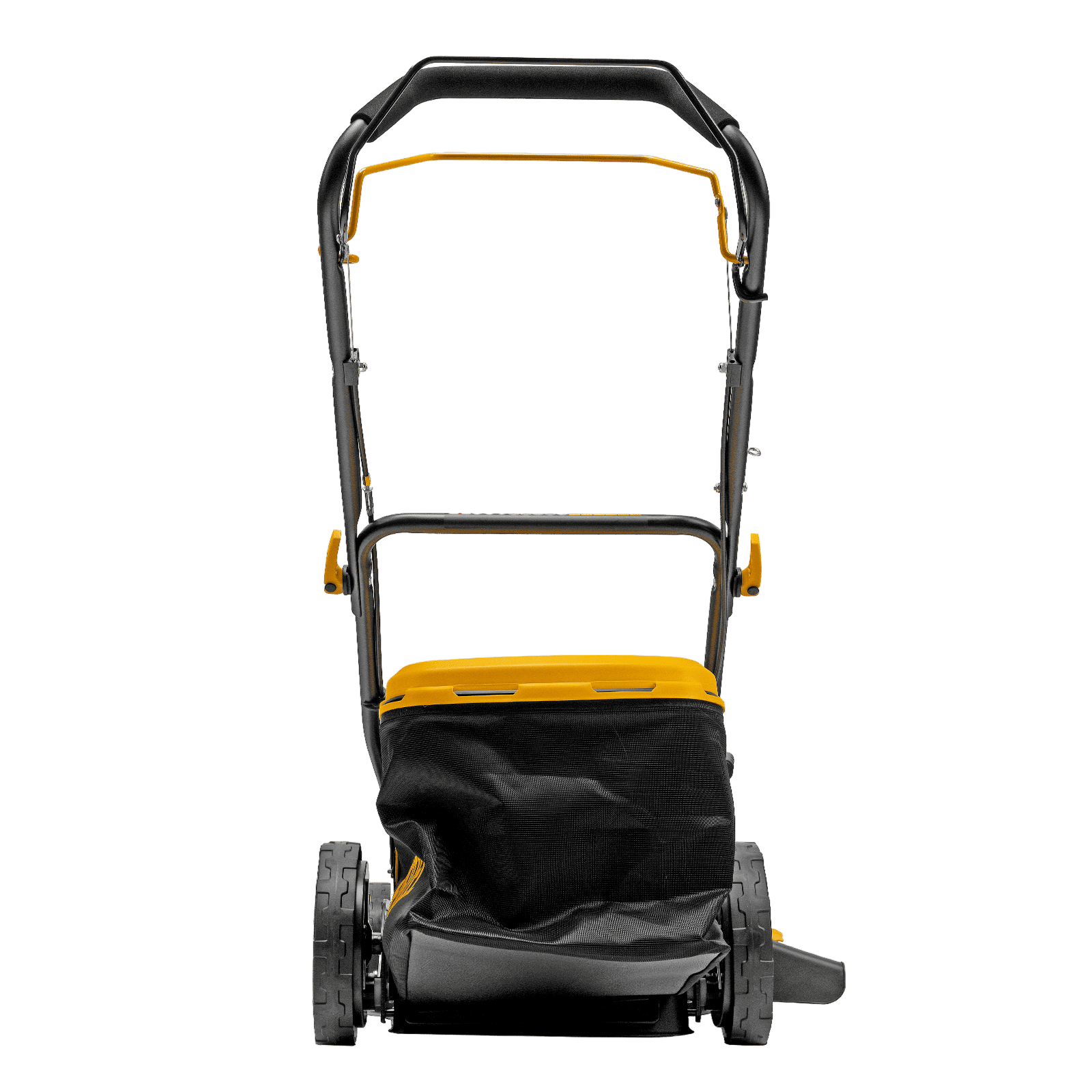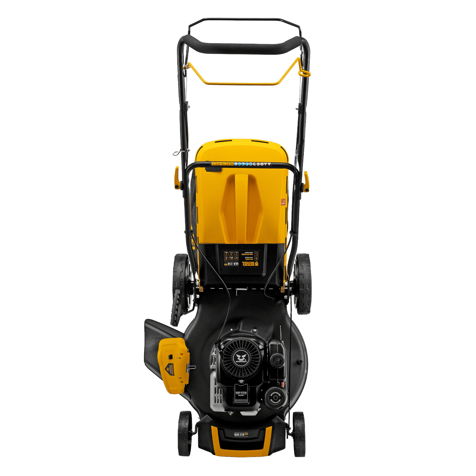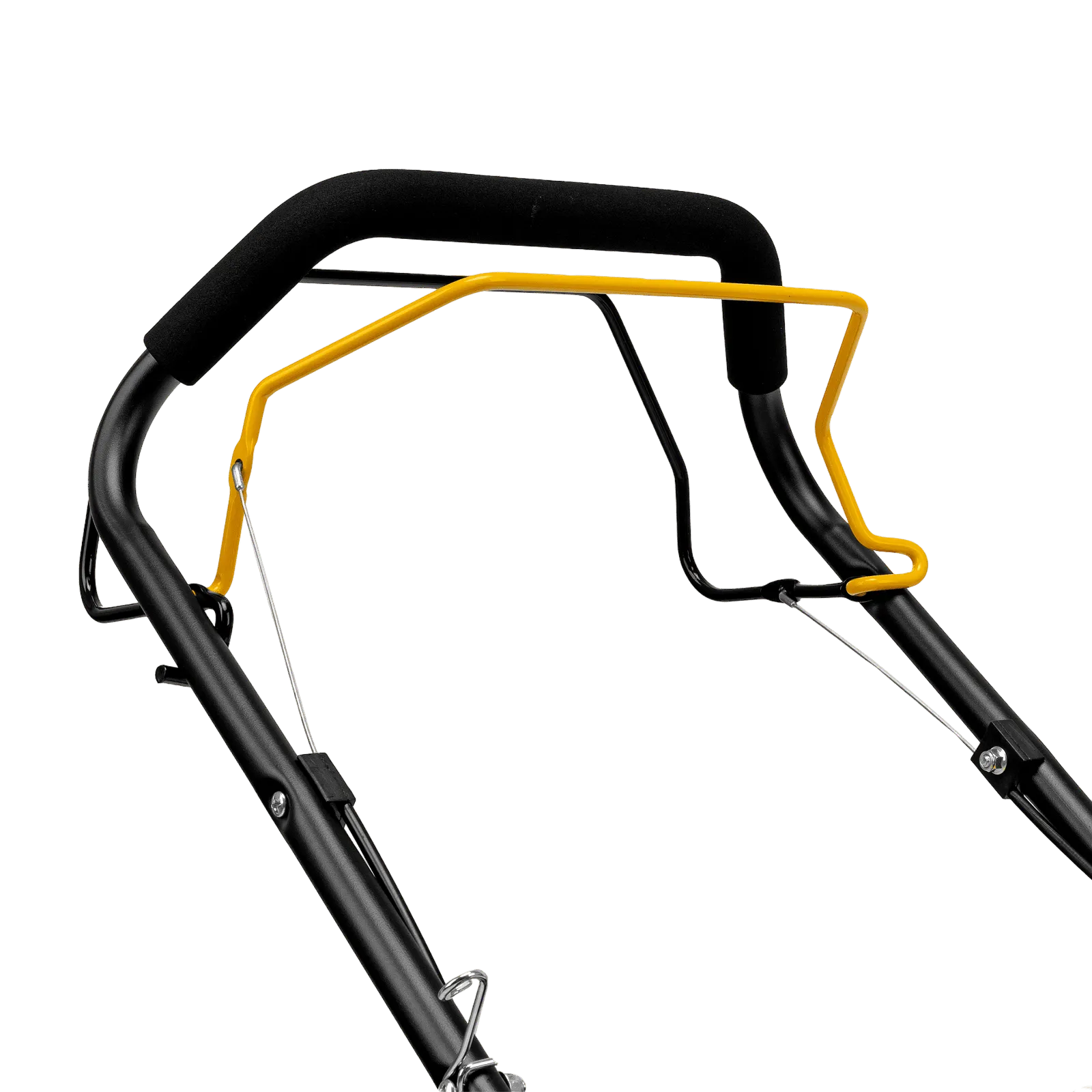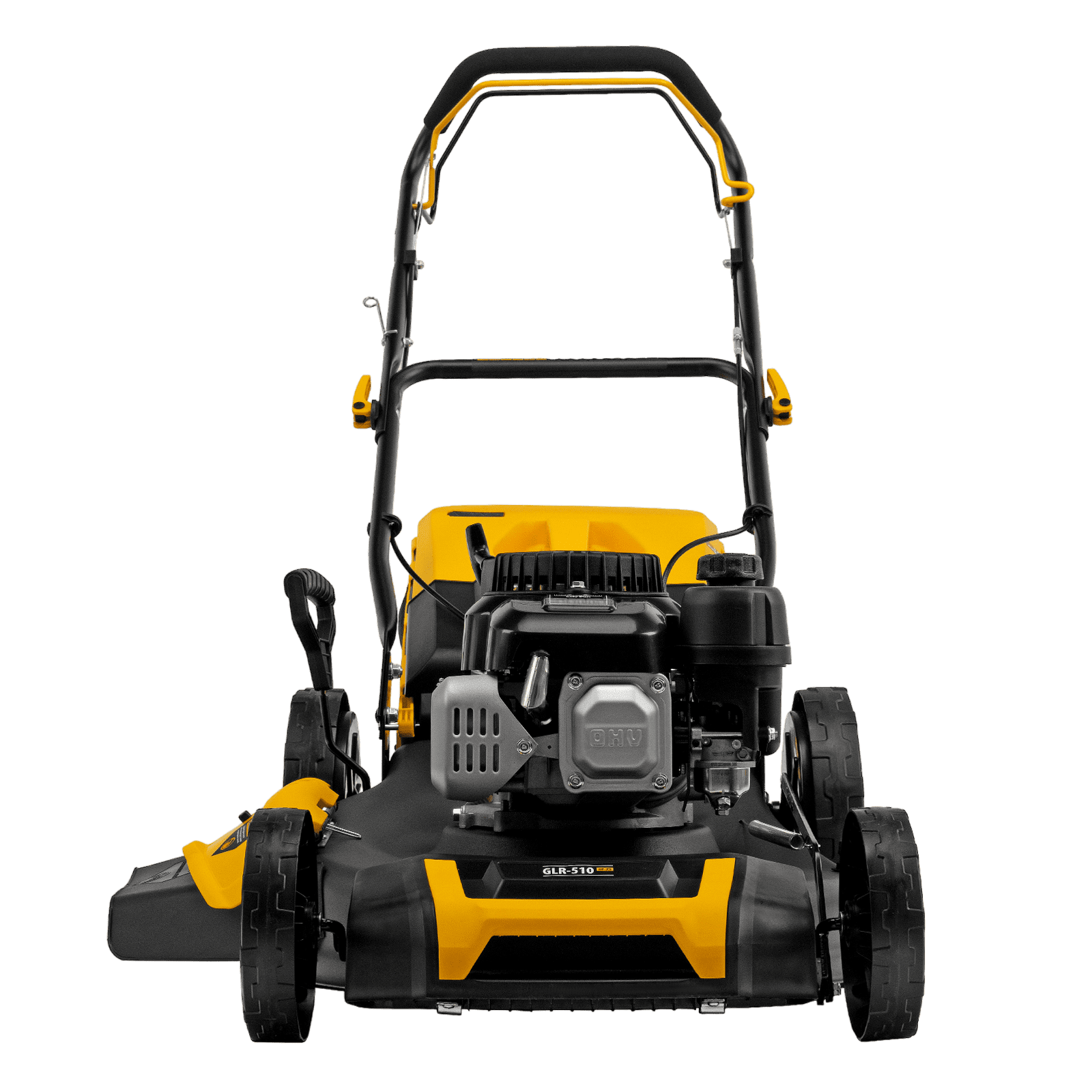 - Широкие колеса Eco-friendly — газонокосилка легко проходит по газону, не повреждая его.