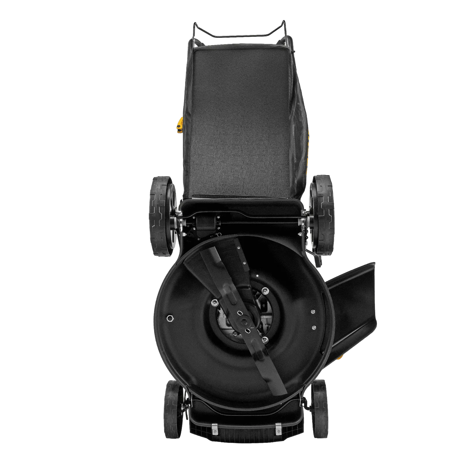 - Широкий функционал «4 в 1» — газонокосилка работает в режимах сбора травы в объемный контейнер, мульчирования, бокового выброса, а также выброса травы под деку.