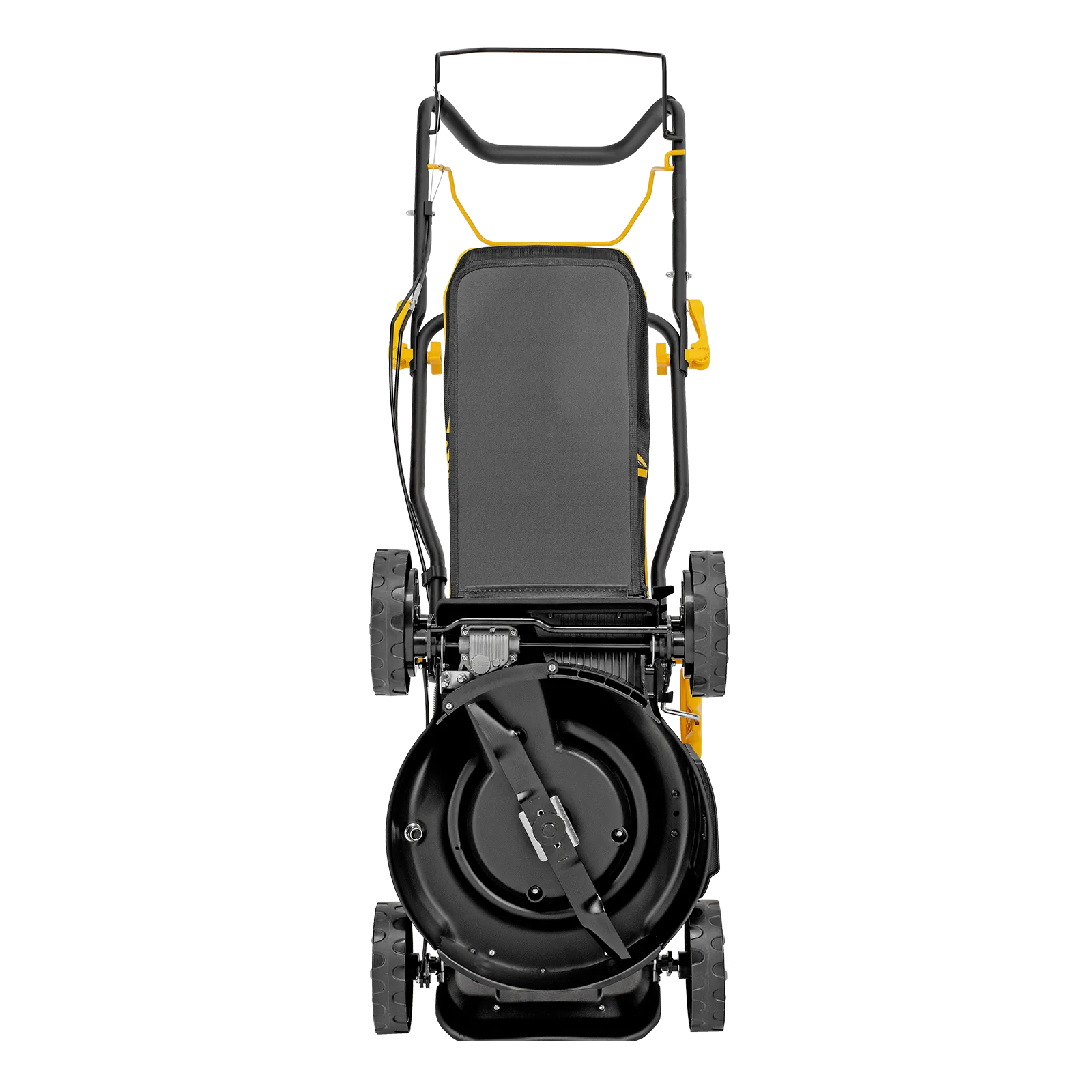 - Продуманная конструкция — рукоятка с эксцентриковыми фиксаторами легко складывается, газонокосилка не занимает много места в зоне хранения.