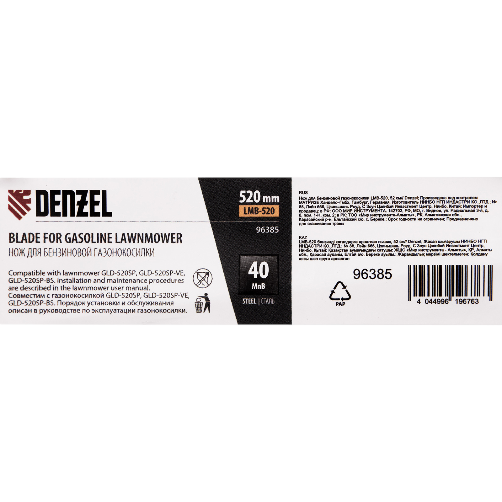 Нож Denzel 96385 длиной 52 см — сменный режущий элемент для бензиновых газонокосилок GLD-520SP, GLD-520SP-BS и GLD-520SP-VE. Используется для скашивания травы на дачных газонах, кортах, а также для ухода за садовыми и парковыми территориями. Эффективно срезает траву, пригодится владельцам дачных участков и работникам коммунальных служб.