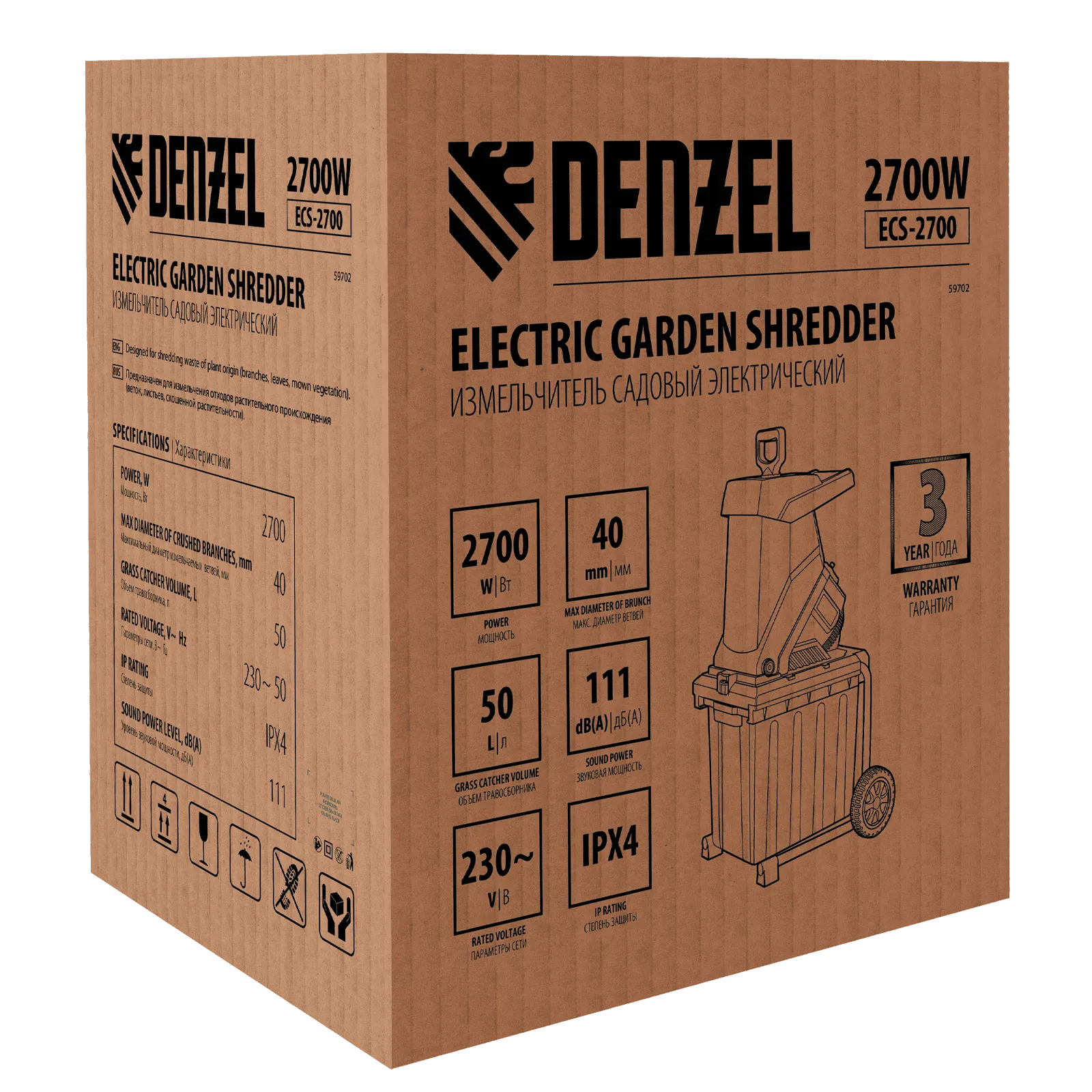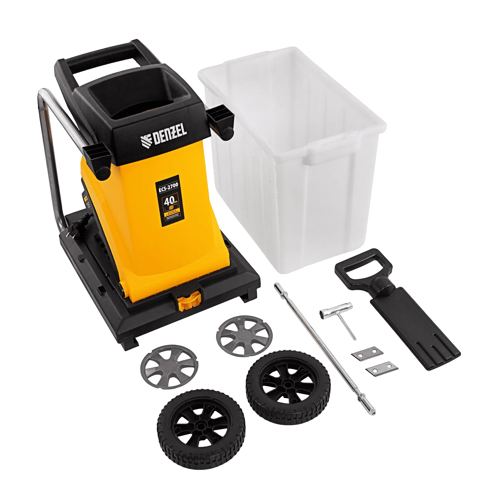 Измельчитель садовый электрический Denzel ECS-2700 59702 мощностью 2700 Вт предназначен для утилизации веток, листвы, скошенной растительности диаметром до 40 мм. Станет незаменимым помощником в саду или на даче, позволит поддерживать порядок на приусадебном участке. Скорость вращения режущих элементов составляет 4050 оборотов в минуту, что позволяет быстро решать поставленные задачи. Пластиковый травосборник объемом 50 л легко снимается для опорожнения.