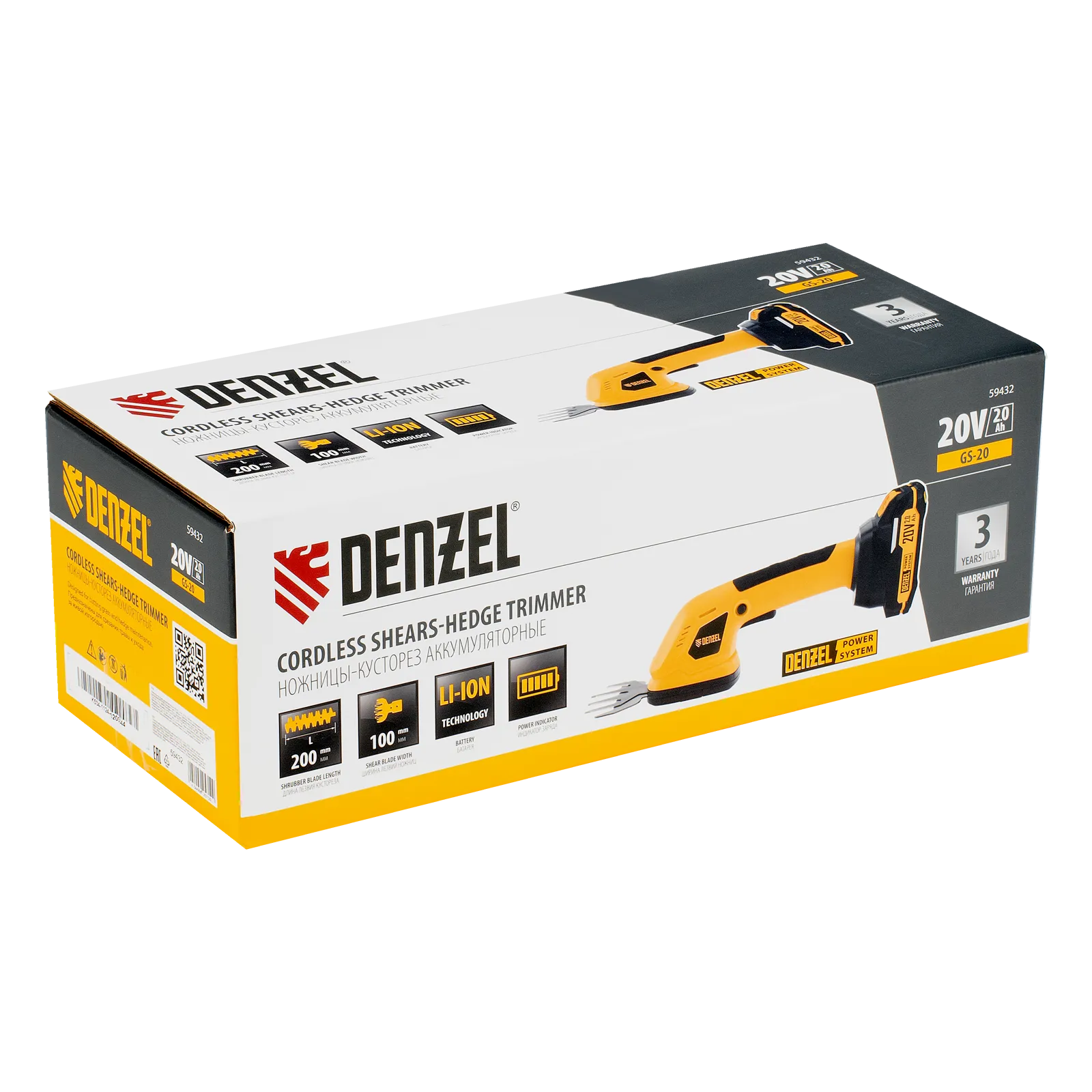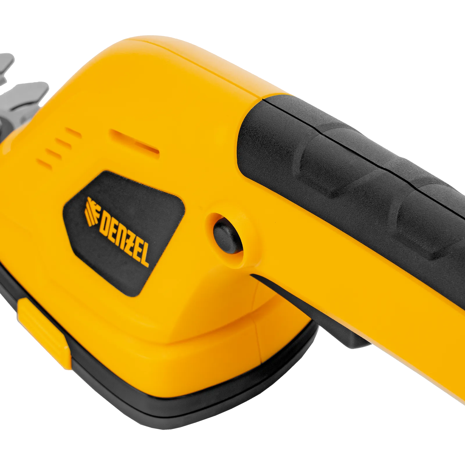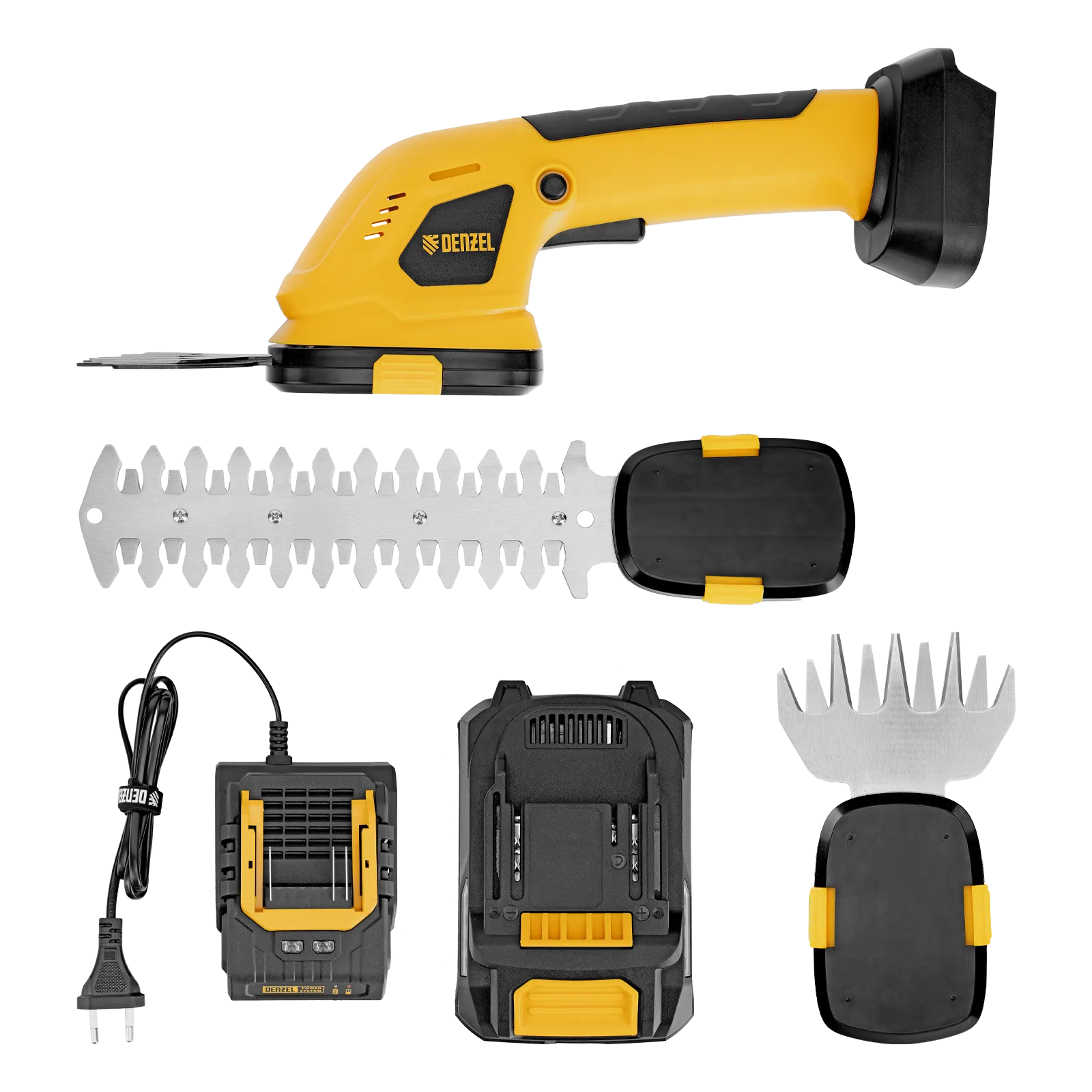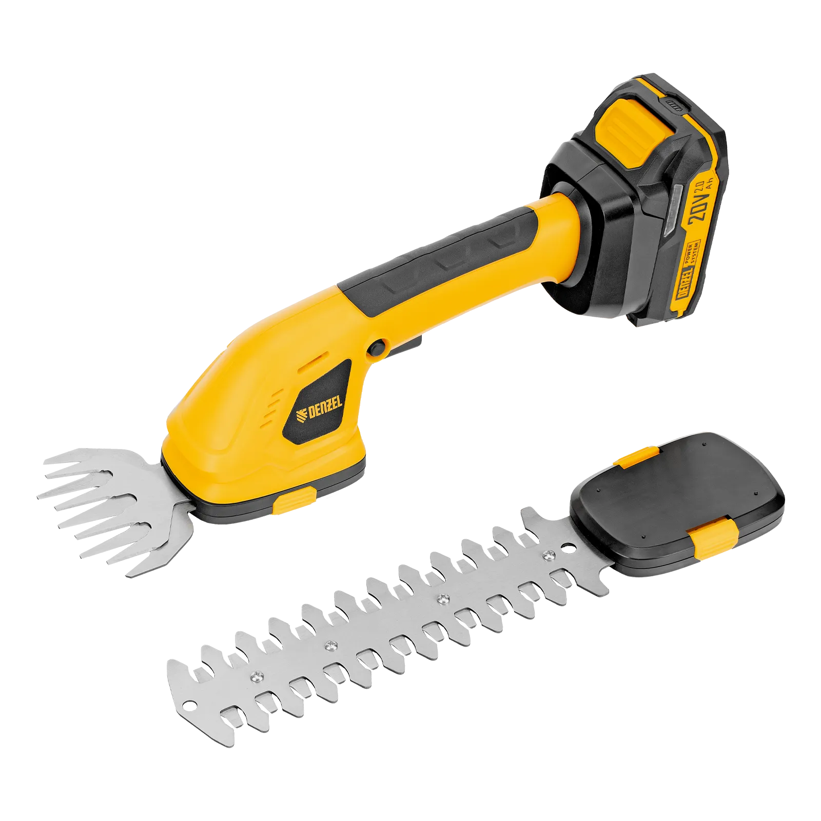 Аккумуляторные ножницы-кусторез Denzel GS-20 59432 работают от аккумулятора Li-Ion 20 В емкостью 2 А·ч. Предусмотрено 2 режима: ножниц для срезания травы и кустореза для обрезки кустарника, ухода за живой изгородью. Максимальная толщина срезаемых веток составляет 8 мм. Ширина среза в режиме ножниц составляет 100 мм, в режиме кустореза — 200 мм, что позволяет быстро и эффективно справиться с работой. Инструмент предназначен для бытового использования.