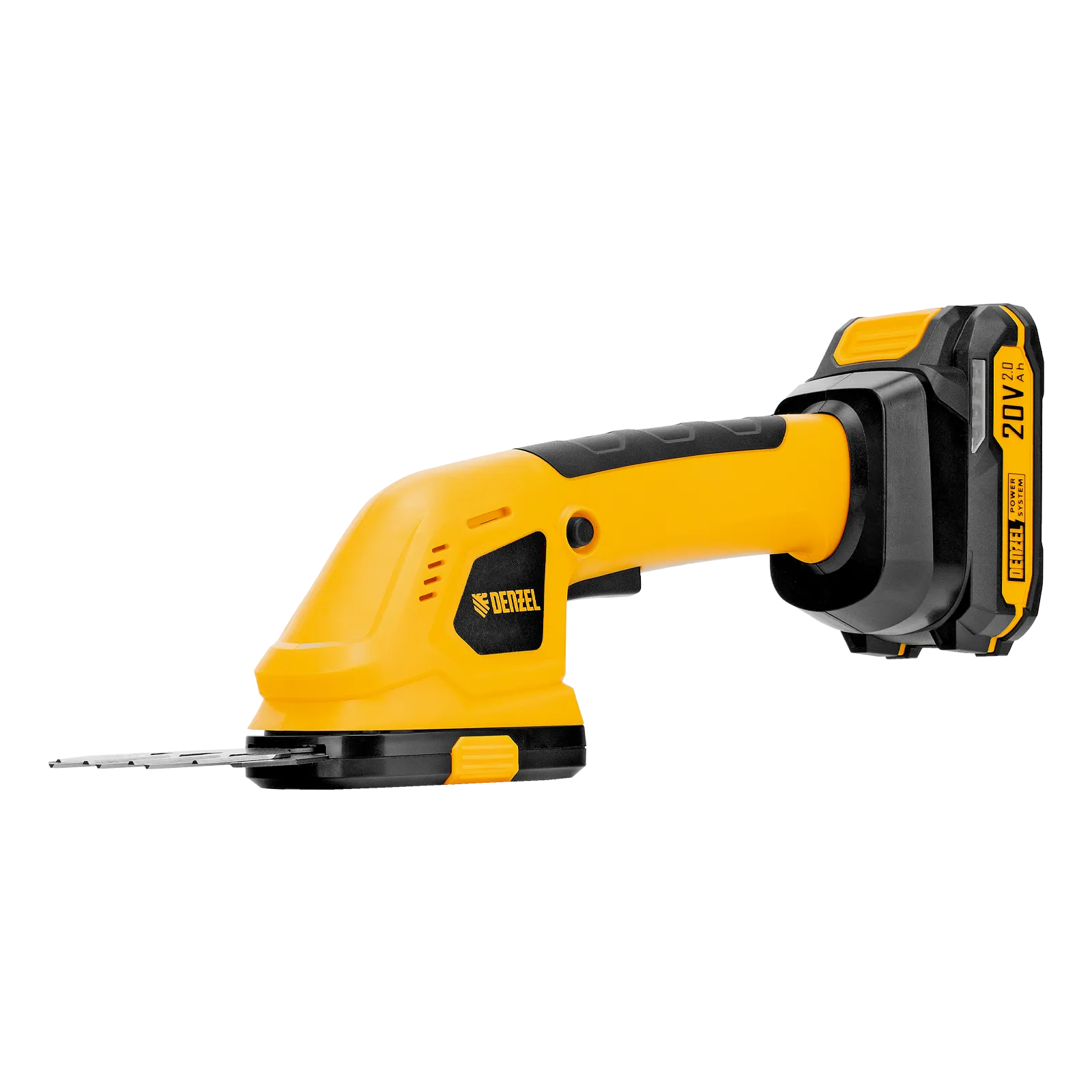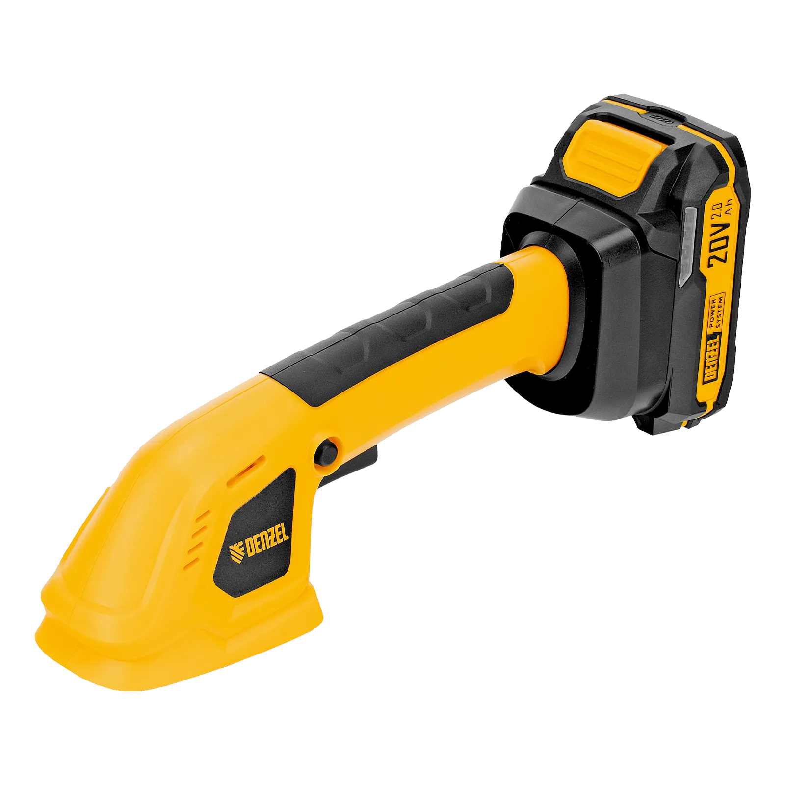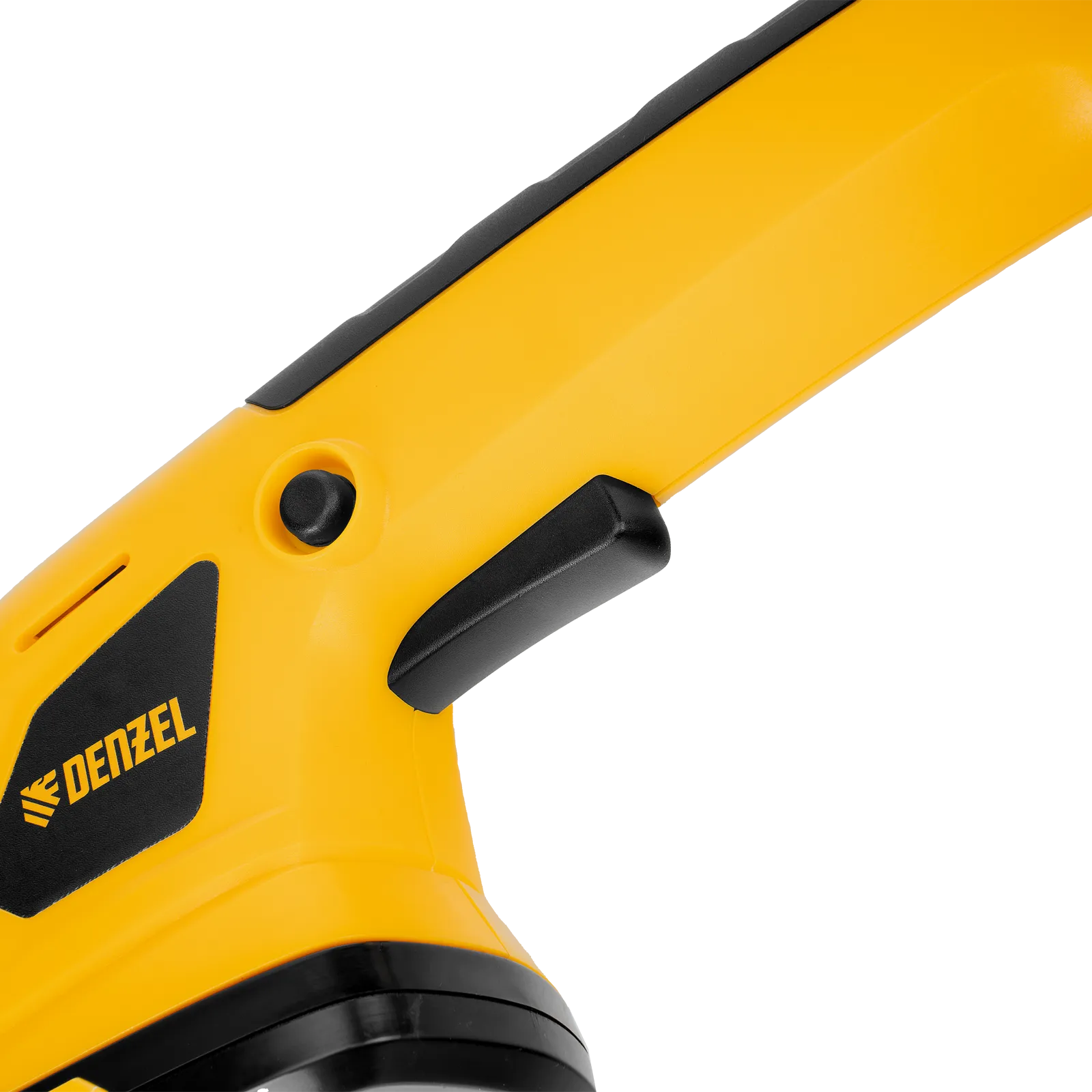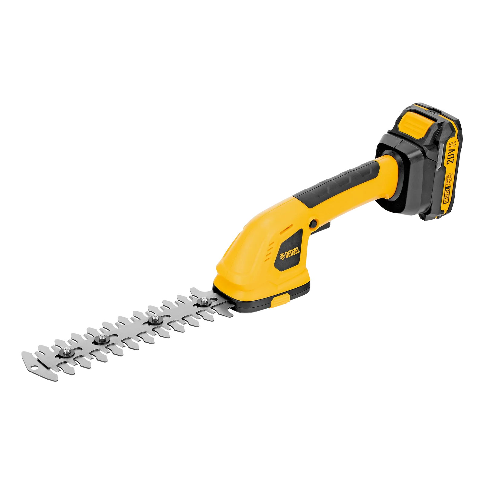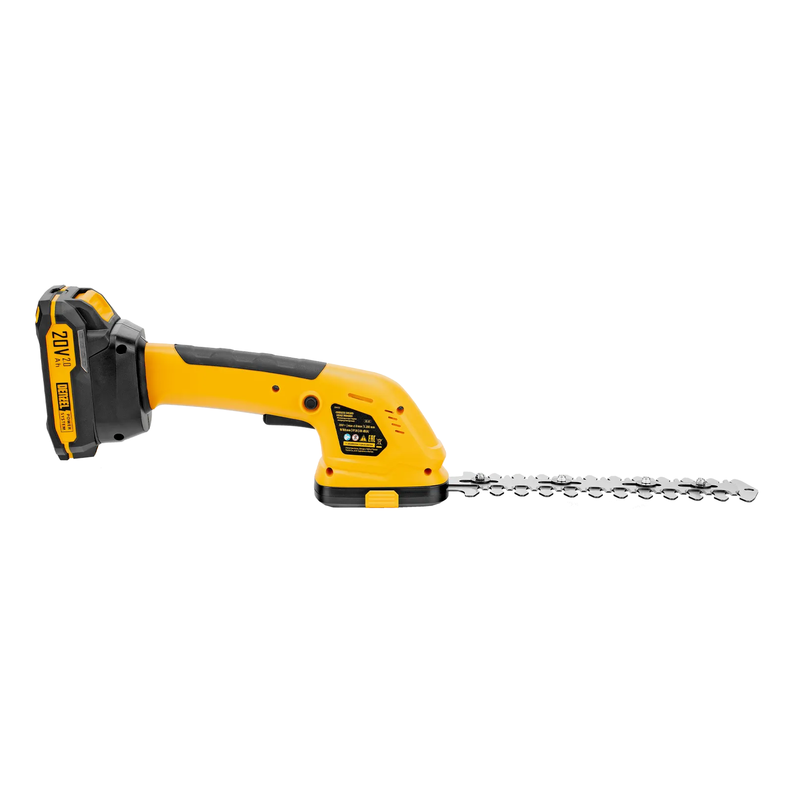 Аккумуляторные ножницы-кусторез Denzel GS-20 59432 работают от аккумулятора Li-Ion 20 В емкостью 2 А·ч. Предусмотрено 2 режима: ножниц для срезания травы и кустореза для обрезки кустарника, ухода за живой изгородью. Максимальная толщина срезаемых веток составляет 8 мм. Ширина среза в режиме ножниц составляет 100 мм, в режиме кустореза — 200 мм, что позволяет быстро и эффективно справиться с работой. Инструмент предназначен для бытового использования.