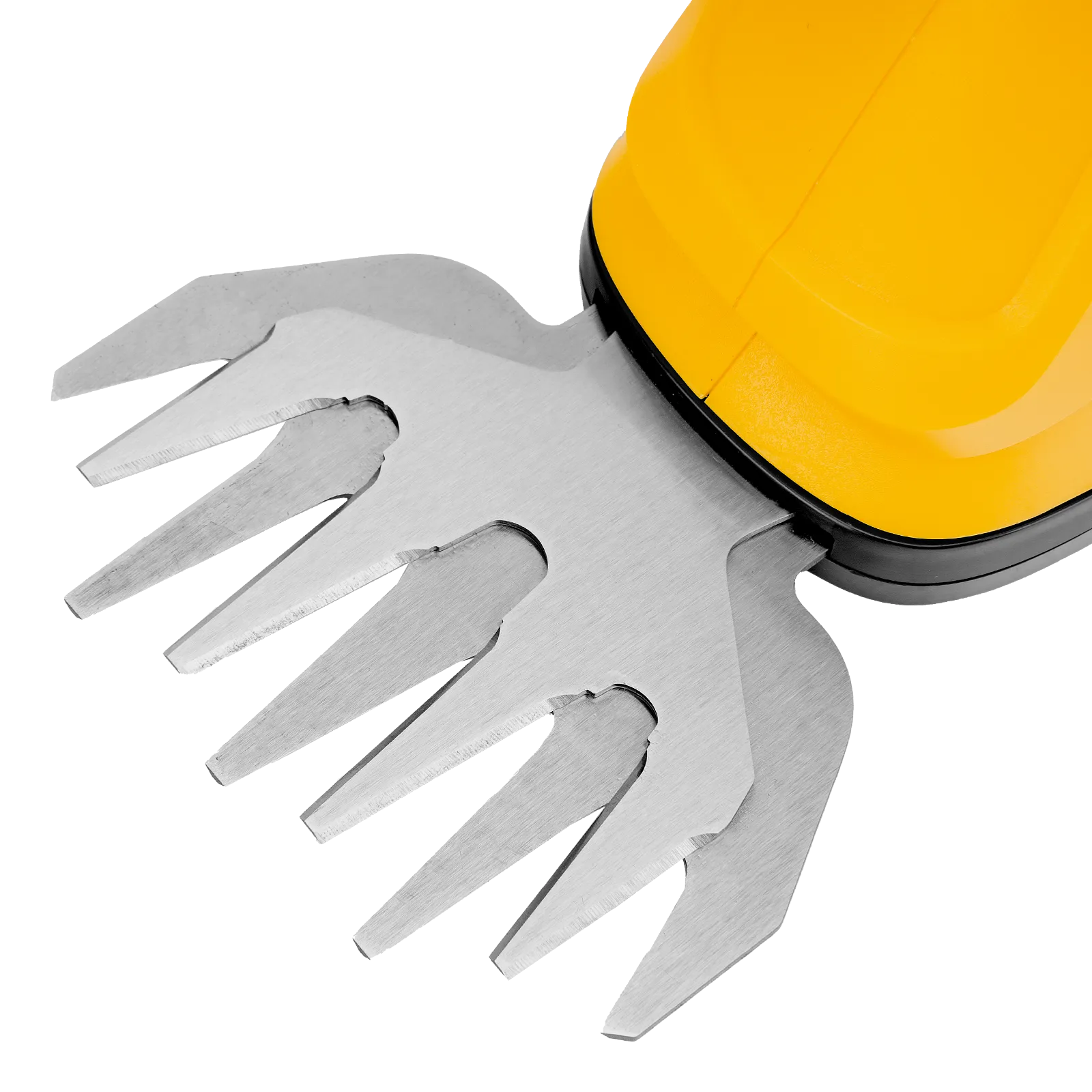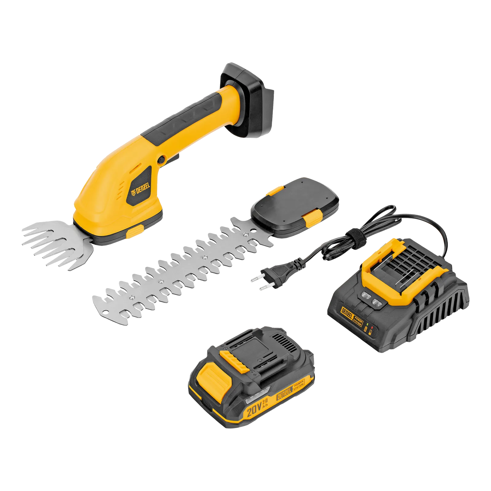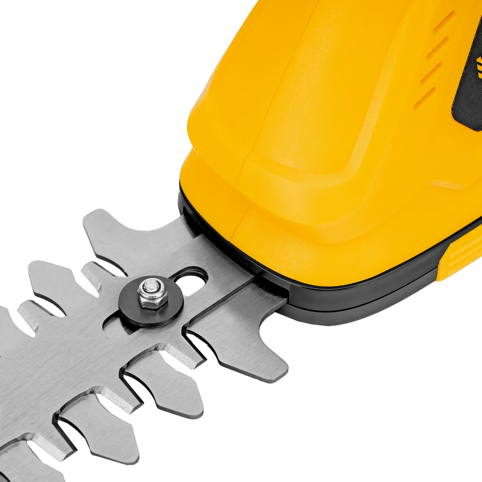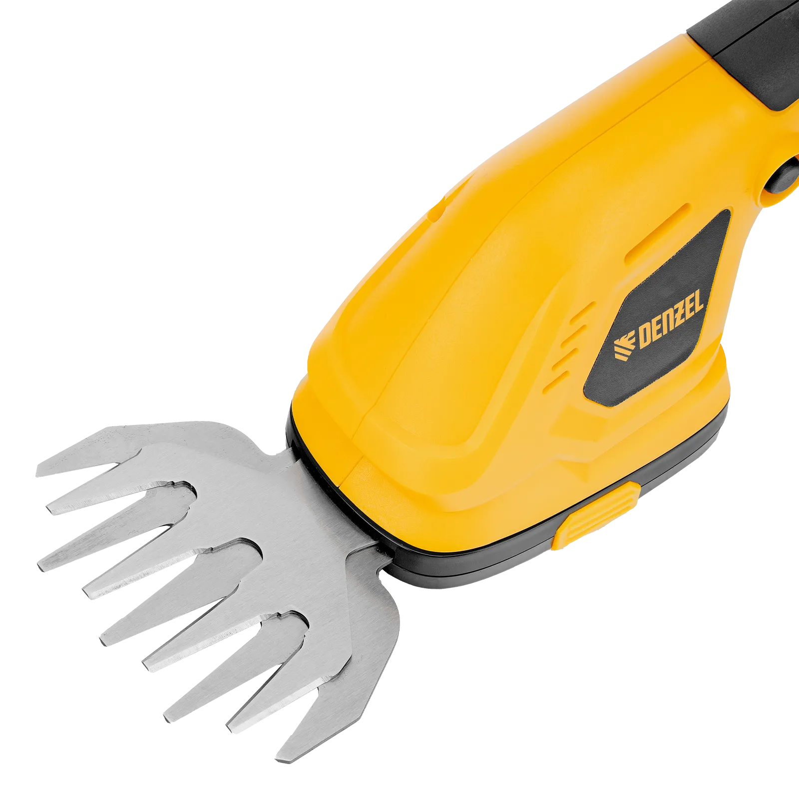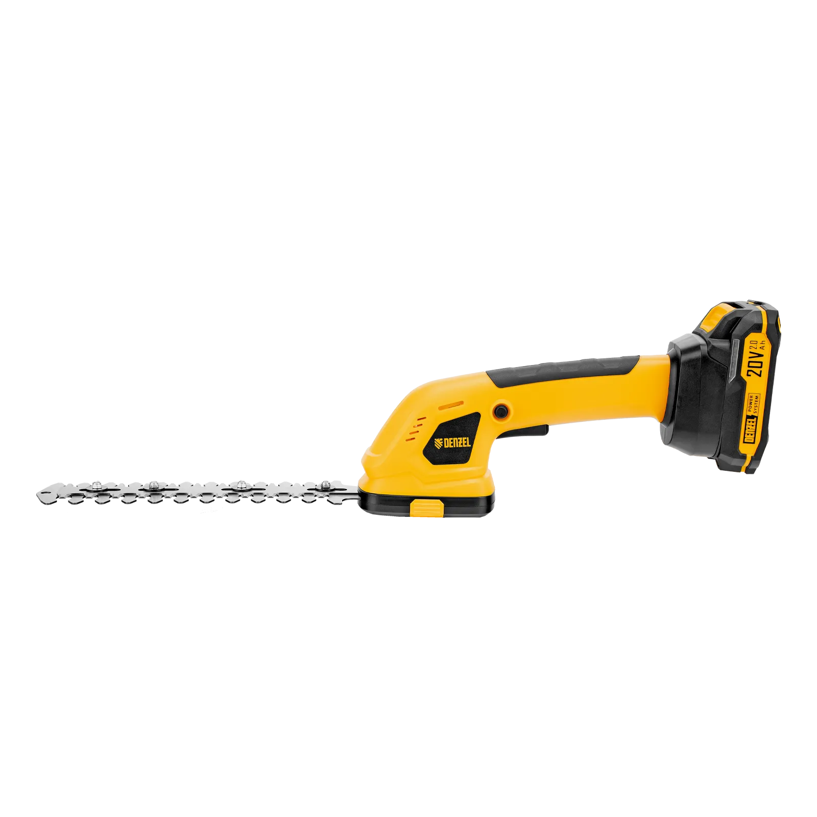 Аккумуляторные ножницы-кусторез Denzel GS-20 59432 работают от аккумулятора Li-Ion 20 В емкостью 2 А·ч. Предусмотрено 2 режима: ножниц для срезания травы и кустореза для обрезки кустарника, ухода за живой изгородью. Максимальная толщина срезаемых веток составляет 8 мм. Ширина среза в режиме ножниц составляет 100 мм, в режиме кустореза — 200 мм, что позволяет быстро и эффективно справиться с работой. Инструмент предназначен для бытового использования.