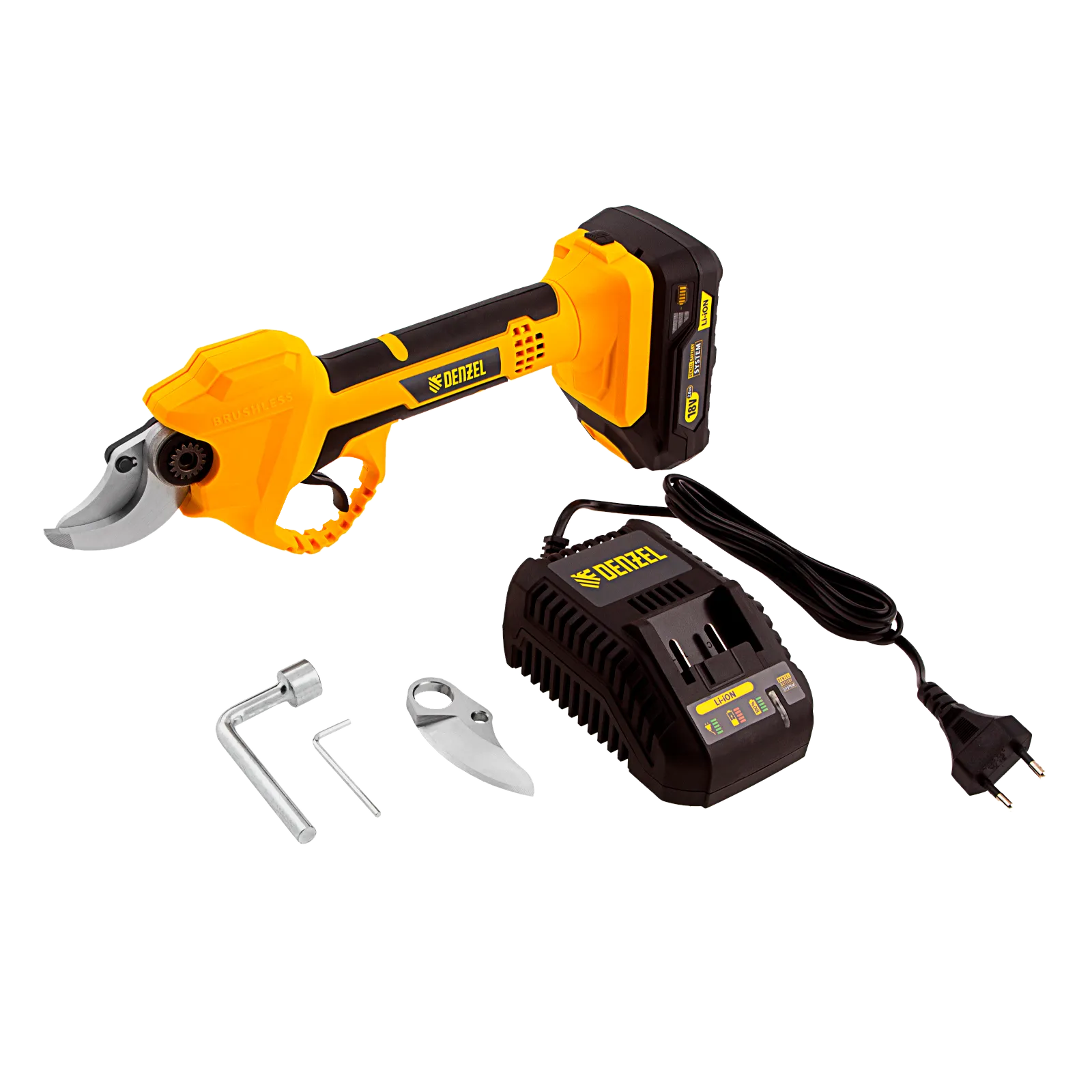 - Полный комплект поставки — аккумулятор и зарядное устройство прилагаются к секатору.
