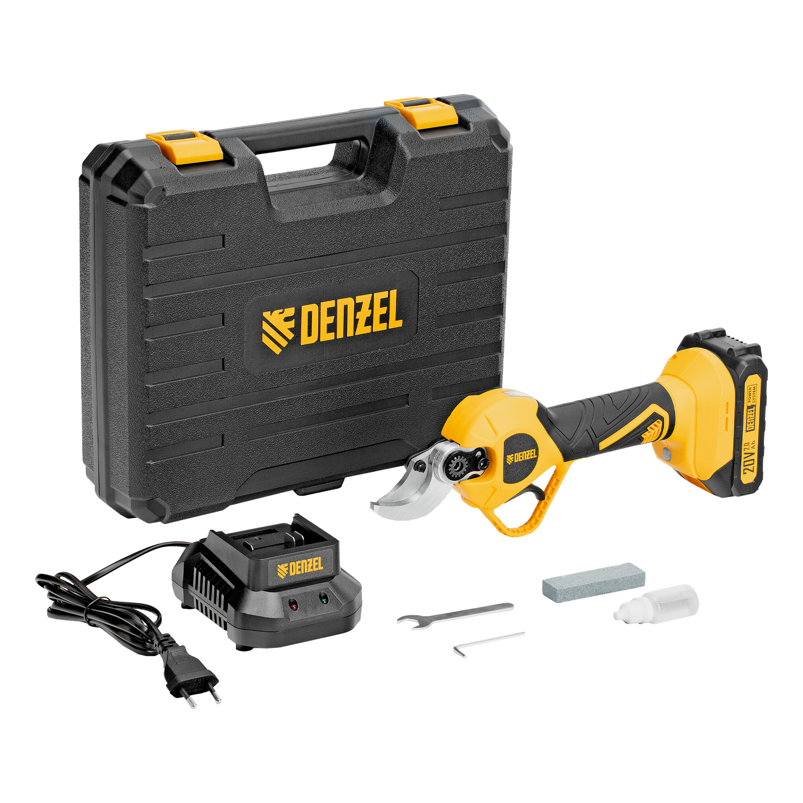 - Расширенная комплектация — секатор поставляется с аккумулятором, зарядным устройством, гаечным и шестигранным ключами, масленкой и точильным камнем.