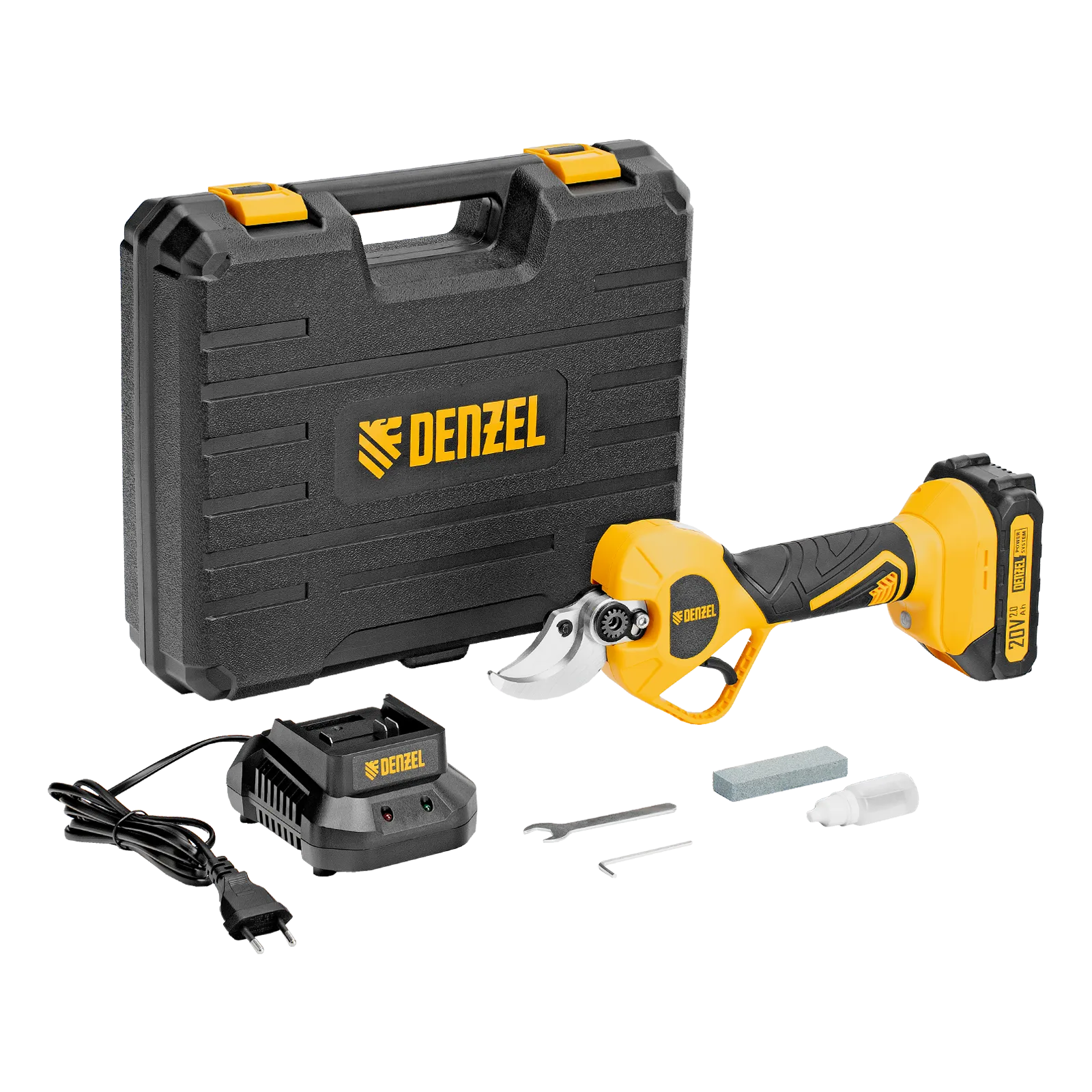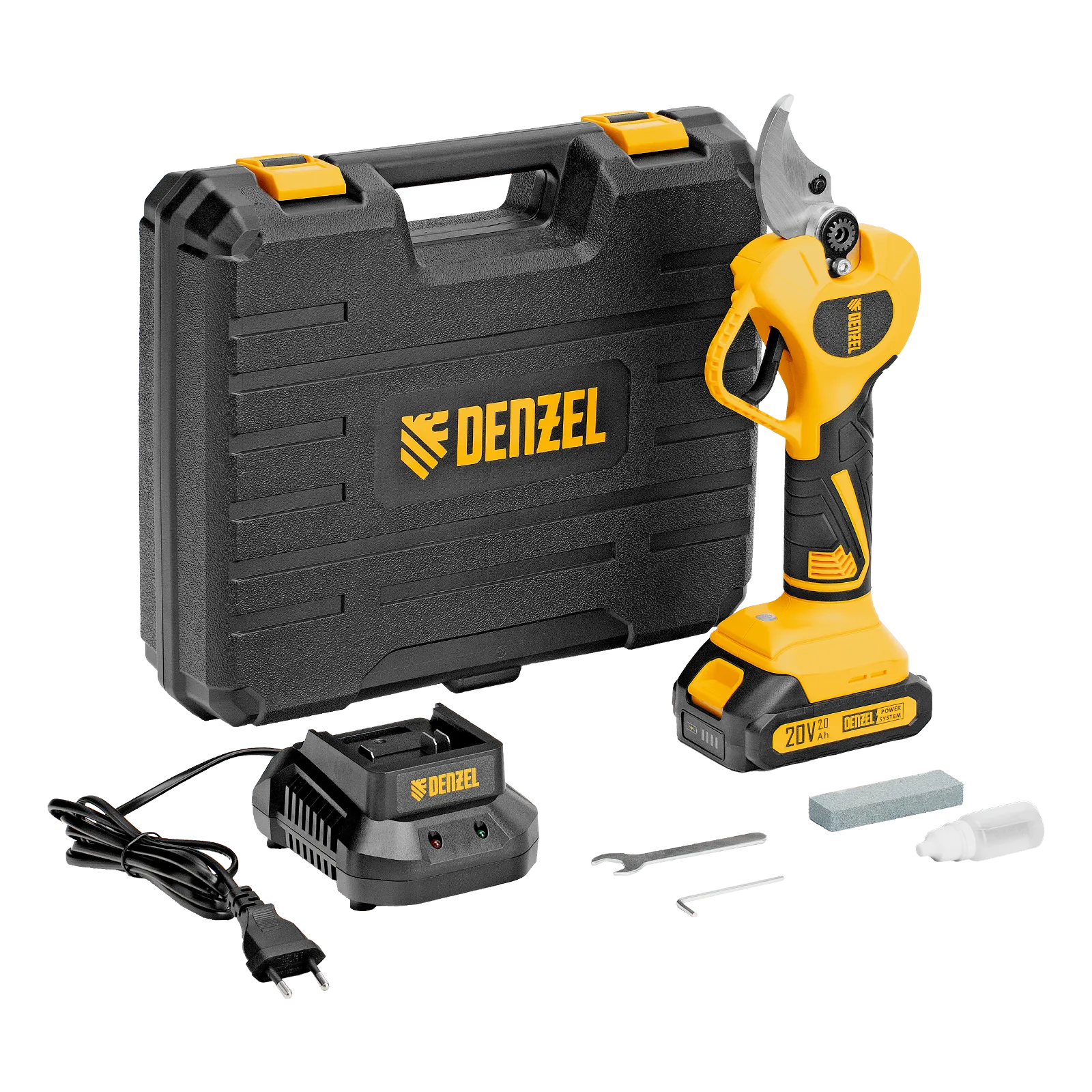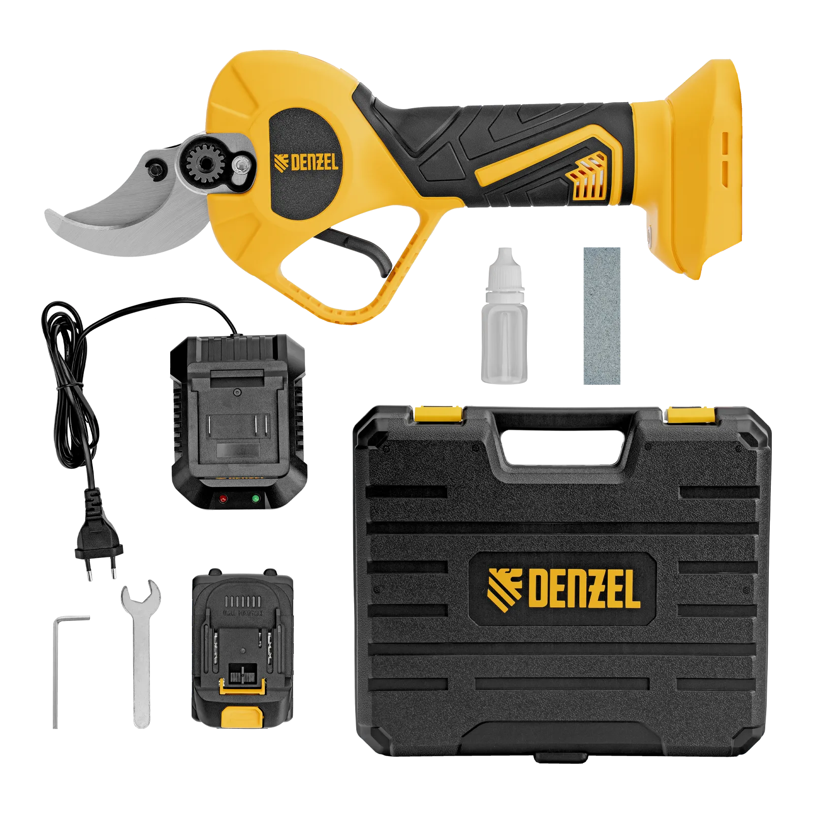 - Широкая комплектация — секатор поставляется с аккумулятором, зарядным устройством, гаечным и шестигранным ключами, масленкой и точильным камнем.