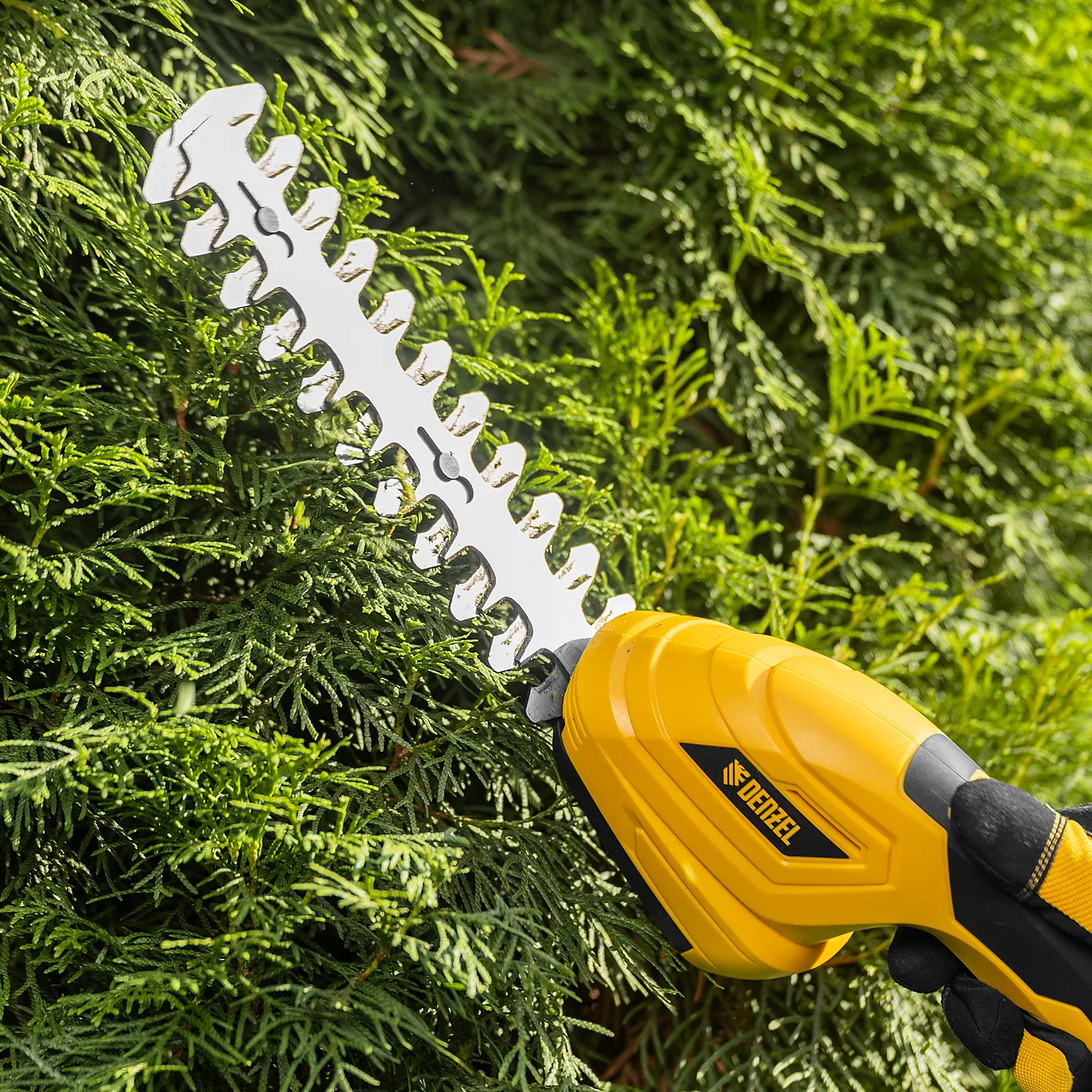 Аккумуляторные ножницы-кусторез Denzel CGS-100-0 59431 работают от батареи 18 В Li-Ion (не входит в комплект поставки) и предназначены для срезания травы, обрезки кустарников, листвы и тонких побегов деревьев диаметром до 8 мм. Инструмент оптимален для создания живой изгороди на дачном участке, создания ландшафтных скульптур из декоративных растений, подравнивания растительности вдоль заборов и бордюров.