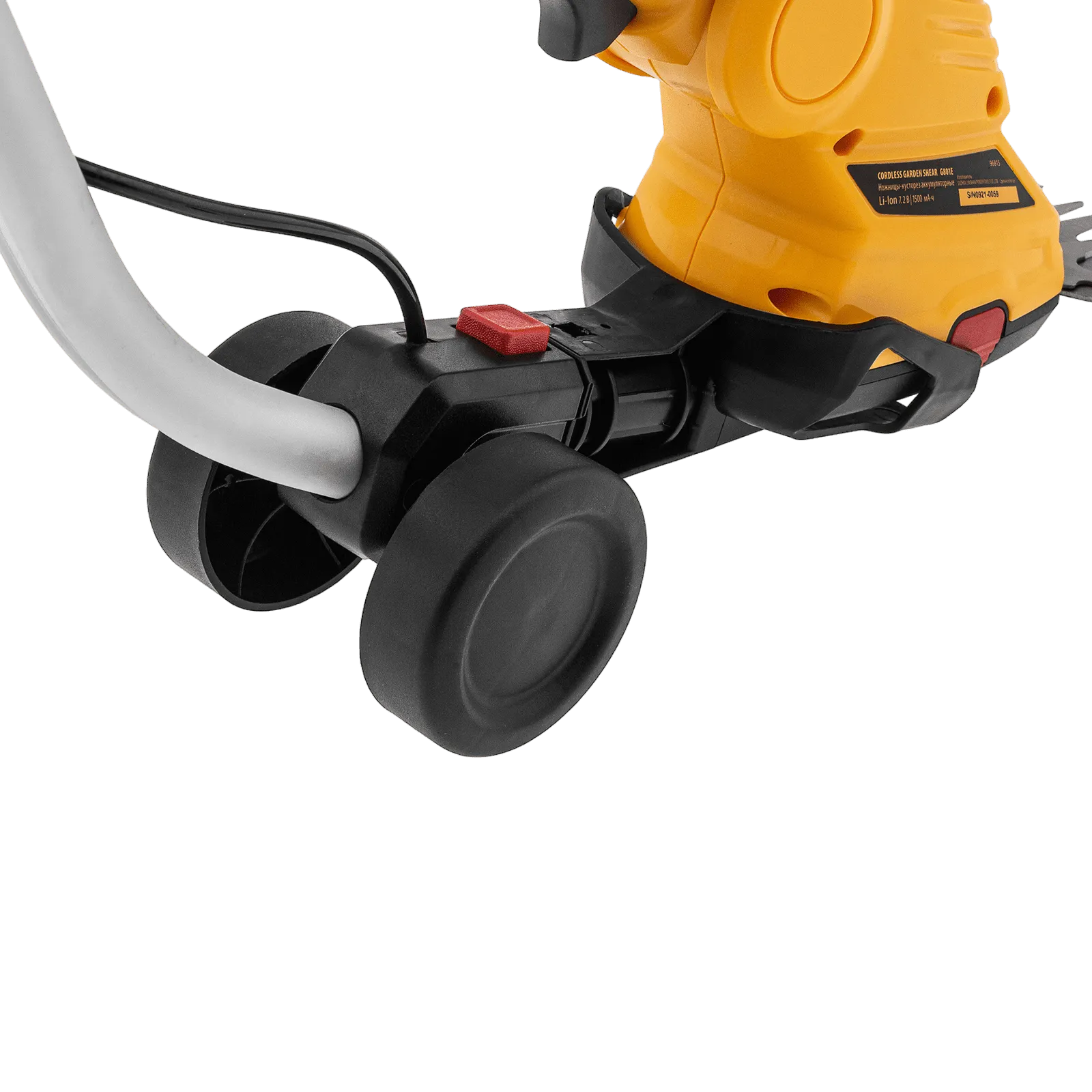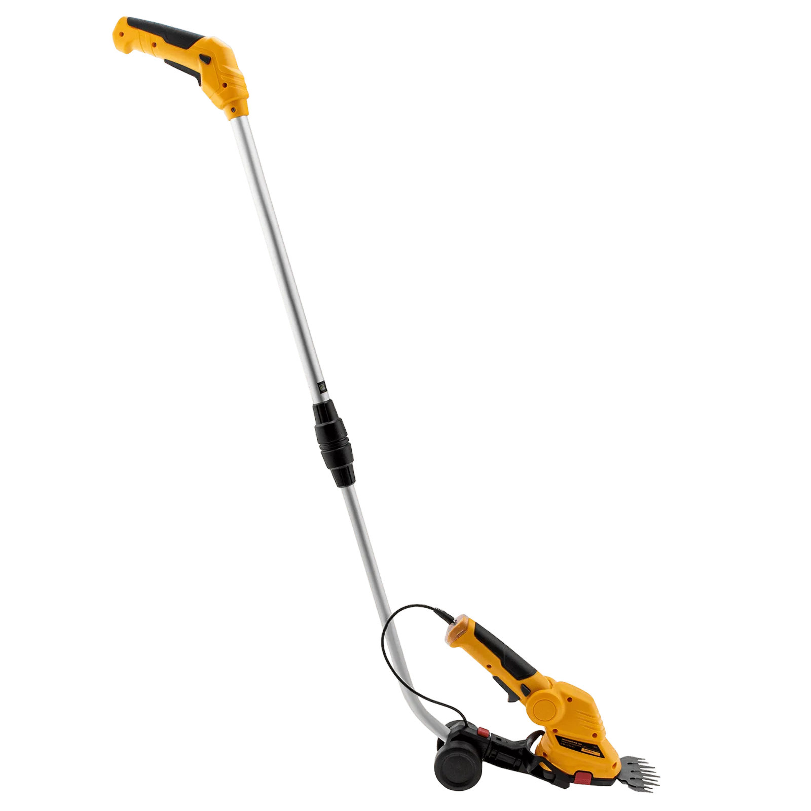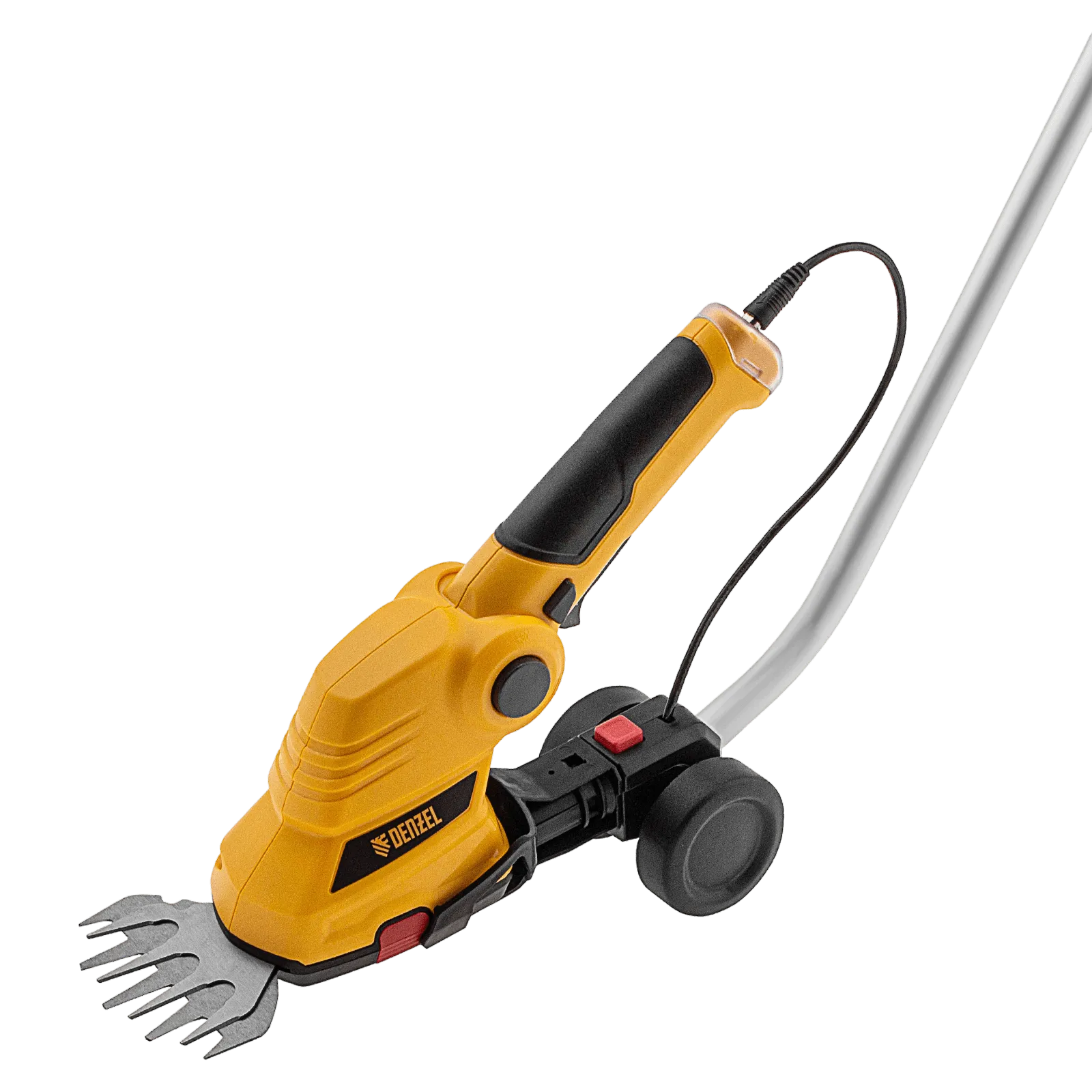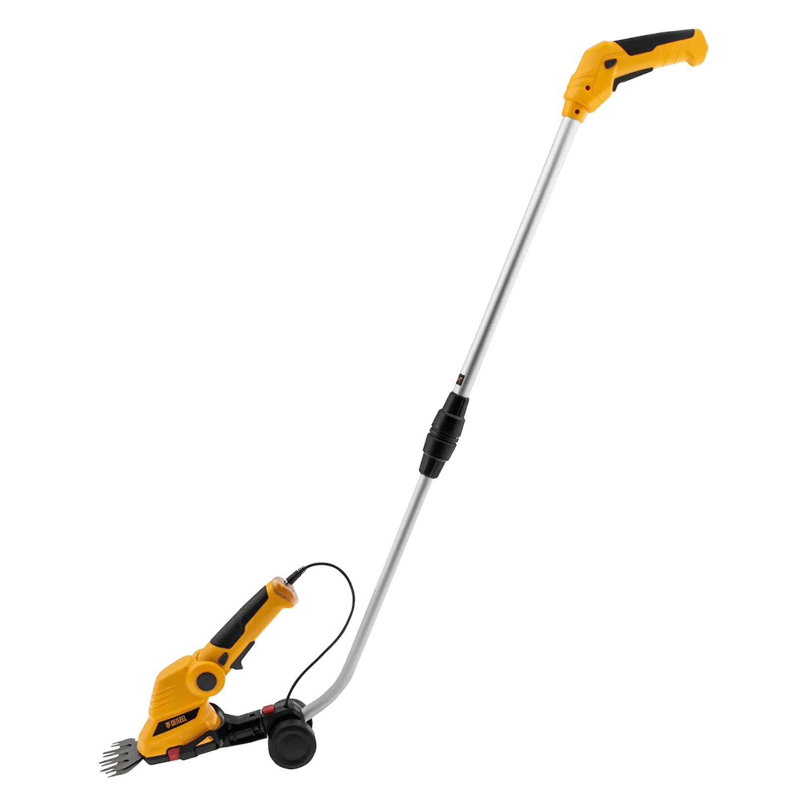Аккумуляторные ножницы-кусторез Denzel G801E 968157 с телескопической штангой, с Li-Ion батареей емкостью 1,5 Ач и напряжением 7,2 В, используются для ухода за садовым участком. Поставляются с двумя насадками: для подрезания газонной травы и для обрезки кустов и тонких веток деревьев. Небольшой вес 1,1 кг и съемная штанга с колесным блоком обеспечивают комфортное использование ножниц-кустореза.