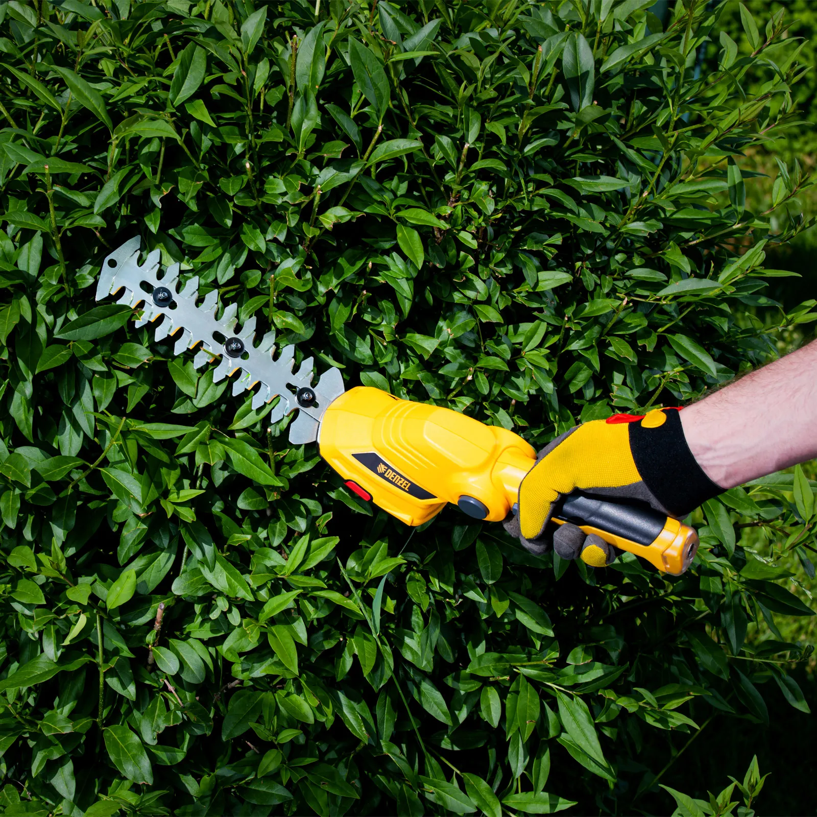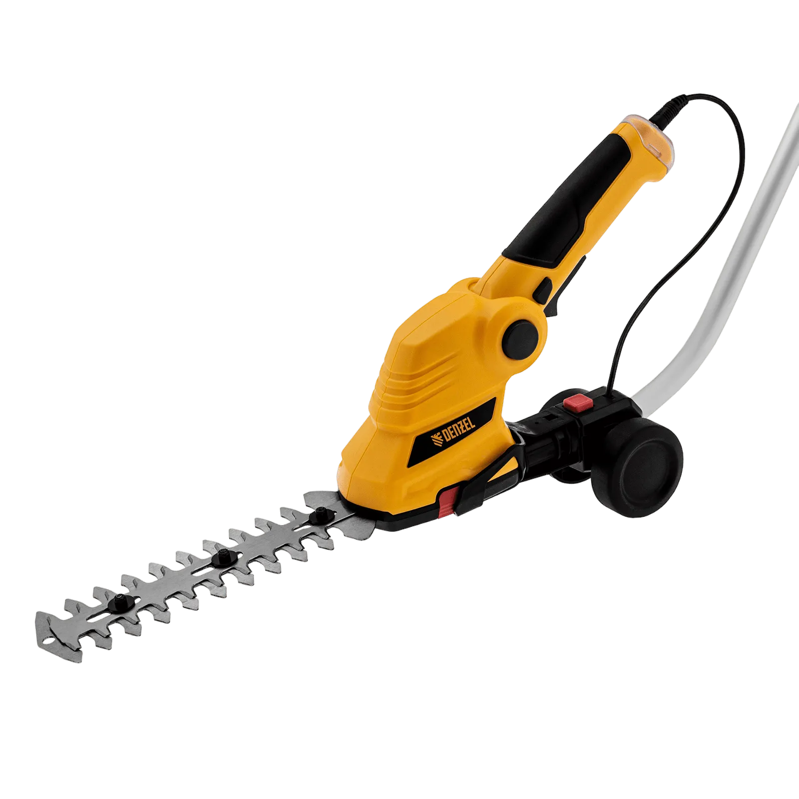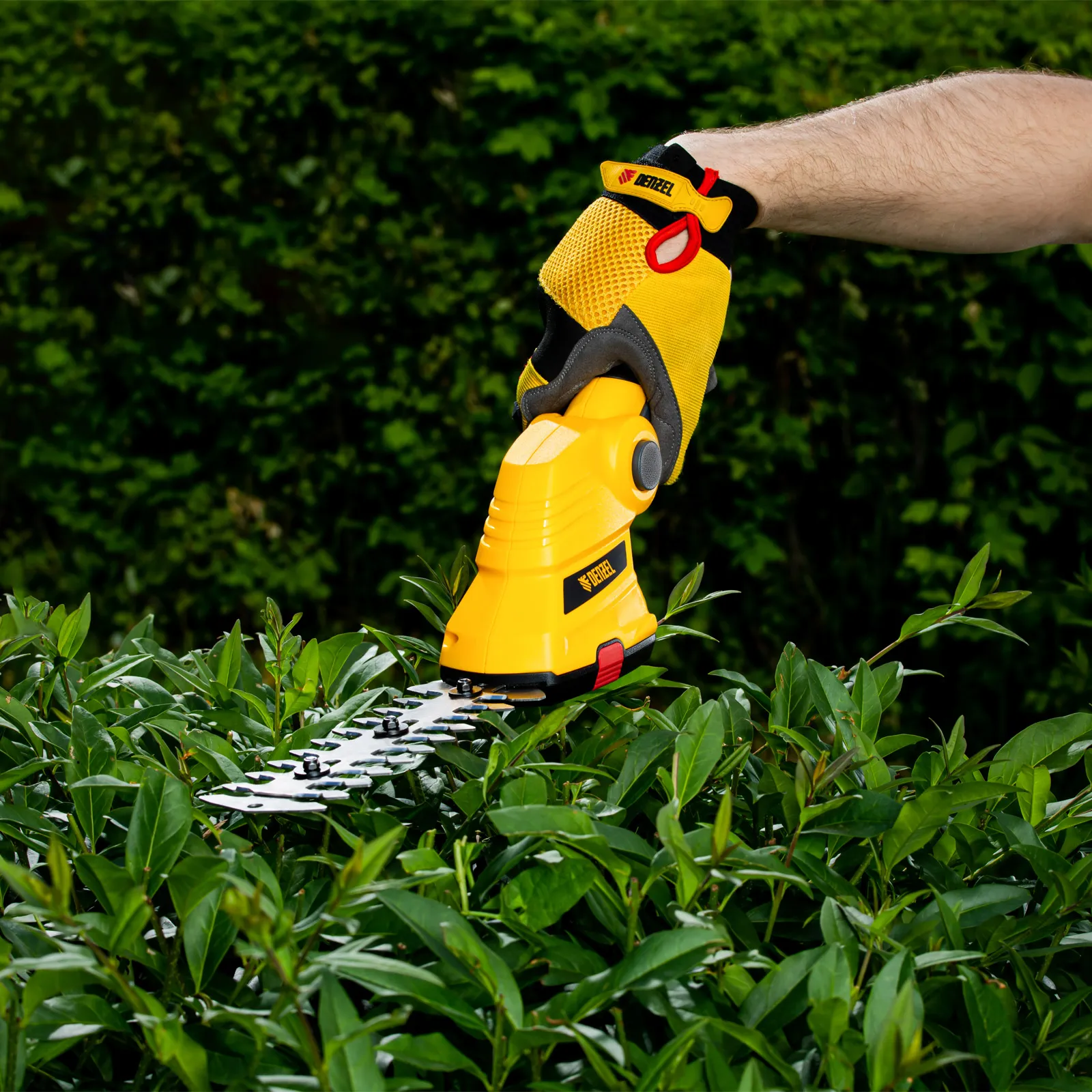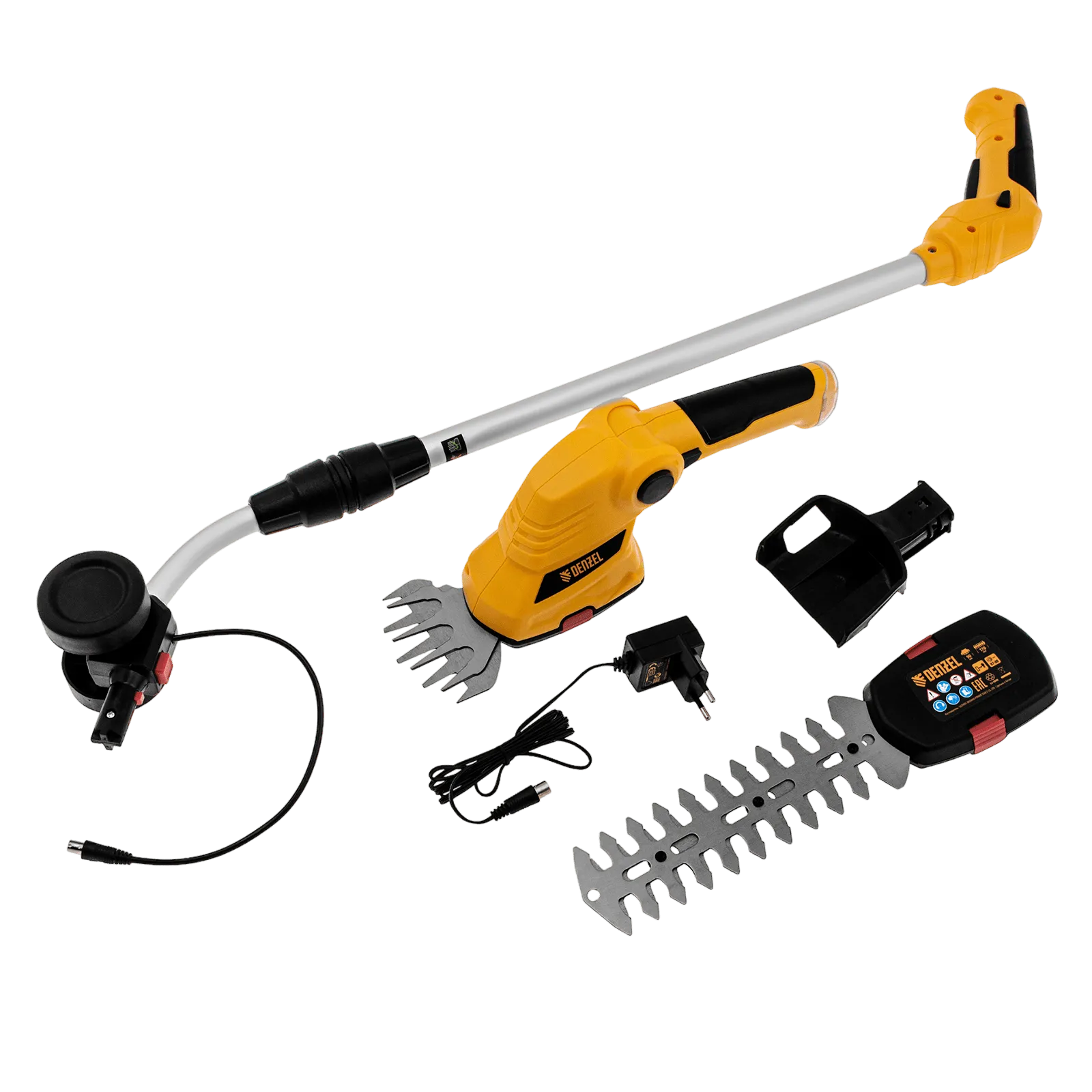 Аккумуляторные ножницы-кусторез Denzel G801E 968157 с телескопической штангой, с Li-Ion батареей емкостью 1,5 Ач и напряжением 7,2 В, используются для ухода за садовым участком. Поставляются с двумя насадками: для подрезания газонной травы и для обрезки кустов и тонких веток деревьев. Небольшой вес 1,1 кг и съемная штанга с колесным блоком обеспечивают комфортное использование ножниц-кустореза.
