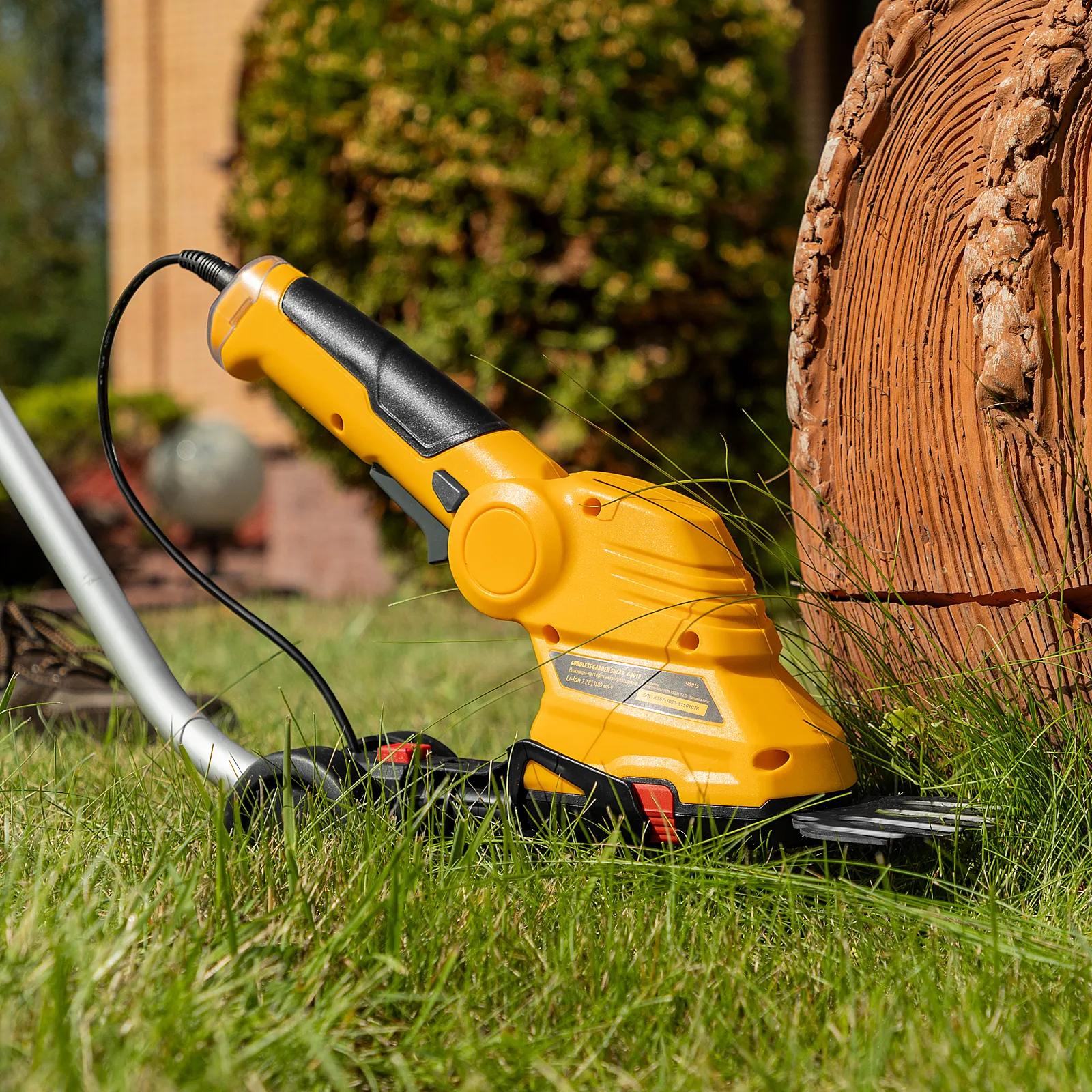 <virtues>Телескопическая ручка, малый вес, продолжительное время работы от зарядки</virtues><limitations>Нет</limitations><comment>Давно женская половина просила приобрести на дачу подобный девайс. Все что смотрел представляло из себя обычные небольшие ножницы с функцией сучкореза. При их использовании все равно приходилось бы наклоняться или сидеть на пятой точке, что мало чем отличалось от работы обычными ножницами по траве. Но когда случайно увидел данные ножницы по такой цене и самое главное с длинной ручкой, купил незамедлительно. На даче мужская половина использует бензиновый и электрический триммера, женская – аккумуляторный триммер. Но данным инструментом не всегда можно добраться до труднодоступных мест, можно испортить, например пластиковый заборчик или случайно скосить красивый цветок. Поэтому для окончательной, так сказать финишной обработки участка приобретение данных ножниц было необходимостью. Поставляется комплект в обычно картонной коробке. Внутри которой находится кроме самих ножниц, две насадки – для травы и обрезки кустов, длинная ручка, колесики и зарядное устройство. Собрать в рабочее состояние данный набор труда не составляет. Устанавливаются колеса, держатель защелкивается к ножницам. И все вместе крепится к телескопической ручке, которую посредством кнопки можно отсоединить и пользоваться ножницами так сказать в ручном режиме на коленках. Для управления ножницами непосредственно с ручки нужно подключить кабель. Сама телескопическая ручка удобная, имеет возможность пусть и ограниченной, но регулировки по высоте. Женщинам ростом примерно 165 см ручка удобна, для моих 178 немного все же коротковата, но даже такая ручка позволяет меньше нагибаться и впоследствии болеть спине. Обе насадки идущие в комплекте смазаны с завода маслом и имеют защитные кожухи для транспортировки и хранения. После работы я думаю будет не лишним их смазать дополнительно для хранения. Замена насадок происходит достаточно легко, отстегиваются они путем нажатия двух красных фиксирующих кнопок. Сначала были сомнения по поводу установленного встроенного аккумулятора. Имея парк инструмента на 18В, обнаружив в данных ножницах аккумулятор на 7.2В был немного расстроен. Но по прошествии работы этим инструментом, могу сказать, что заряда аккумулятора хватает примерно на 40-45 минут работы, что вполне достаточно для приведения в порядок сада. Зарядка осуществляется через гнездо с достаточно интересным разъемом, зарядка длится около 3 часов. На контакте имеется грязезащитный колпачок. Процесс зарядки обозначается красным индикатором. Немного коротковат питающий кабель, если бы был чуть длиннее, удобнее стало бы пользоваться при подключении к розетке. Я остался очень доволен покупкой данных ножниц. Небольшой вес, отличная штанга, достаточное время работы на заряде, все это намного упростило и облегчило работы по поддержания порядка и красоты на даче. Данные ножницы будут отличным приобретением для женщин, они смогут красиво постричь траву вокруг цветников или декоративных заборчиков. Отлично поможет для наведения порядка у забора и фундамента, вокруг декоративных построек на поляне. Читать полностью</comment>