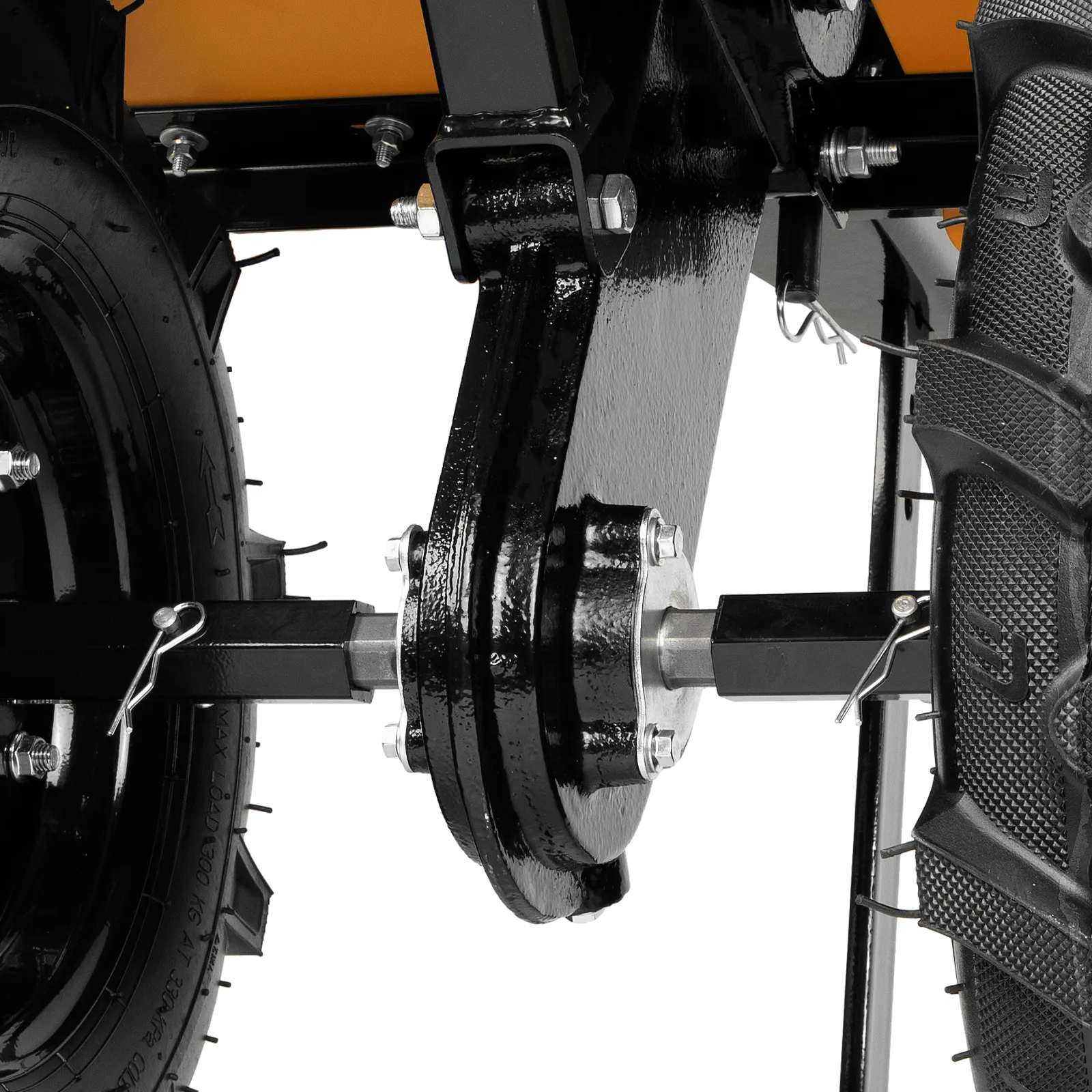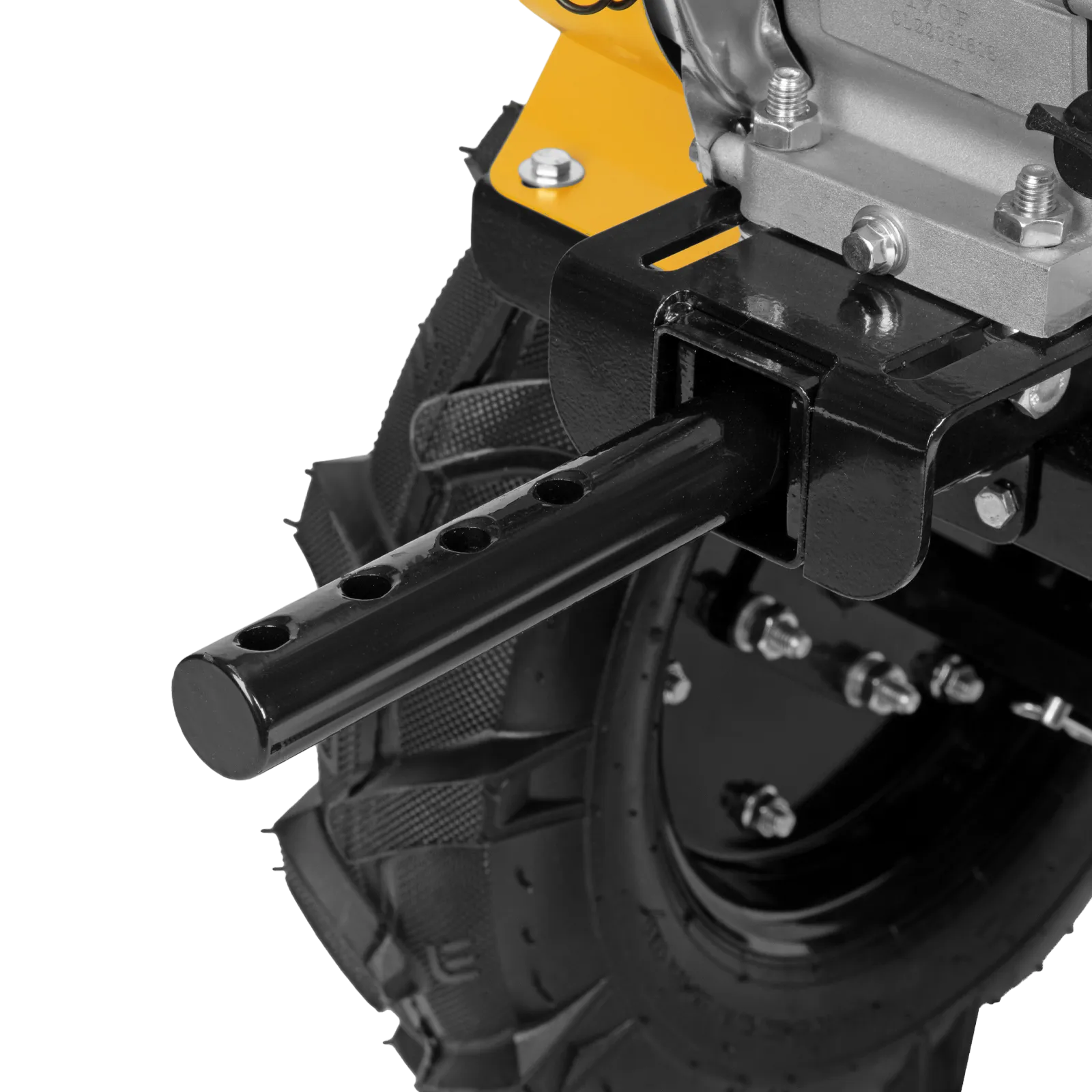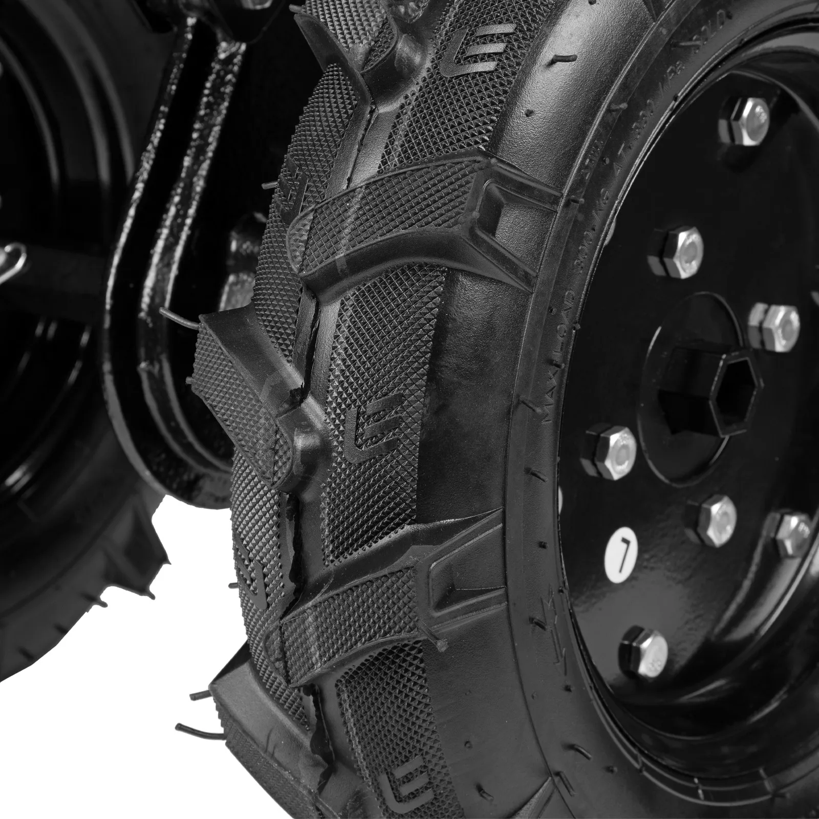 - Свобода движений — большие пневматические колеса входят помогают перевозить мотоблок в нужное место даже по неровной земле и не боятся повреждений.