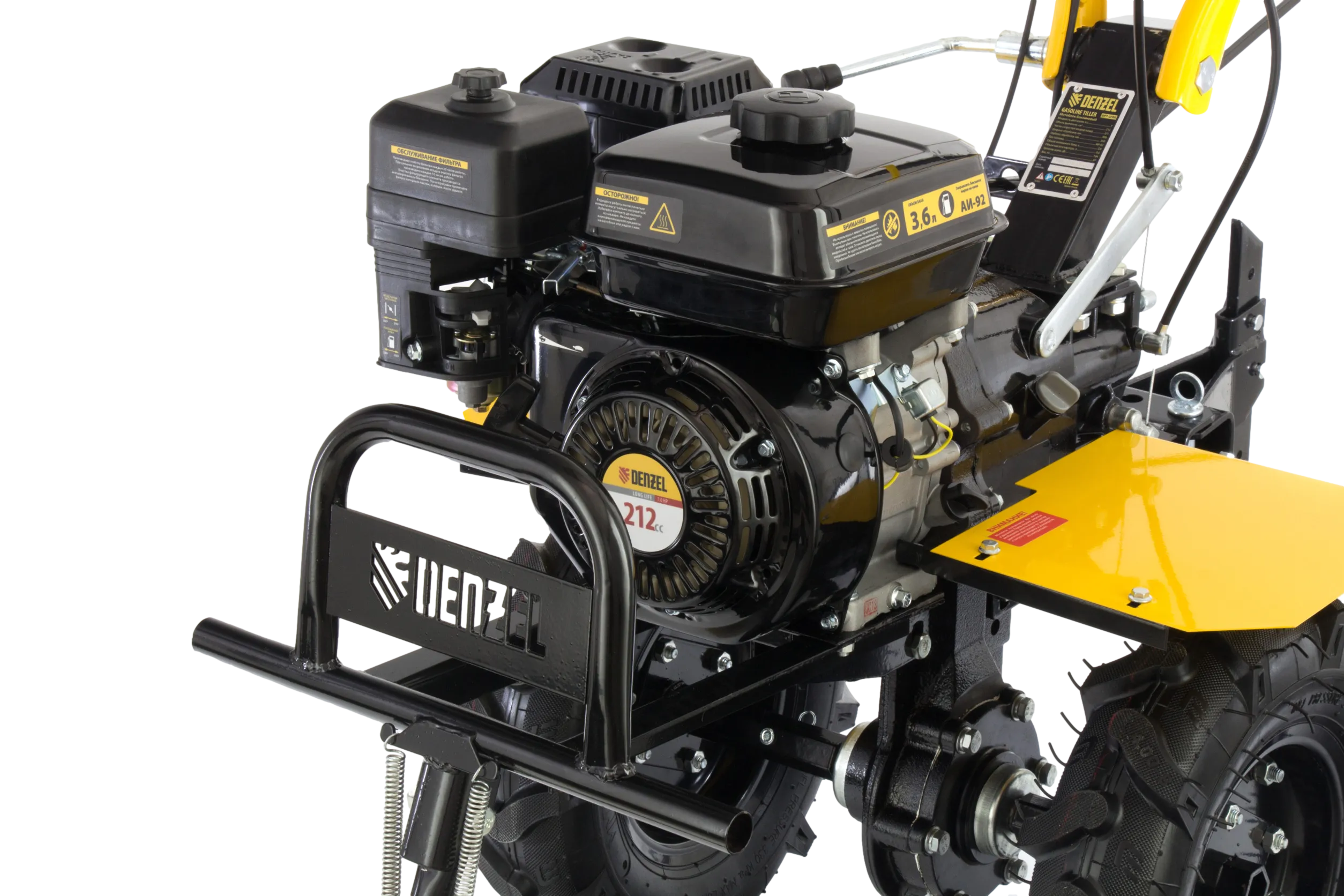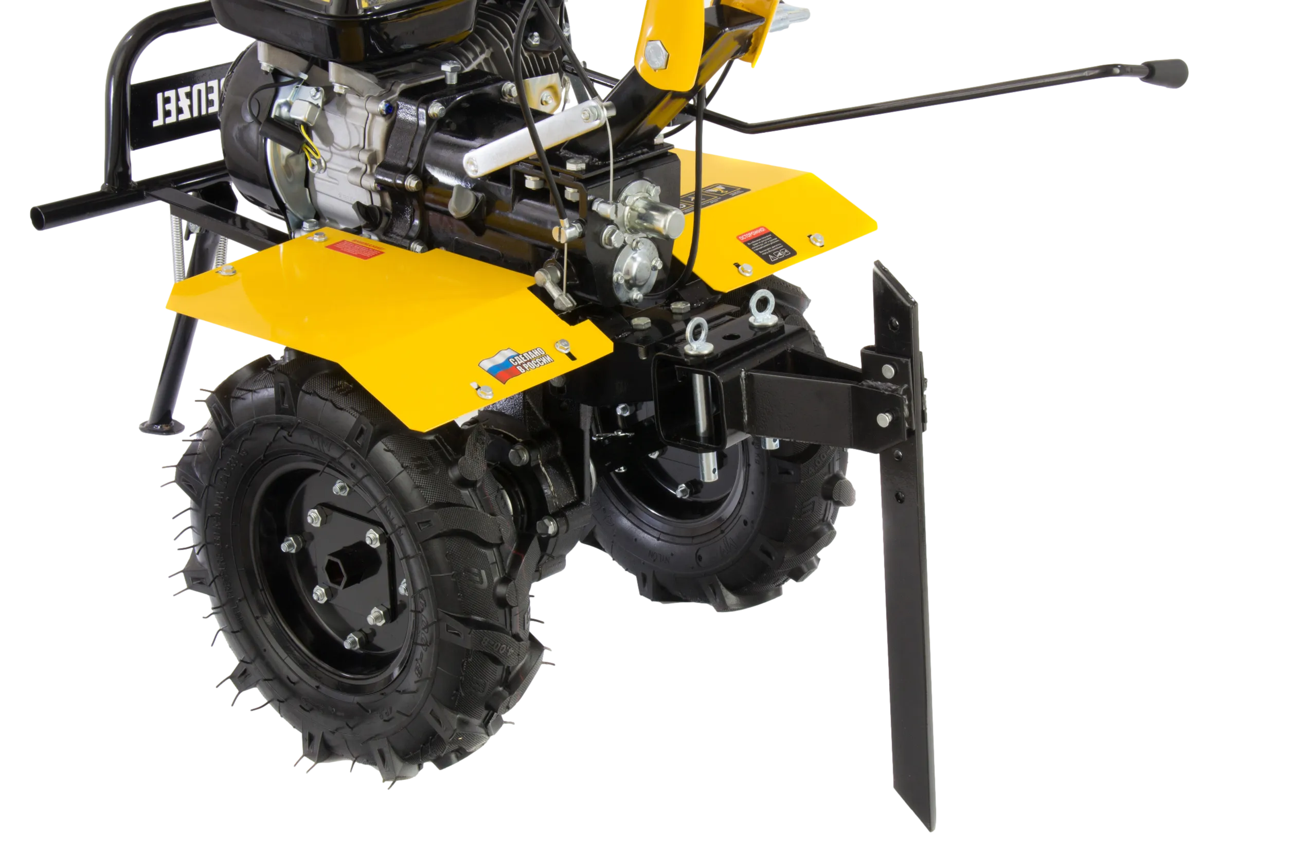 - Комфортная транспортировка — усиленная рукоятка-бампер позволяет с удобством перемещать и загружать мотоблок в транспорт.