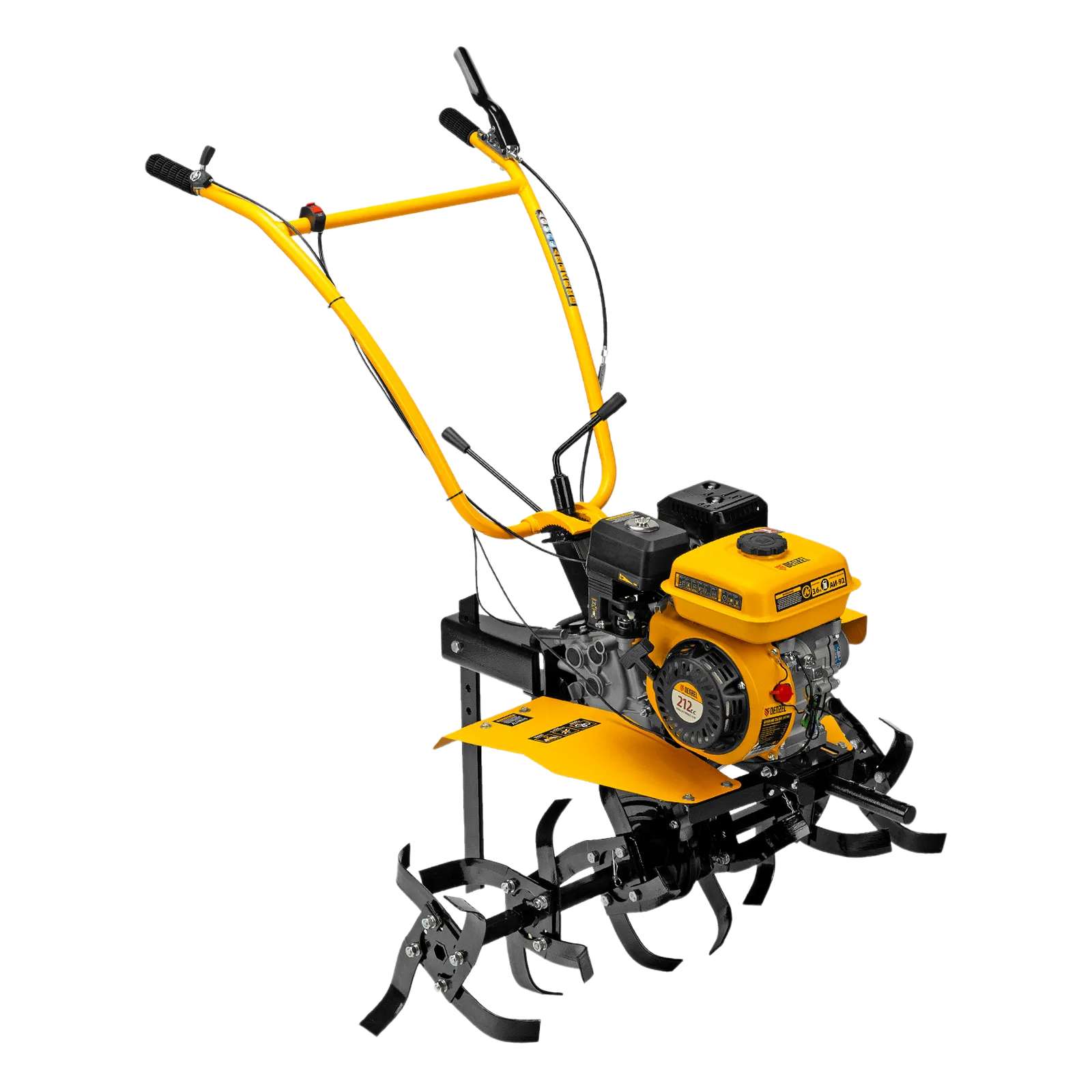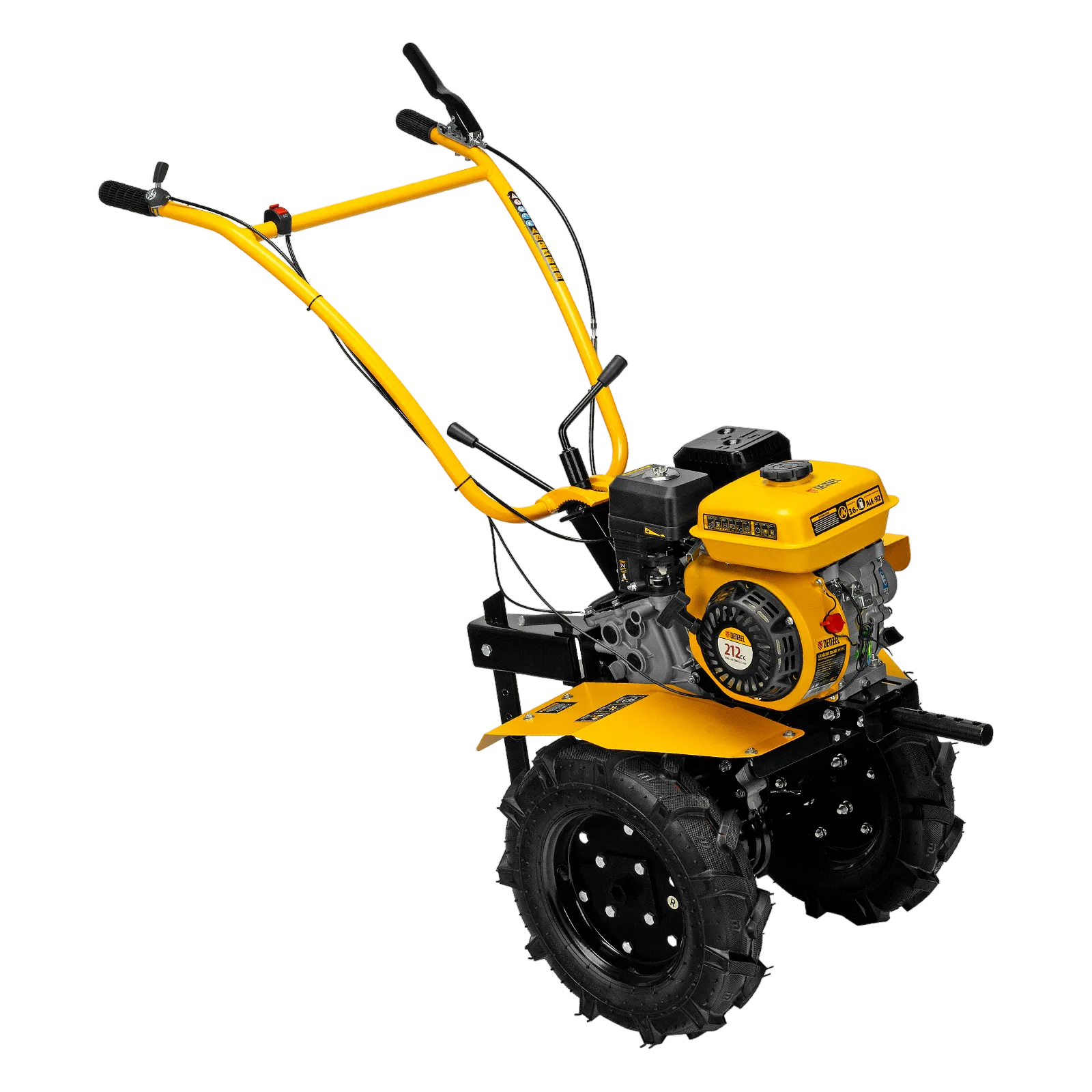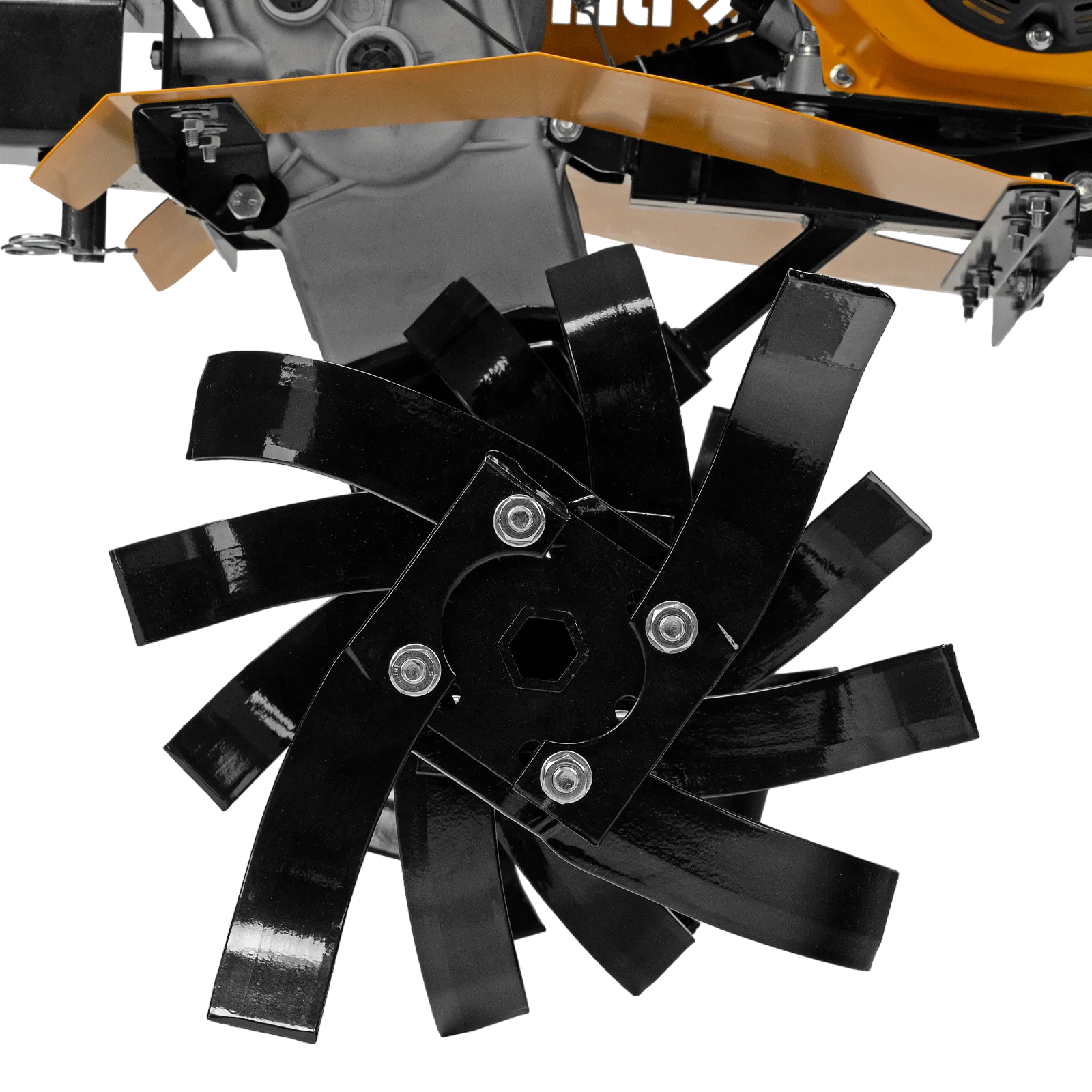 - Эффективная работа — благодаря усиленному шестеренчато-цепному редуктору с алюминиевым корпусом мотоблок успешно справляется даже с плотным, глинистым грунтом.