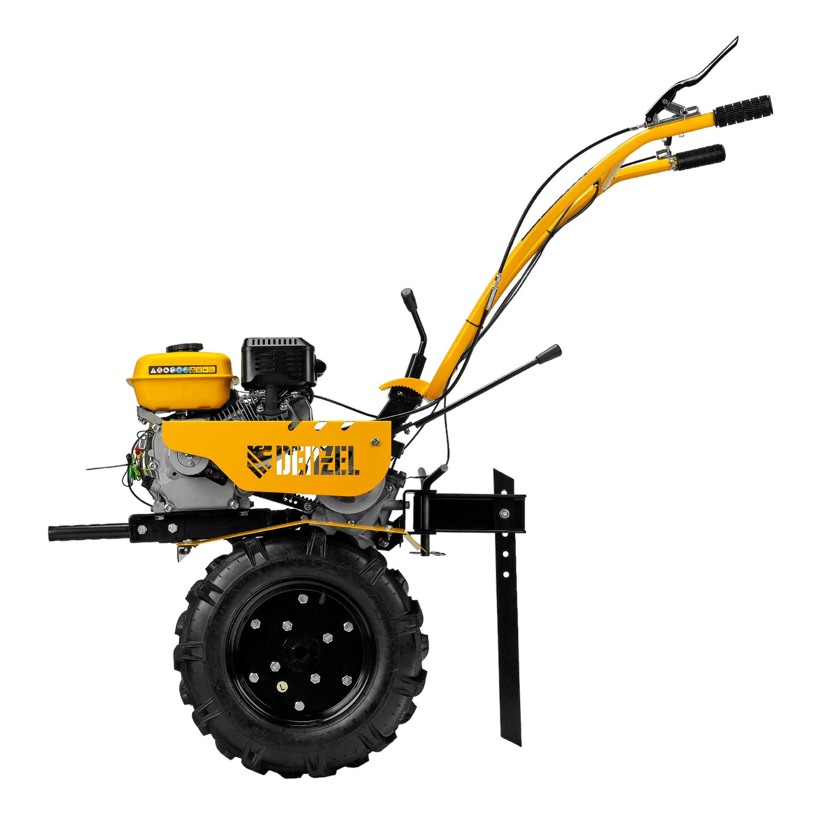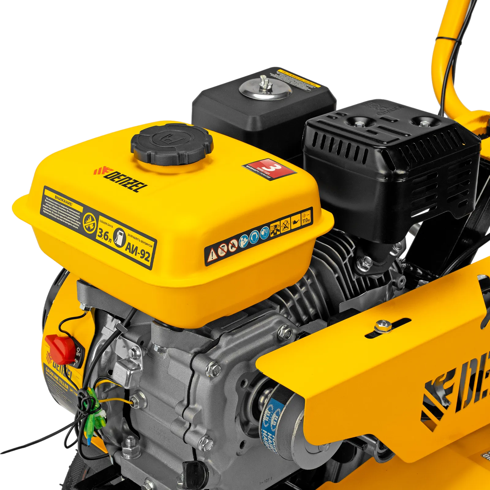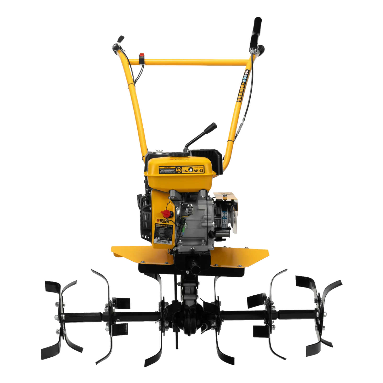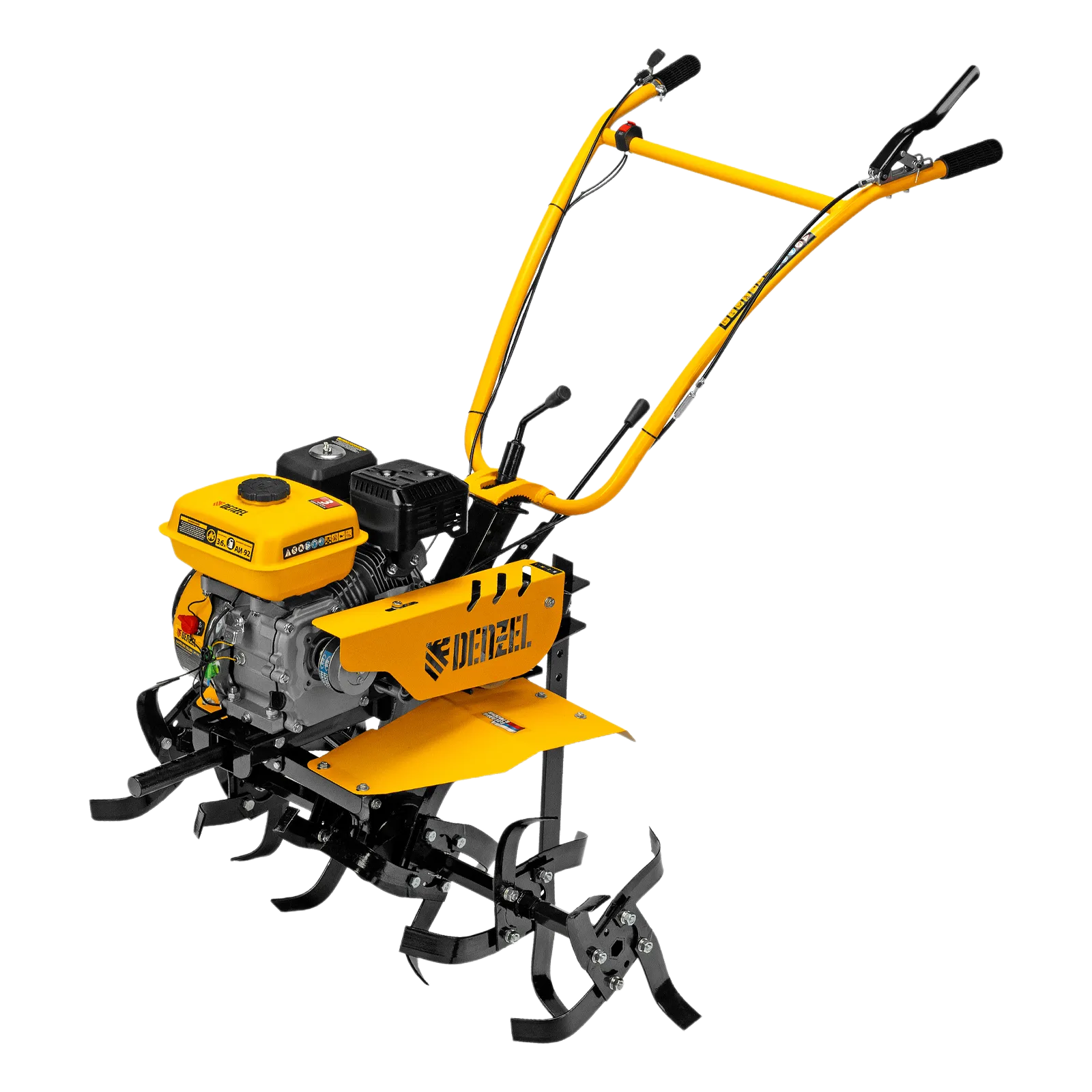 Мотоблок Denzel DPT-170S 56441 с двигателем мощностью 7 л. с., ременным механизмом сцепления, фрезами 3 х 4, шкивом отбора мощности (ШОМ) и коробкой передач 2В/1Н предназначен для проведения сельскохозяйственных работ. Максимальная ширина обработки составляет 1000 мм, глубина — 350 мм. Фрезы собираются из двух двойных и двух одинарных секций, что позволяет регулировать ширину вспашки. ;Шкив отбора мощности и универсальный кронштейн диаметром 30 мм позволяют установить любое навесное оборудование Denzel, например. плуг, окучник, картофелевыкапыватель. Такое решение значительно расширяет возможности мотоблока и позволяет минимизировать расходы на закупку сельскохозяйственной техники.