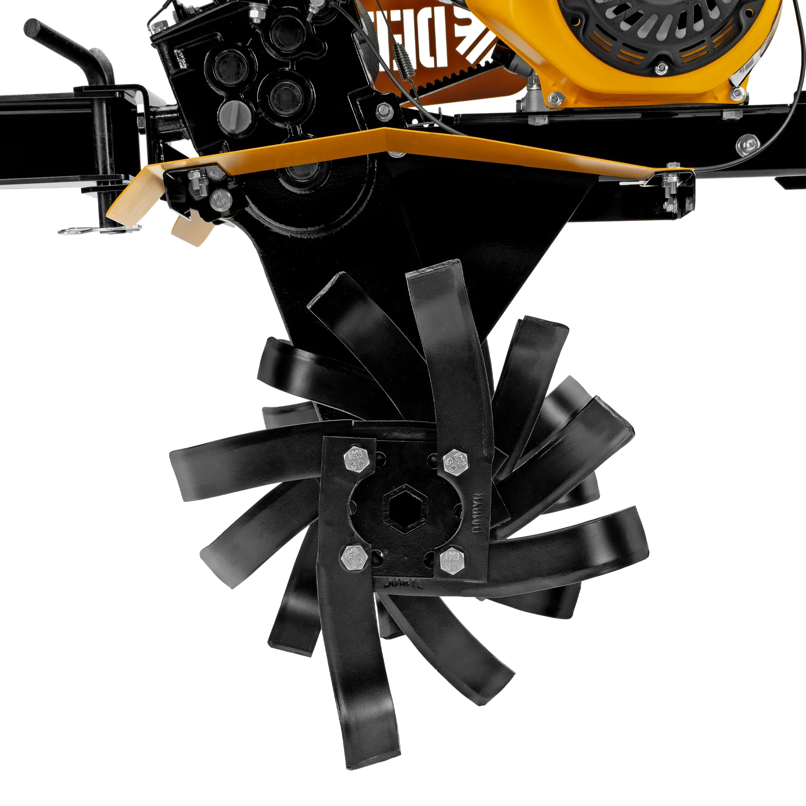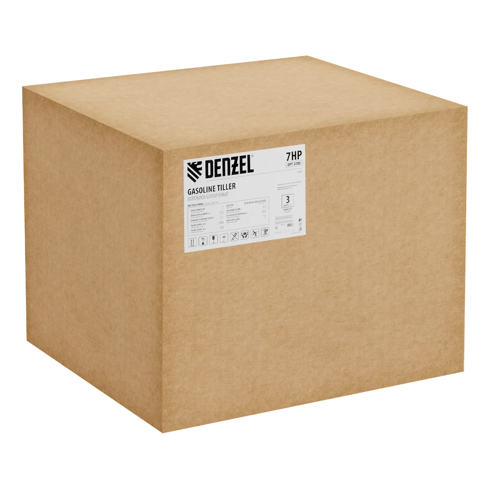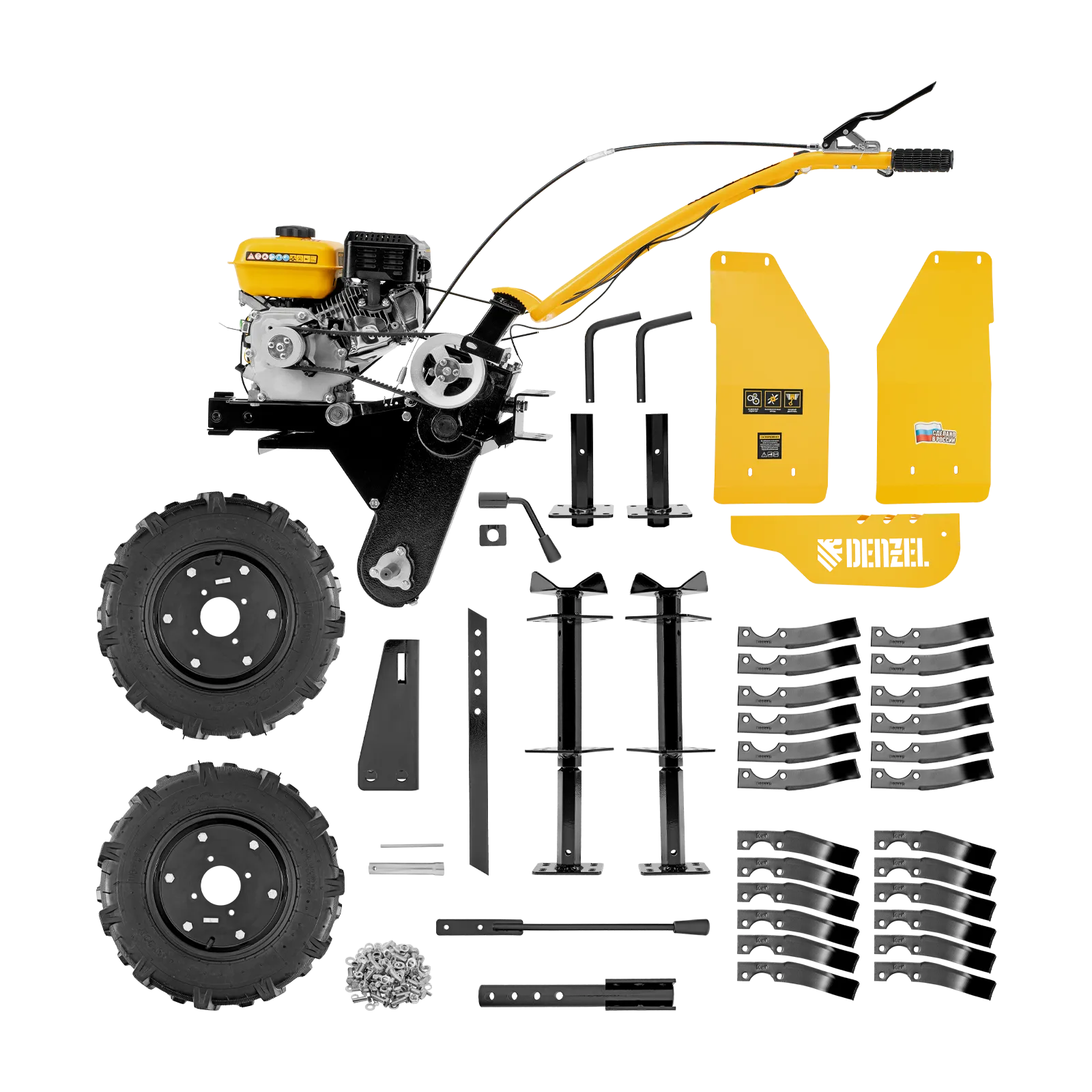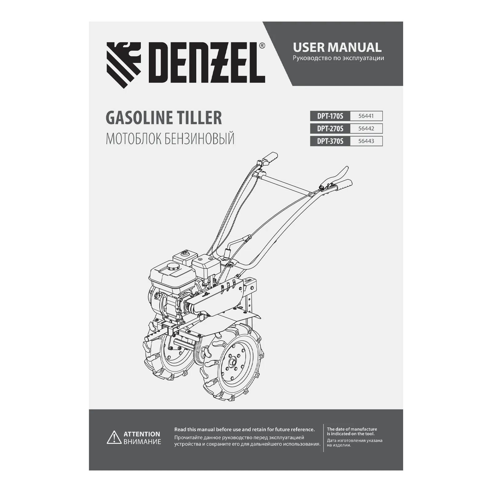Мотоблок Denzel DPT-370S 56443 мощностью 7 л. с., с 24 фрезами (3 х 4 с каждой стороны), шкивом отбора мощности (ШОМ), количеством передач 3 вперед/1 назад, предназначен для рыхления, боронования, выравнивания почвы, прополки и выполнения других сельскохозяйственных работ на огородных и садовых участках при температуре от -15 до +40 ℃. Максимальная ширина обработки достигает 1000 мм, максимальная глубина — 350 мм.