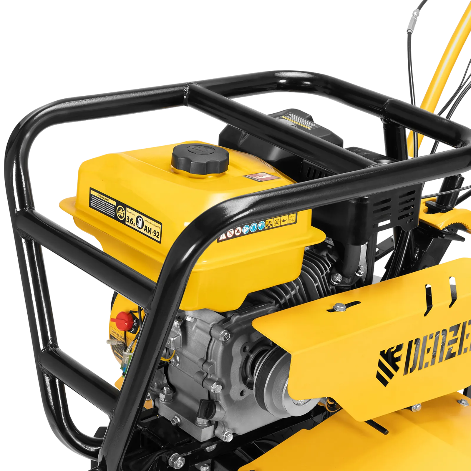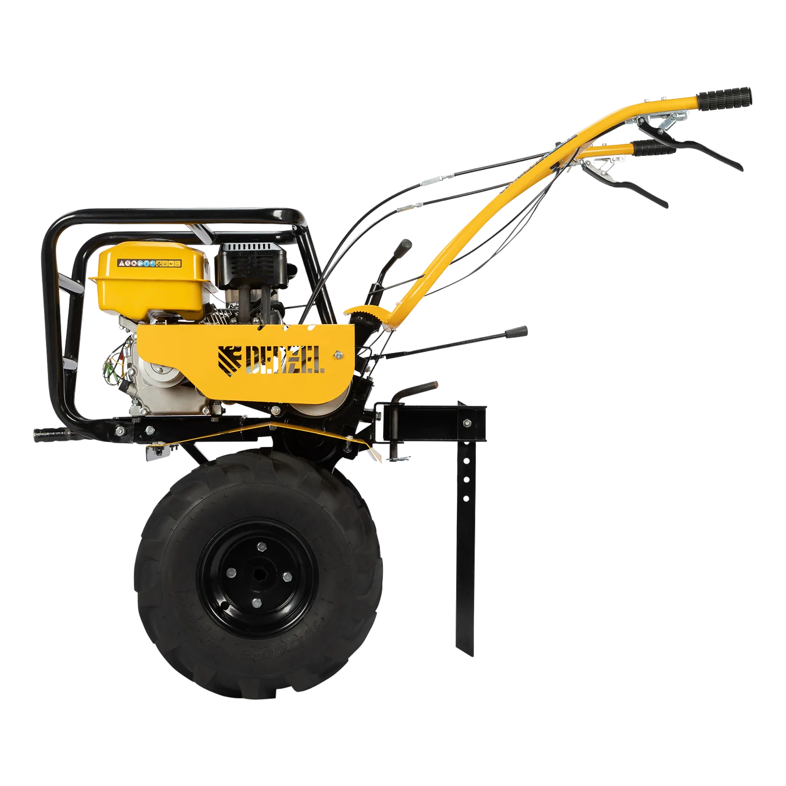 - Возможность использования в качестве транспортного средства — установив прицеп Denzel 59950, можно перемещаться по территории, а также перевозить грузы.