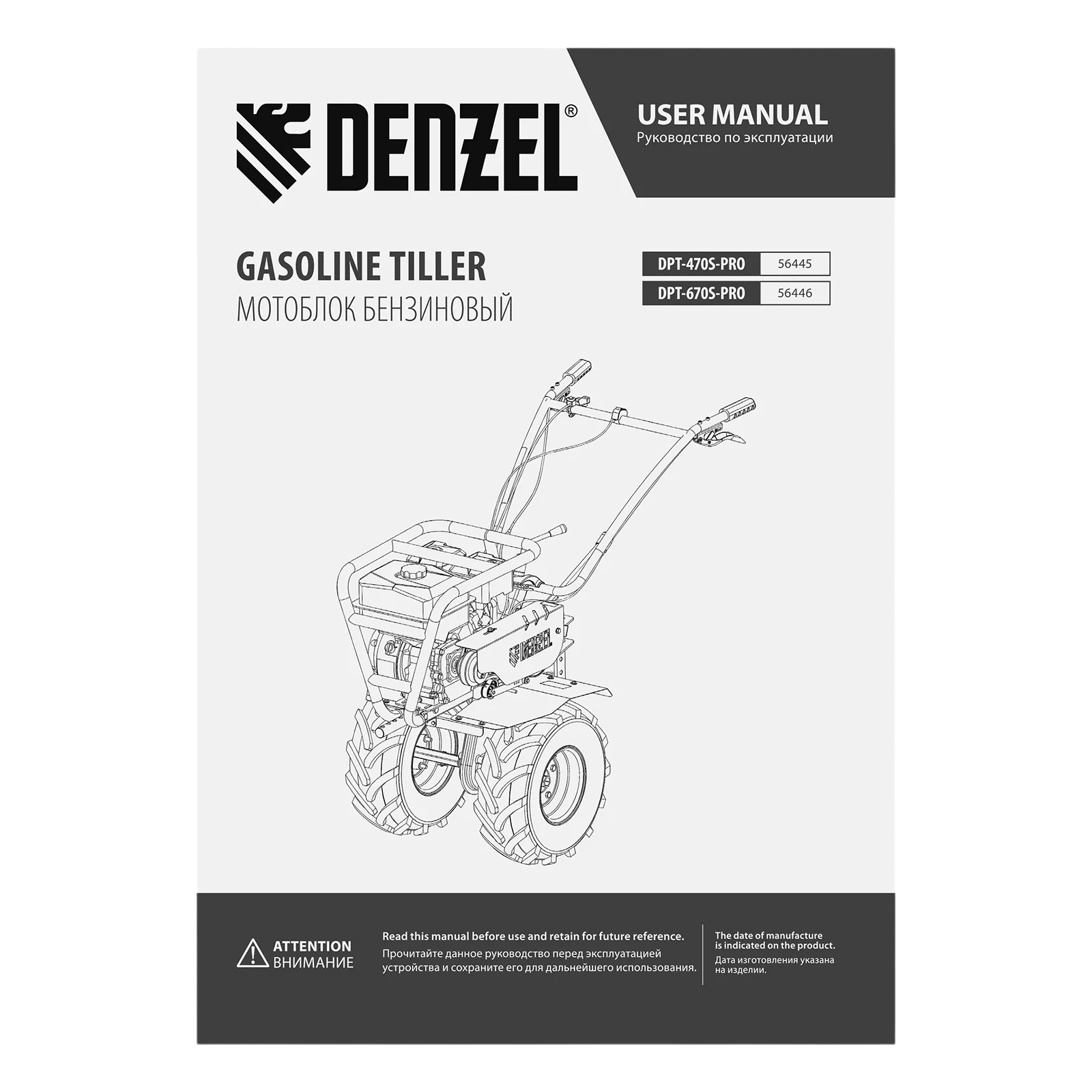 Мотоблок Denzel DPT-670S-PRO 56446 с ременным сцеплением, двигателем объемом 212 см3 и мощностью 7 л.с., с коробкой передач 6 вперед/2 назад и шкивом отбора мощности, комплектуется 24 фрезами (3х4). Предназначен для выполнения земляных работ: прополки, вспахивания, боронования грунта, перевозки грузов и т.д.