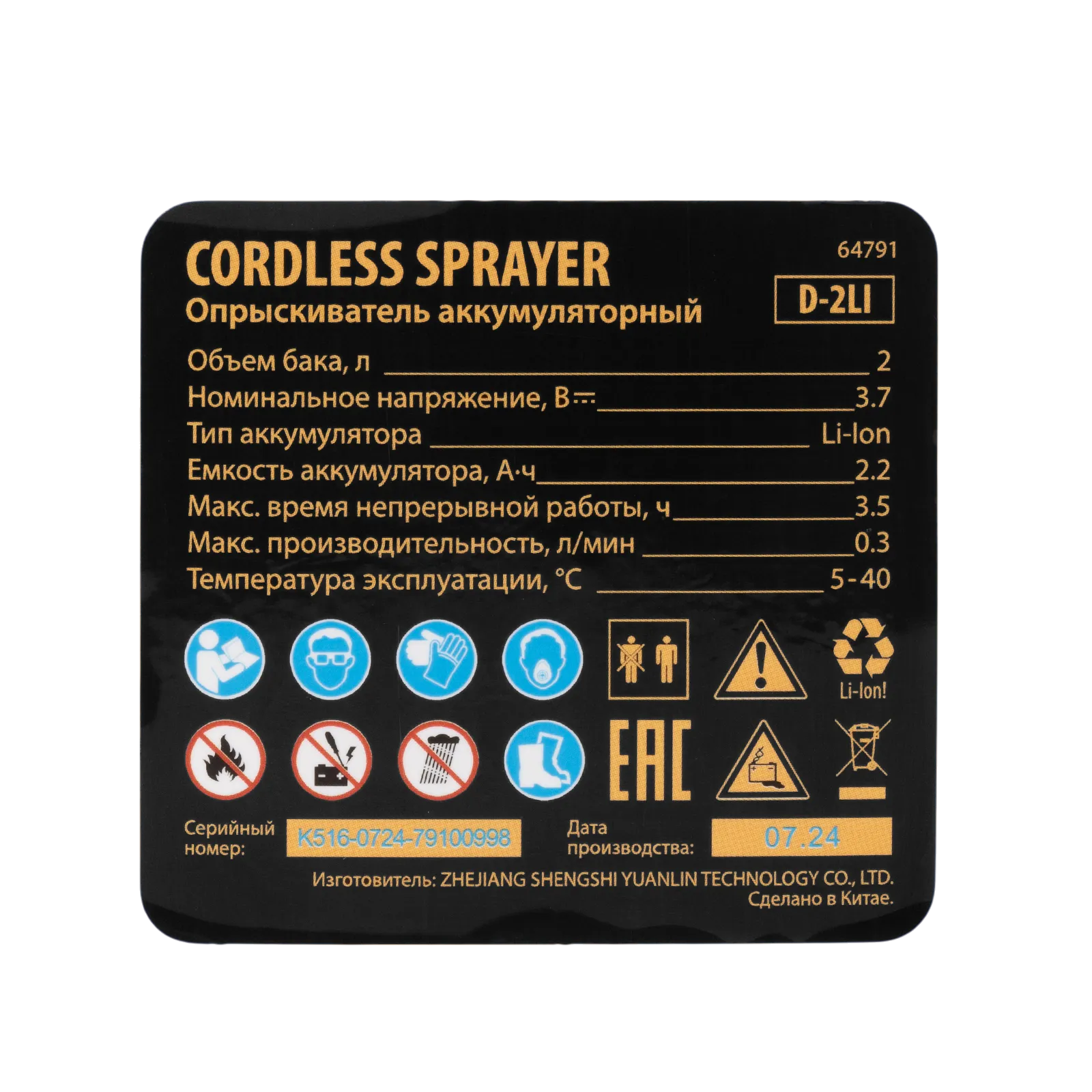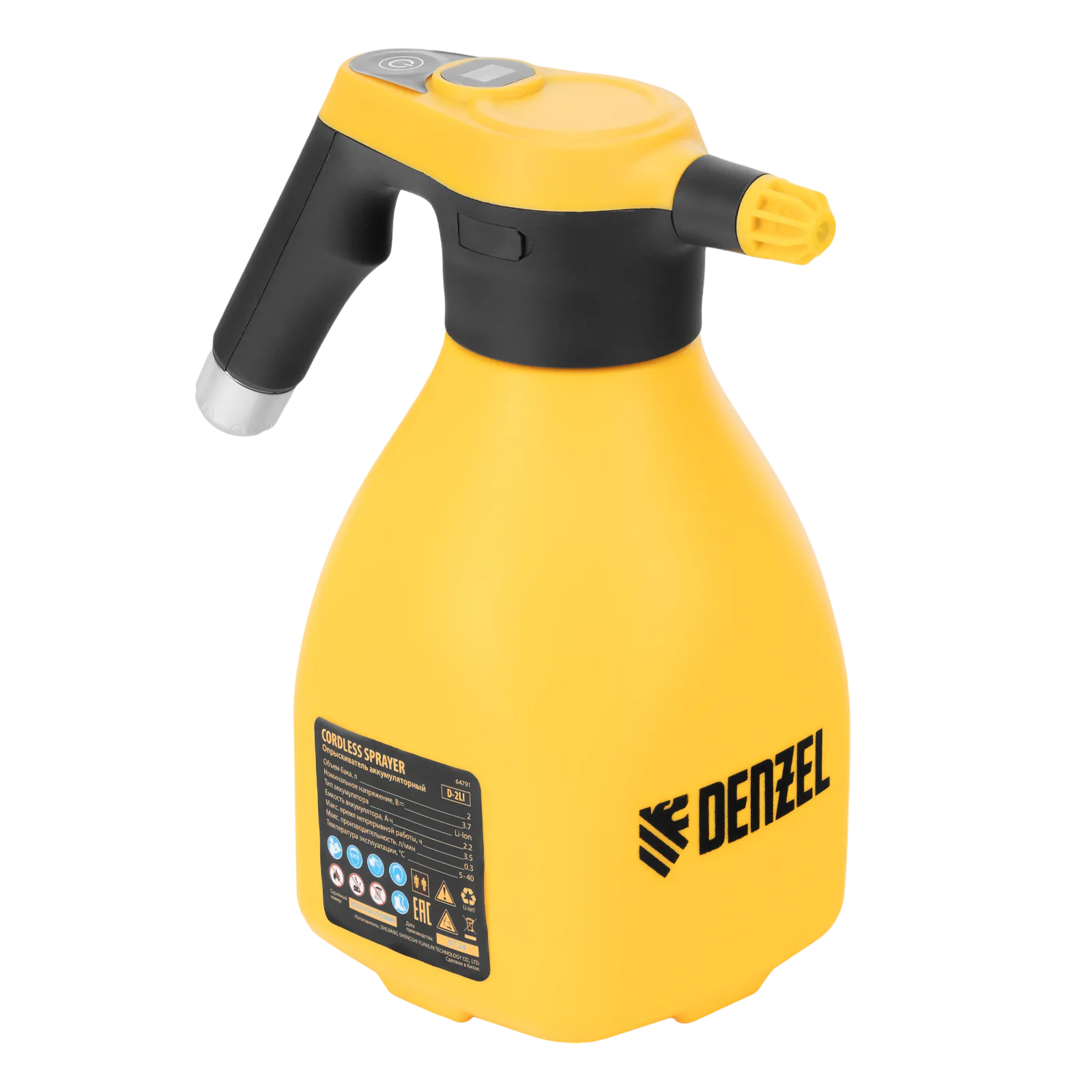 Аккумуляторный опрыскиватель Denzel D-2LI 64791 с баком объемом 2 л и Li-Ion батареей на 3,7 В, емкостью 2,2 А·ч, предназначен для ухода за растениями — внесения жидких удобрений, распыления инсектицидных средств. Также может использоваться для мытья окон, фасадов, дорожек, садового инвентаря. Размер и форма факела регулируются, максимальная дальность распыления составляет 1 м, что позволяет обрабатывать участки различной площади и удаленные места. Опрыскиватель экономит силы и время пользователя, будет полезен в быту и на производстве.