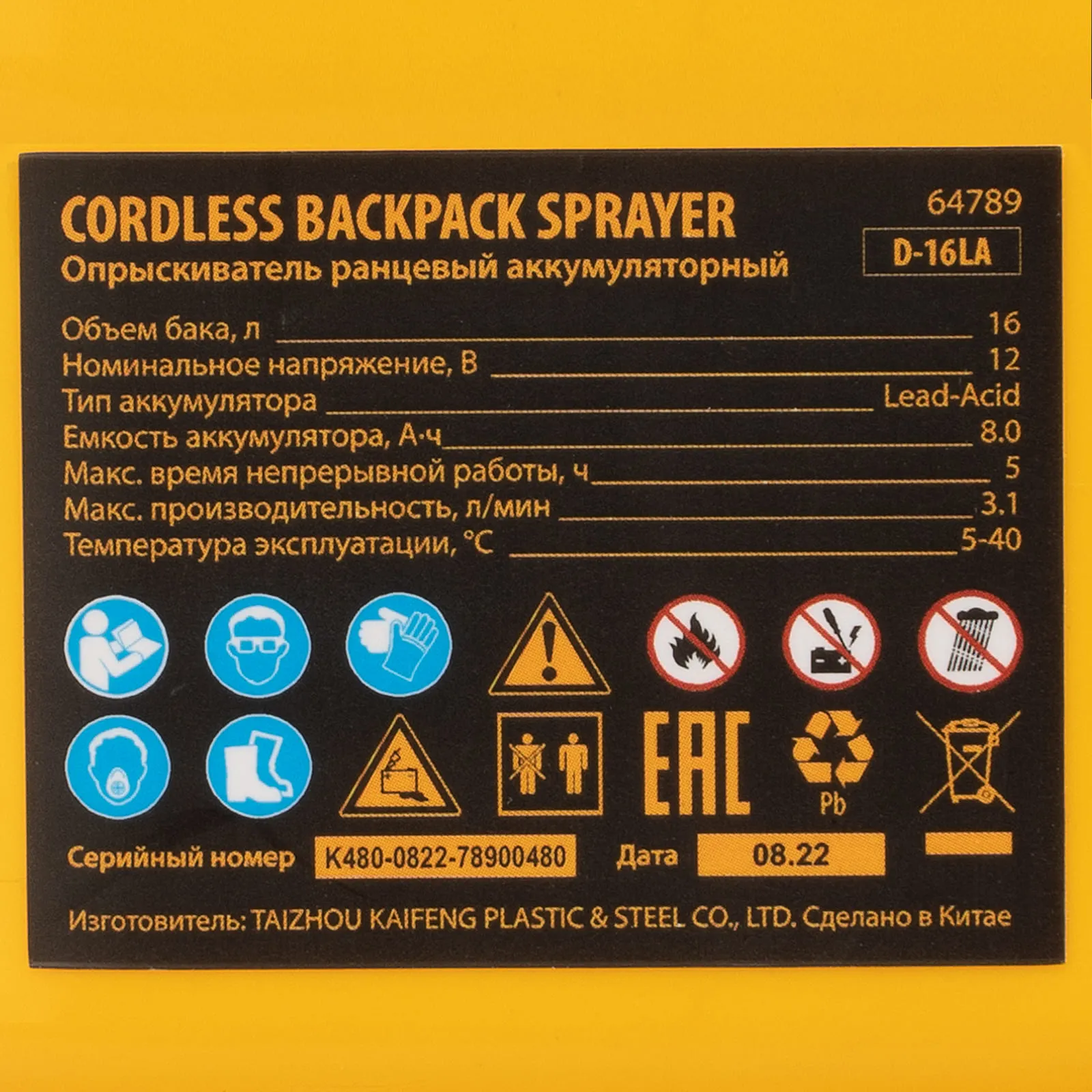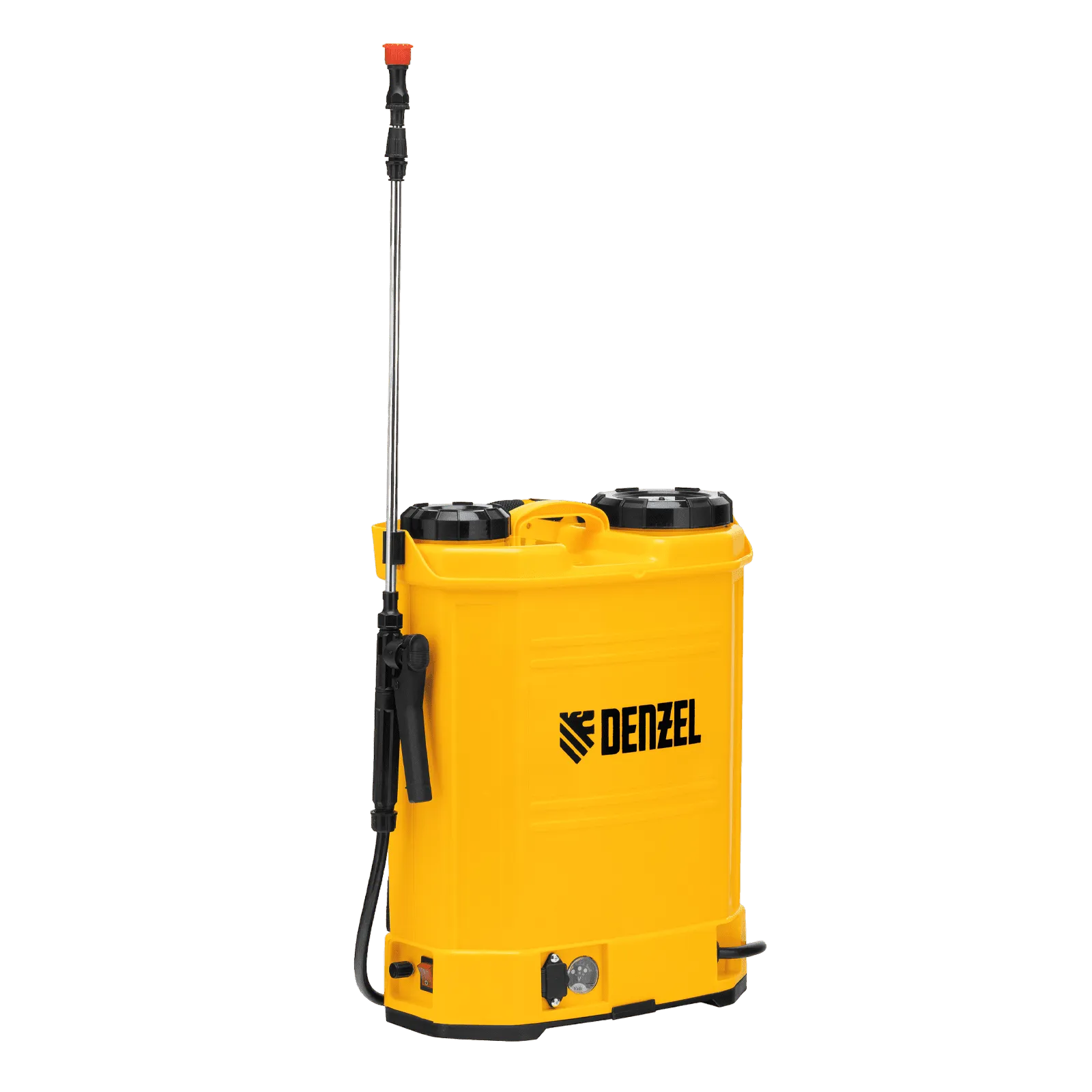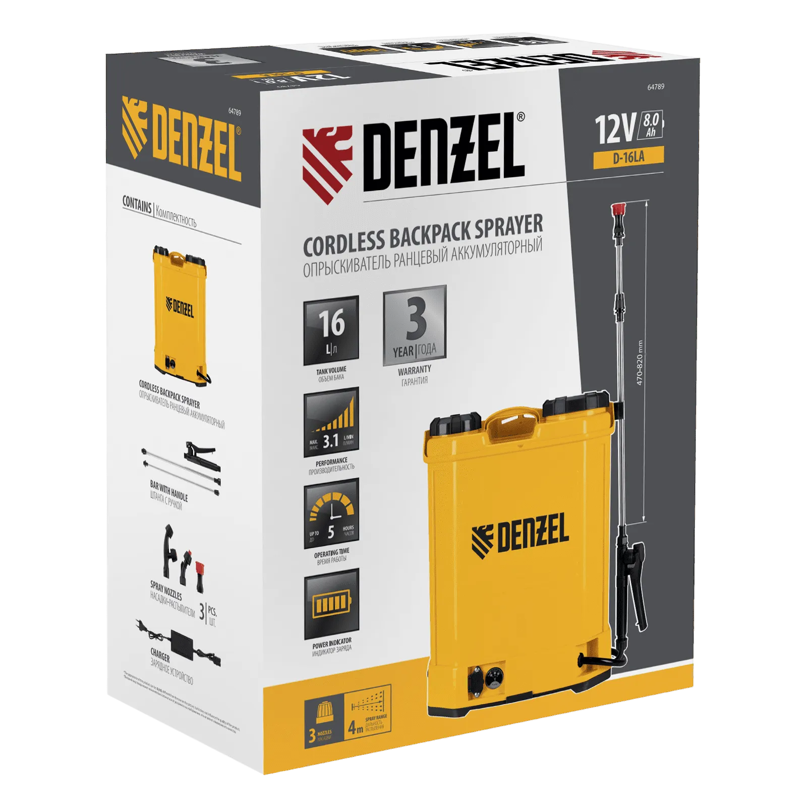 Ранцевый аккумуляторный опрыскиватель Denzel D-16LA 64789 с баком объемом 16 л и батареей на 12 В, емкостью 8 Ач, предназначен для распыления воды или инсектицидов. Используется для ухода за растениями, дезинфекции помещения, мытья окон и фасадов. Длина штанги регулируется в диапазоне 470-820 мм, а максимальная дальность распыления составляет 4 м, что облегчает обработку труднодоступных мест.