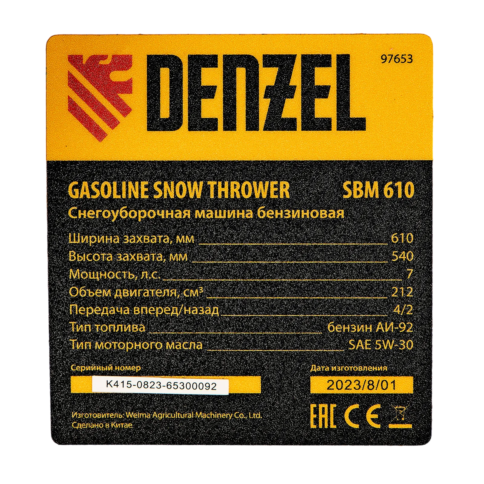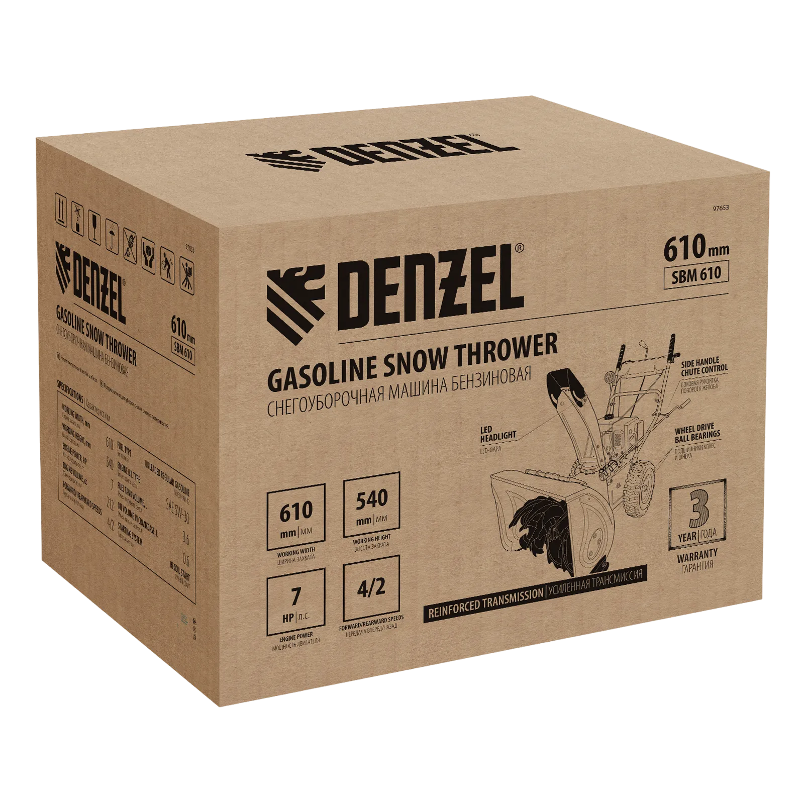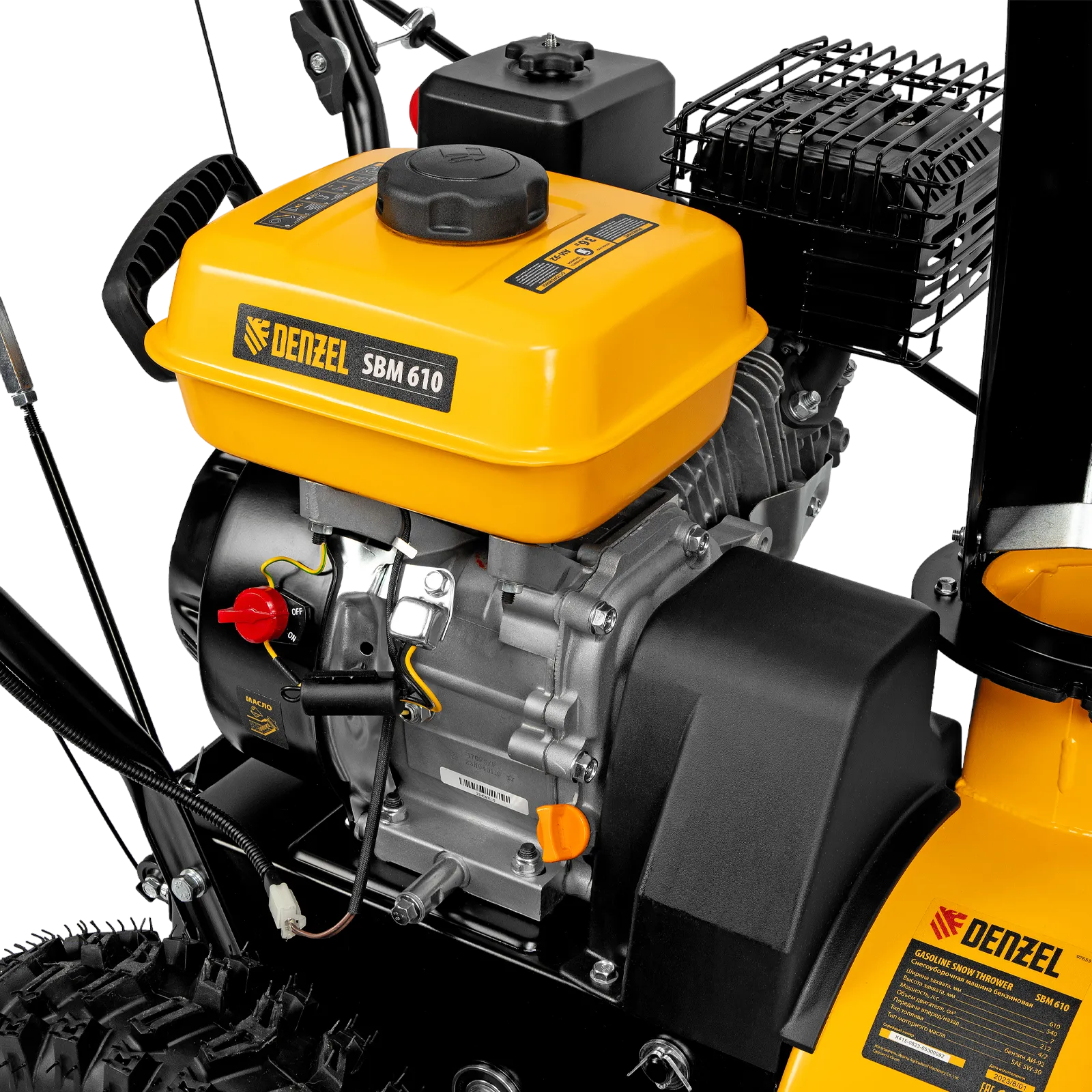 Бензиновая снегоуборочная машина Denzel SBM 610 97653 с двигателем объемом 212 cм3, ручным стартом и фарой предназначена для уборки территорий загородных домов, коттеджей, подъездных дорог и улиц СНТ, парковок и городских дворовых территорий.