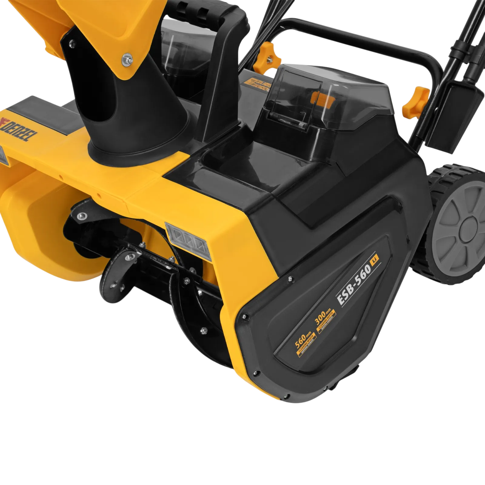 Аккумуляторная снегоуборочная машина Denzel ESB-560Li 97639 с металлическим шнеком и зарядным устройством (ЗУ) в комплекте работает от 2 аккумуляторов 5 А·ч суммарным напряжением 40 В и обеспечивает ширину захвата 560 мм. Дальность выброса снега регулируется при помощи дефлектора и достигает 8 м. Машина не зависит от наличия розетки, что позволяет работать даже на удаленных участках. Снегоуборщик поможет расчистить тротуар, дорожку на дачном участке, площадку перед гаражом или другую небольшую ровную территорию.