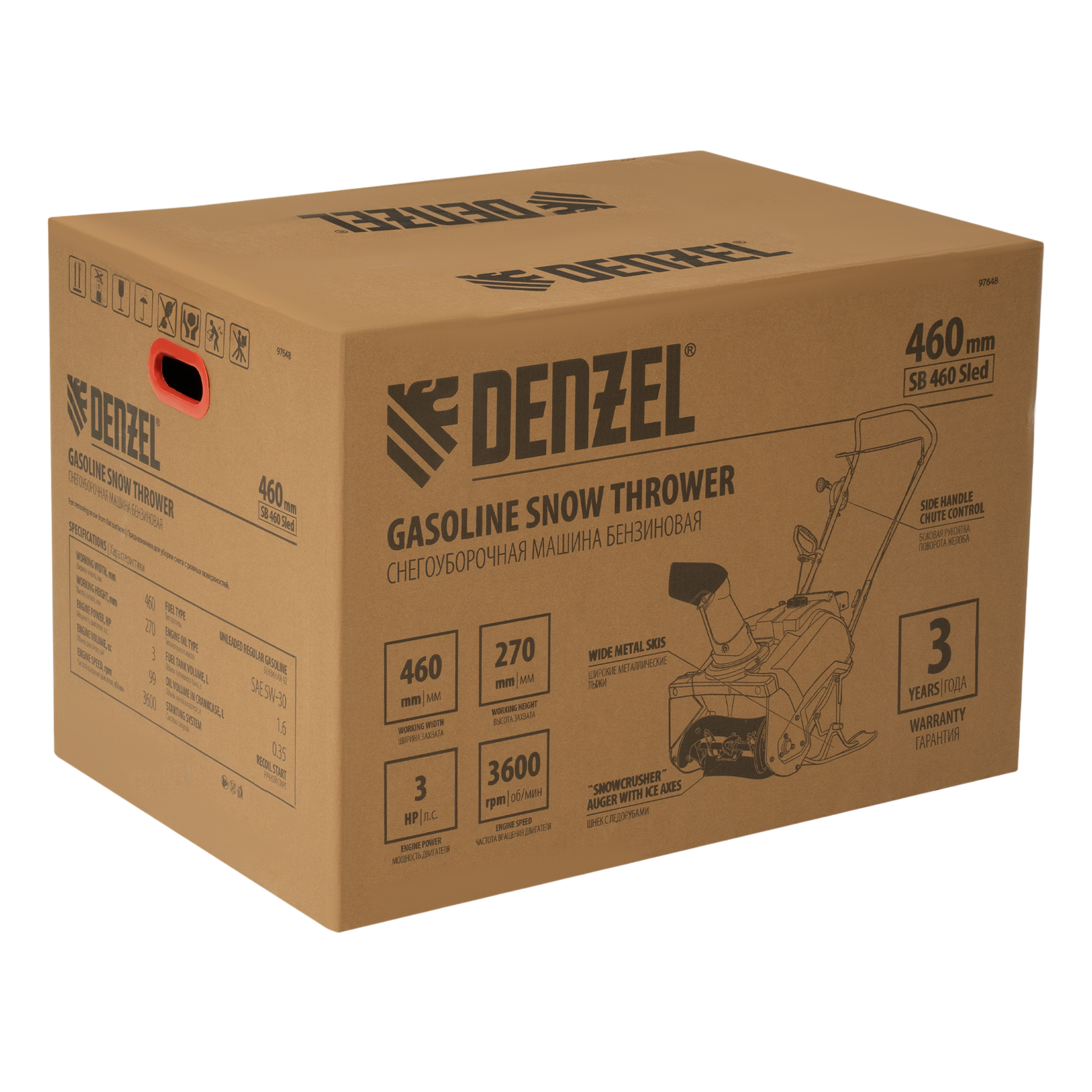 Бензиновая снегоуборочная машина Denzel SB 460 Sled 97648 с двигателем объемом 99 см3, лыжами и ручным стартом, предназначена для работы на открытых ровных поверхностях. Высота захвата составляет 270 мм, ширина — 460 мм, дальность выброса снега достигает 10 м. Машина позволяет быстро и эффективно очистить придомовую территорию, дорожку, тротуар, автомобильную парковку, площадку перед гаражом и т.д.