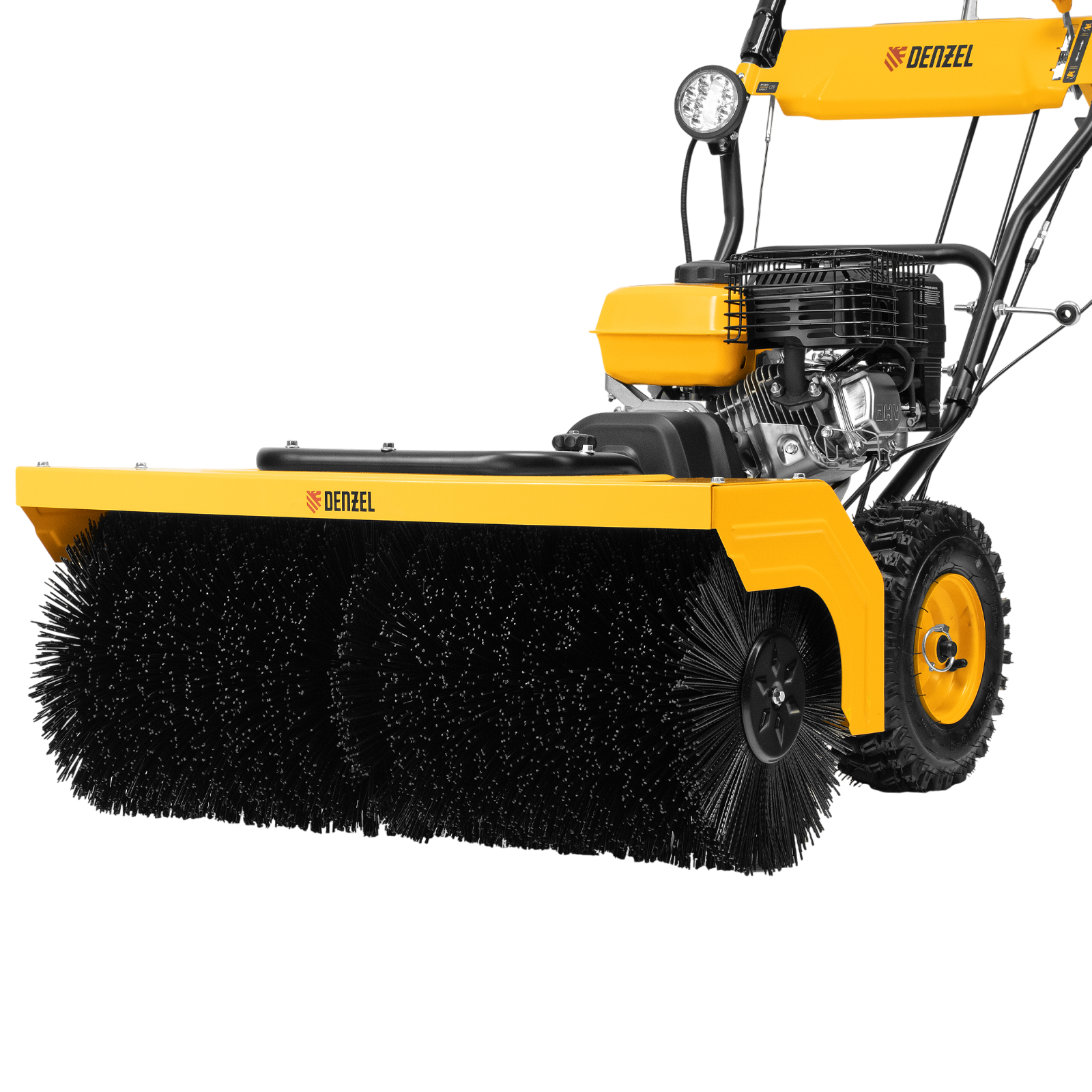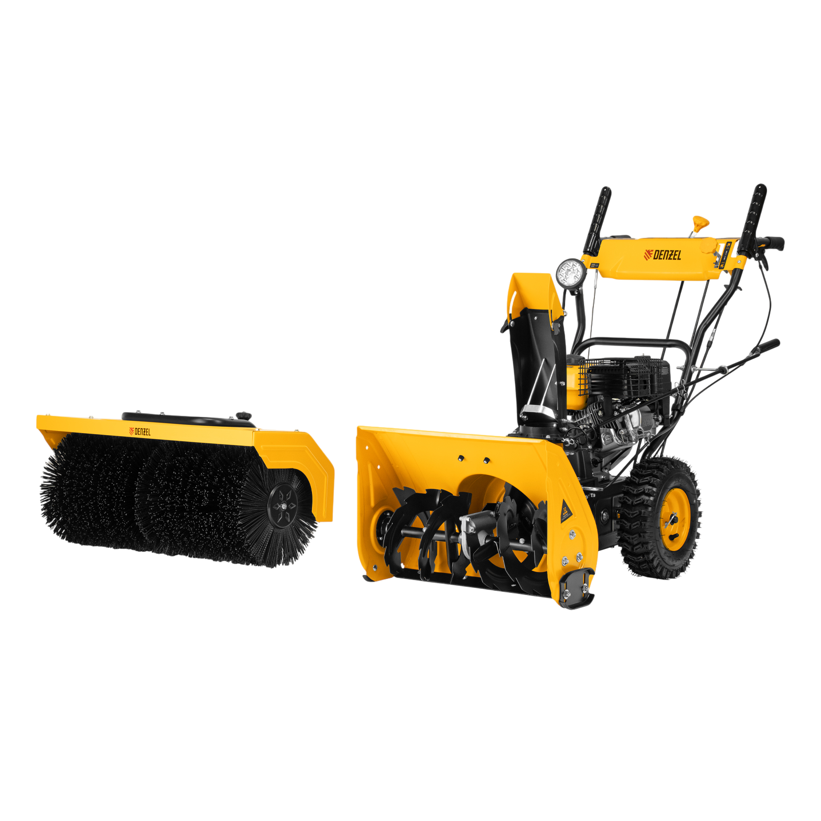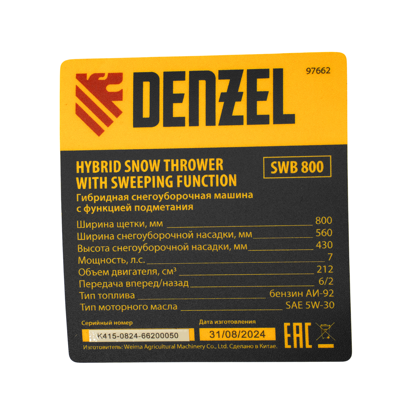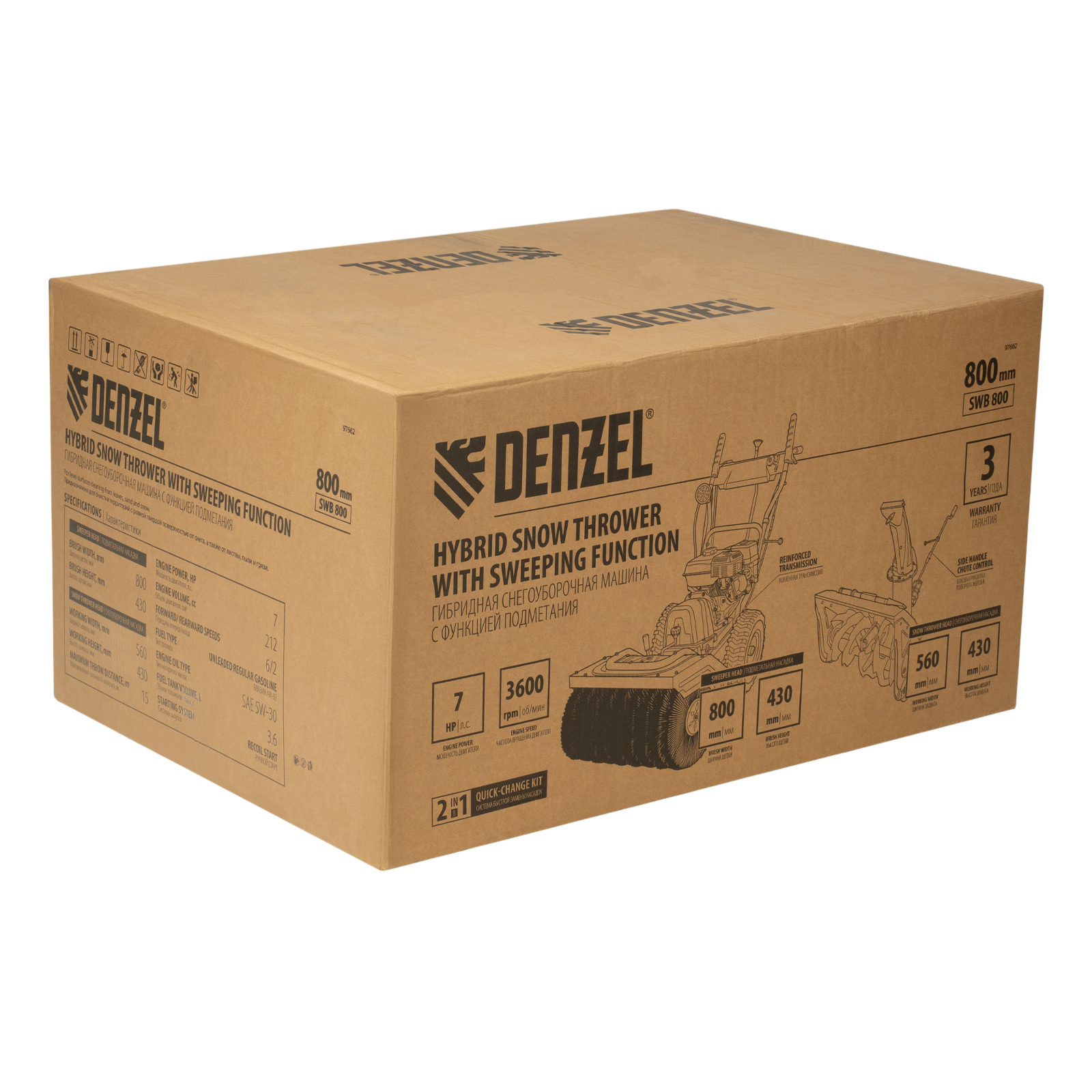 Гибридная снегоуборочная машина Denzel SWB-800 97662 с двигателем объемом 212 см3, ручным стартером и 2 насадками, предназначена для очистки территории от снега, а также может использоваться для уборки листвы, грязи, пыли и мусора. Благодаря приводу на колеса машину не нужно толкать. Ширина обработки щеткой составляет 800 мм, ширина снегоуборочной насадки — 560 мм при высоте захвата 430 мм. Машина позволяет быстро расчистить дорожки, тротуары, территорию парковки и т.д.