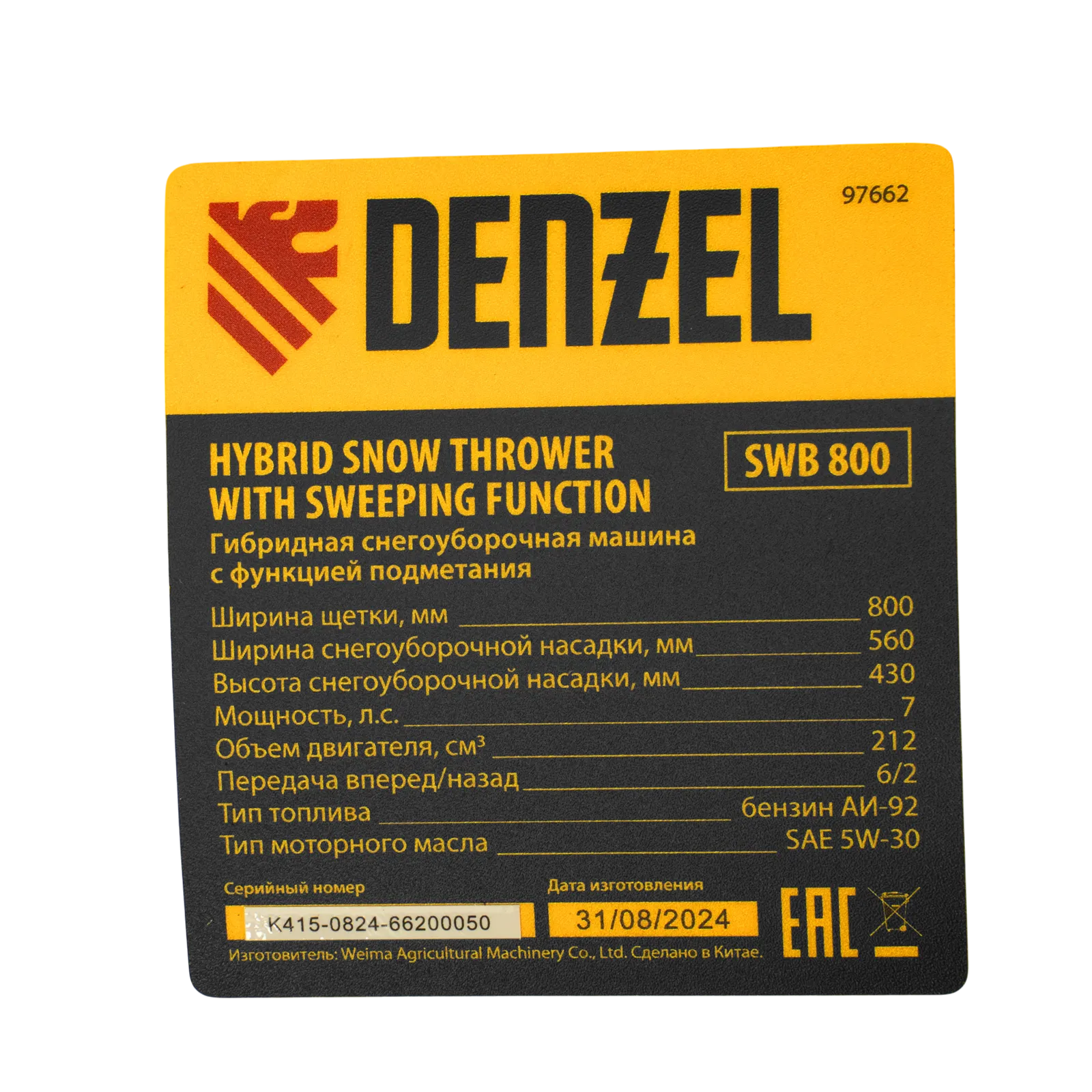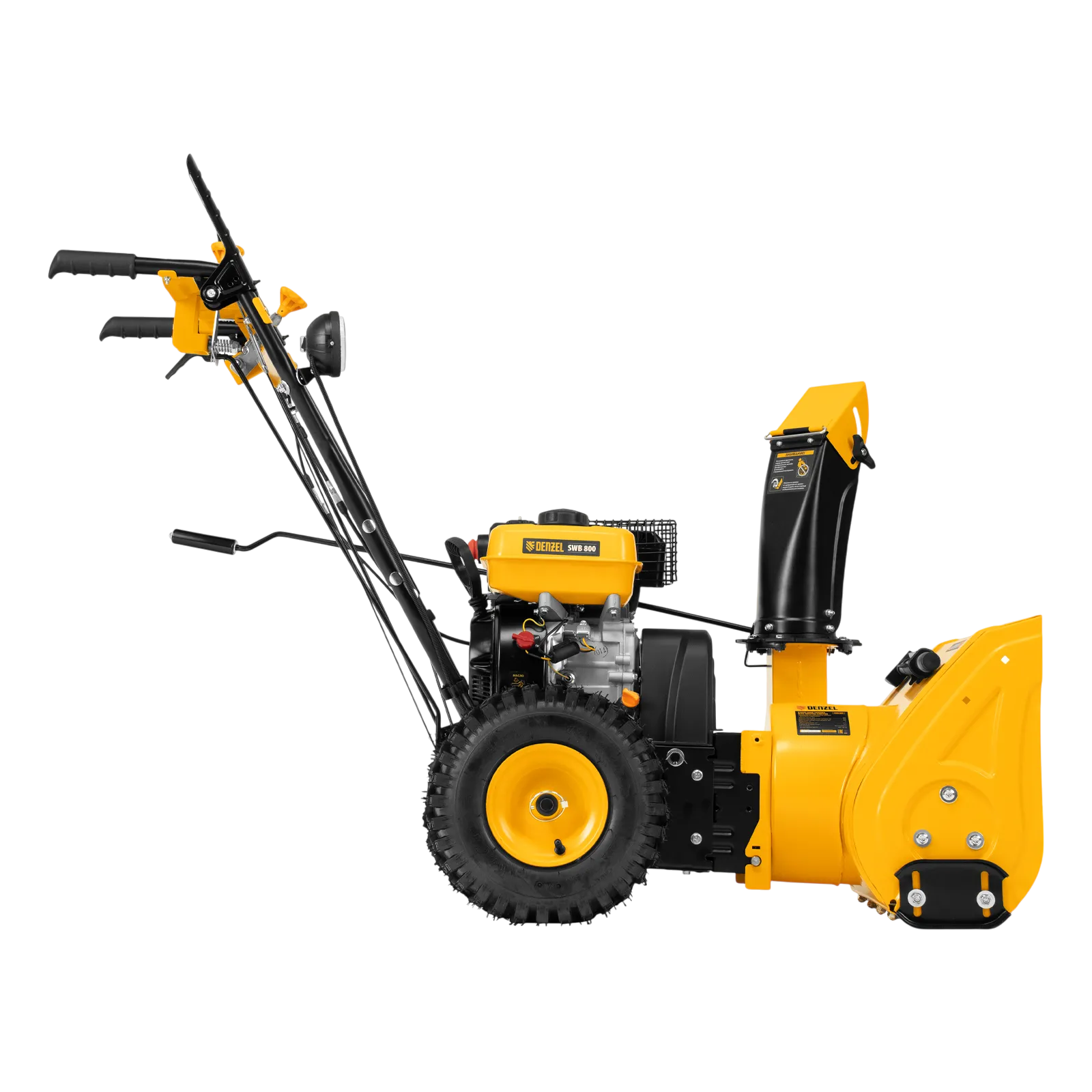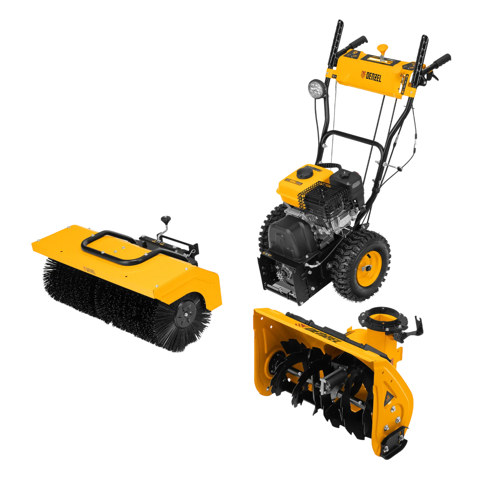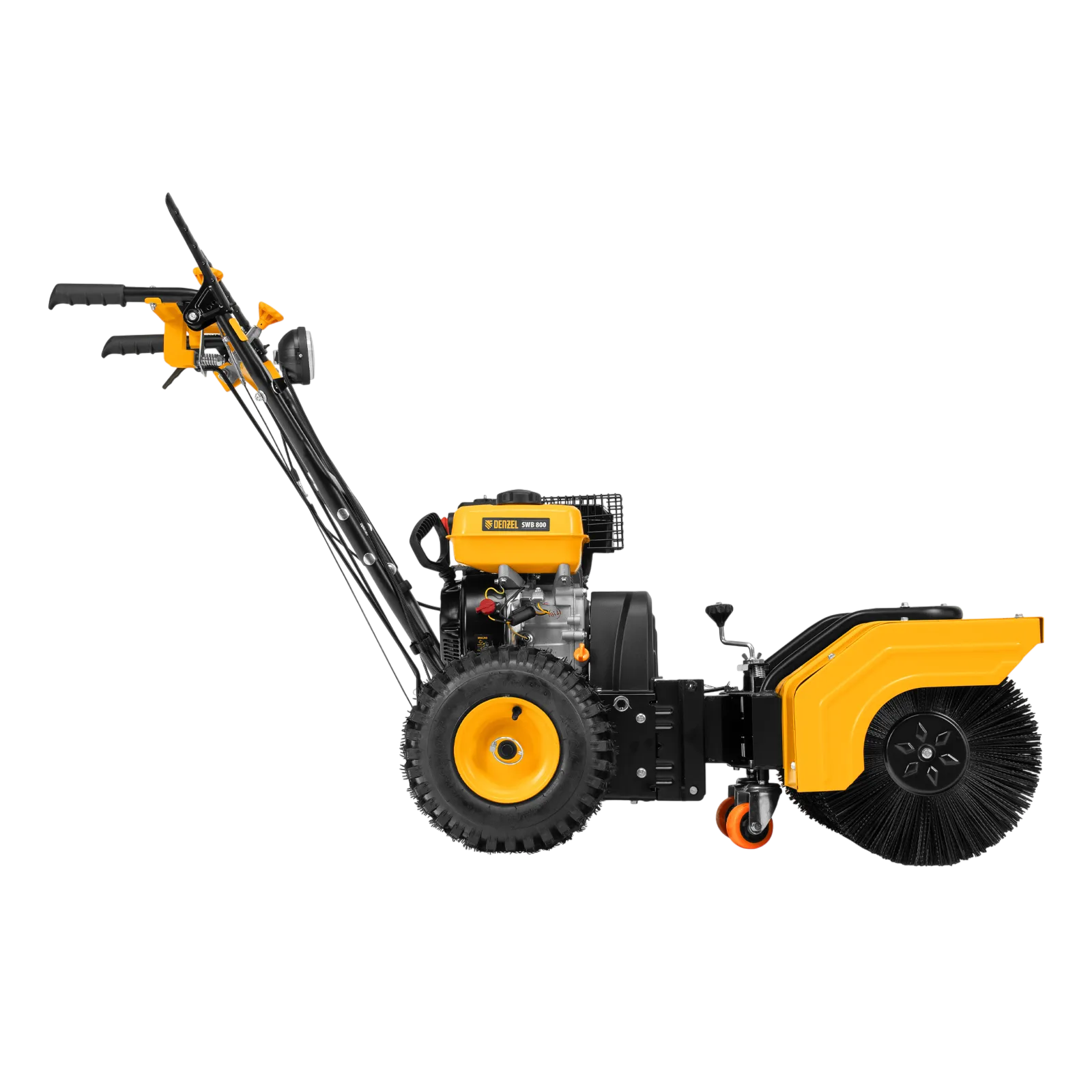 Гибридная снегоуборочная машина Denzel SWB-800 97662 с двигателем объемом 212 см3, ручным стартером и 2 насадками, предназначена для очистки территории от снега, а также может использоваться для уборки листвы, грязи, пыли и мусора. Благодаря приводу на колеса машину не нужно толкать. Ширина обработки щеткой составляет 800 мм, ширина снегоуборочной насадки — 560 мм при высоте захвата 430 мм. Машина позволяет быстро расчистить дорожки, тротуары, территорию парковки и т.д.