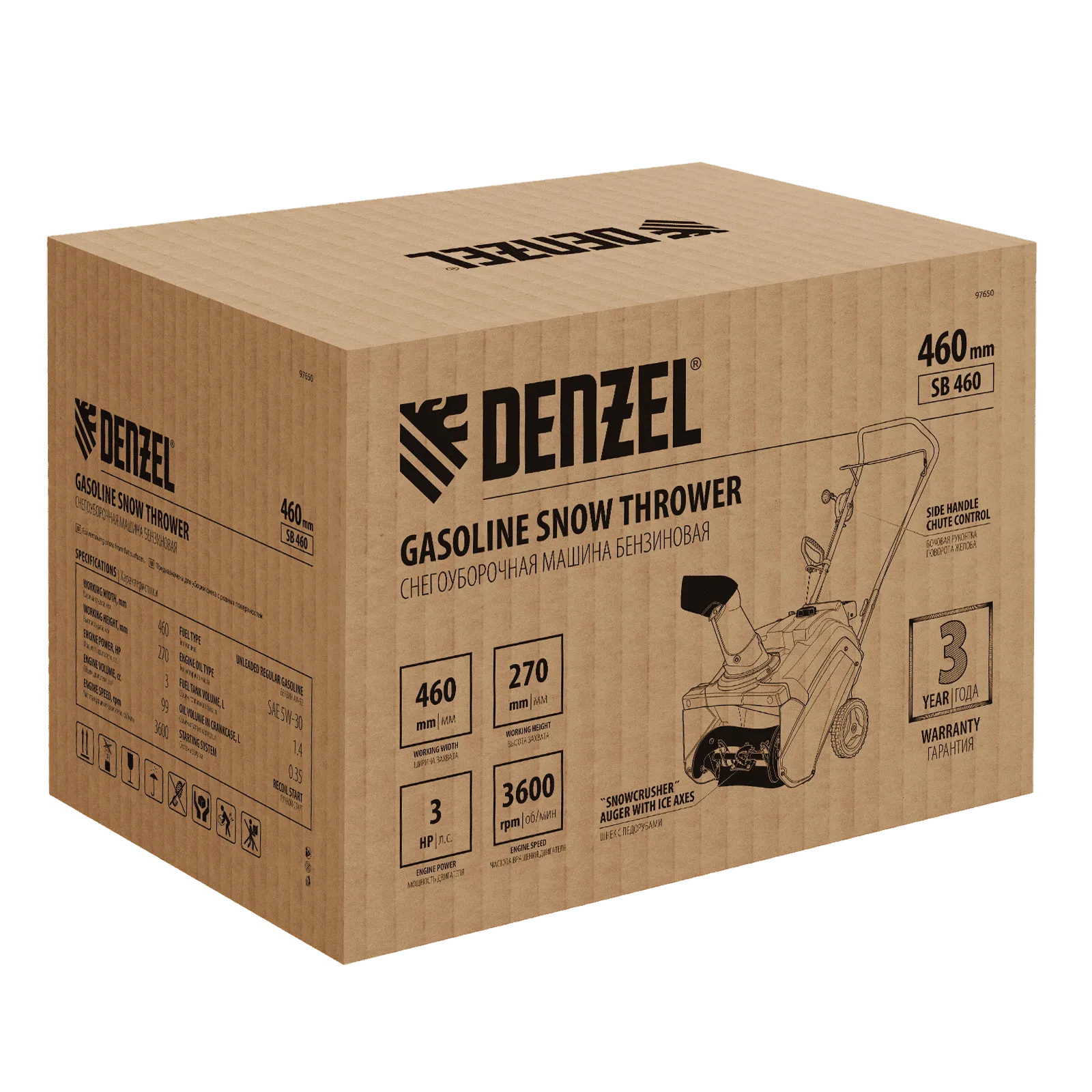 Бензиновая снегоуборочная машина Denzel SB 460 97650 с двигателем объемом 99 см3, ручным стартом и эксклюзивным шнеком Snow Crusher, предназначена для очищения от снега открытых ровных поверхностей: придомовой территории, дорожек, тротуаров, автомобильных парковок. Высота захвата составляет 27 см, ширина — 46 см, дальность выброса снега достигает 10 м. Машина значительно превосходит в производительности электрические модели, оставаясь компактной и мобильной.