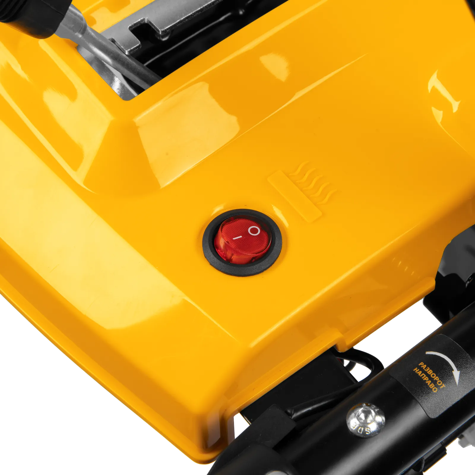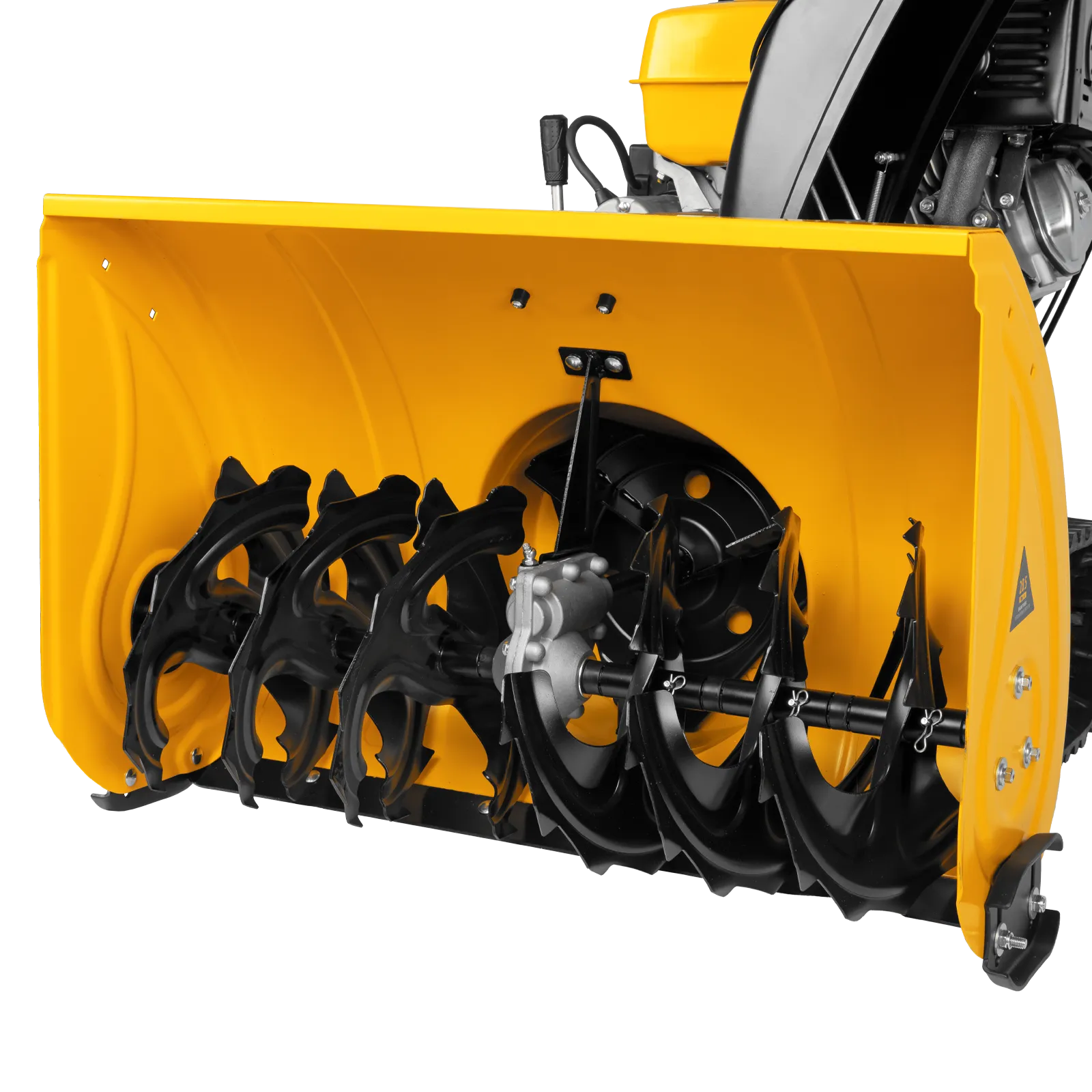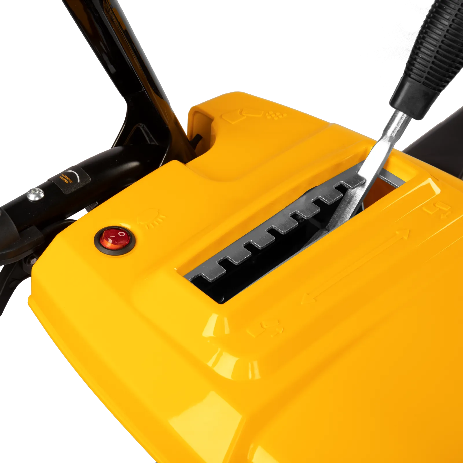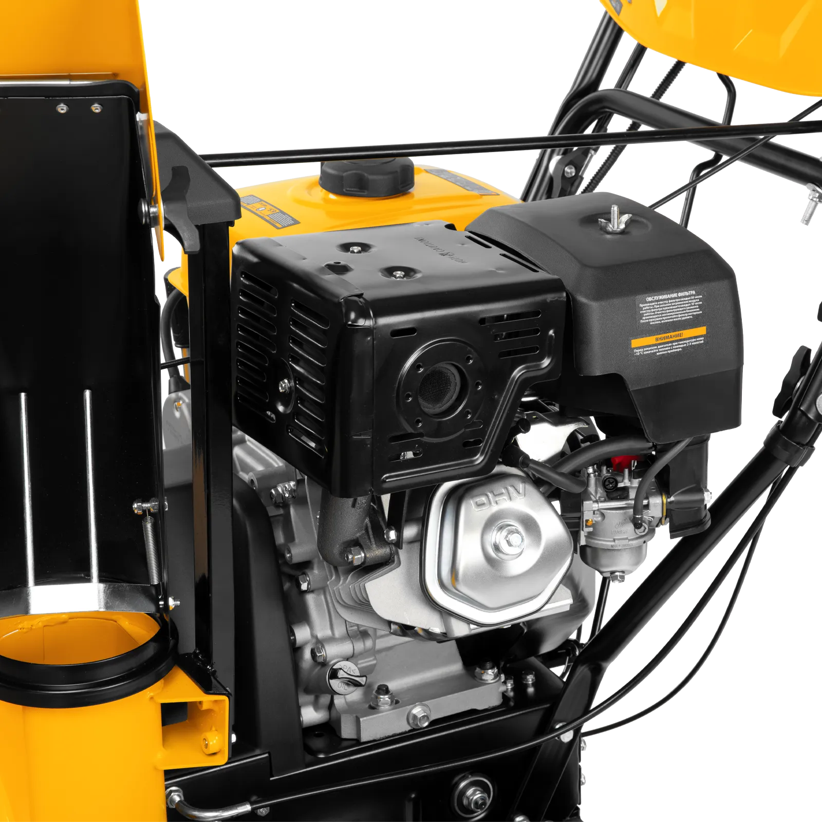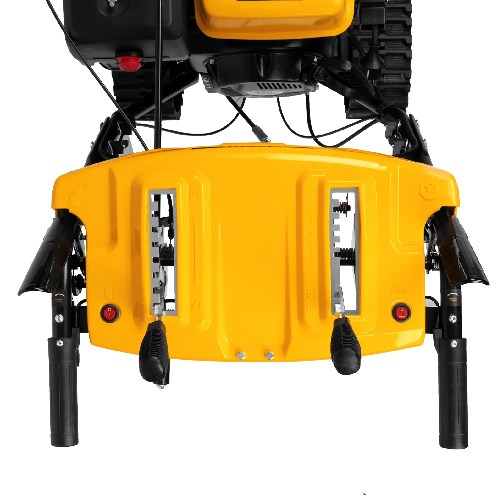- Функциональная пластиковая панель управления — презентабельный внешний вид; рычаг регулировки наклона дефлектором желоба, рукоятка поворота желоба, переключение скоростей, кнопки включения подогрева и освещения, запасные срезные болты — все под рукой!