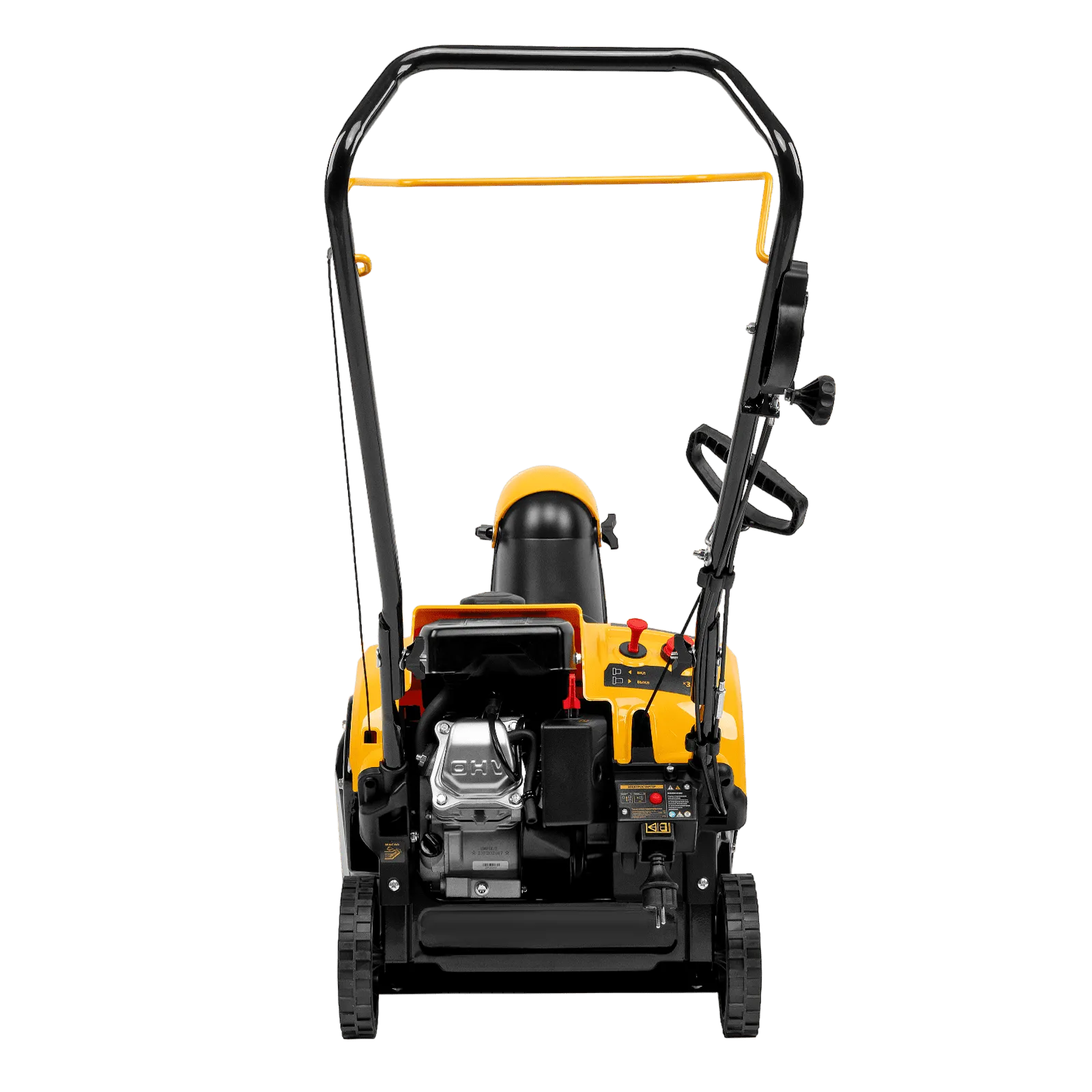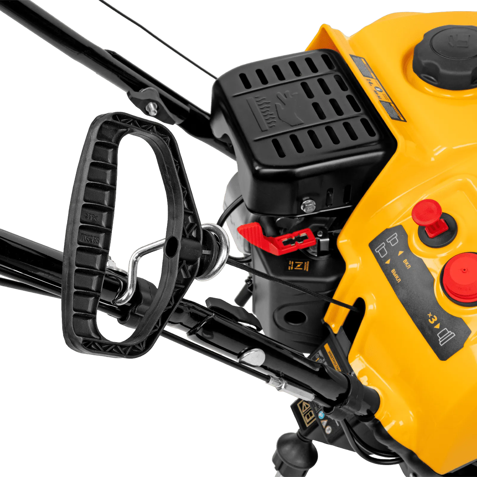 - Удобное управление — широкая рукоятка ручного старта облегчает запуск двигателя, для регулировки угла поворота желоба не нужно наклоняться.