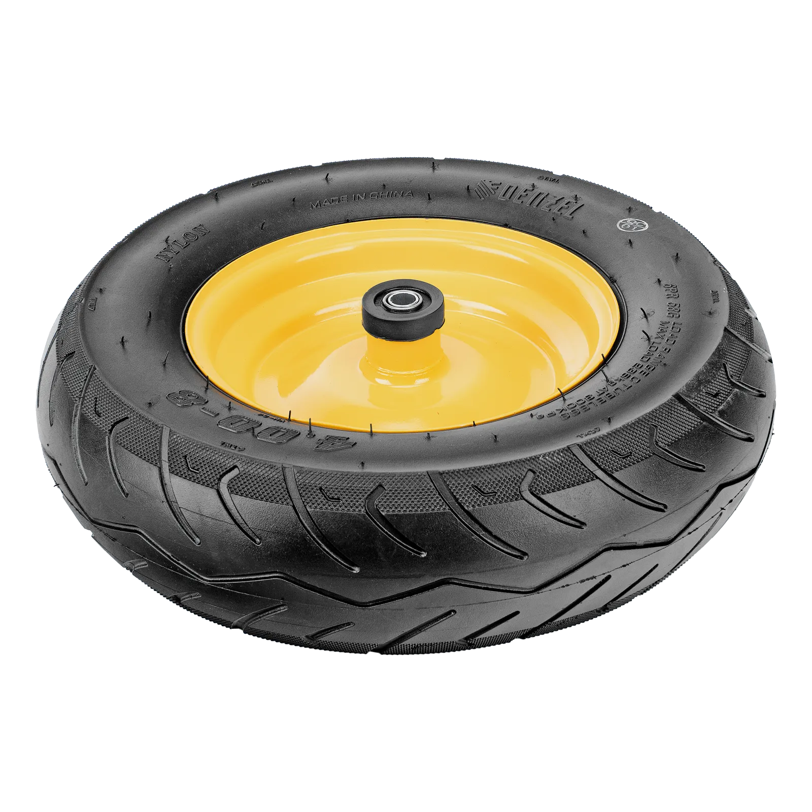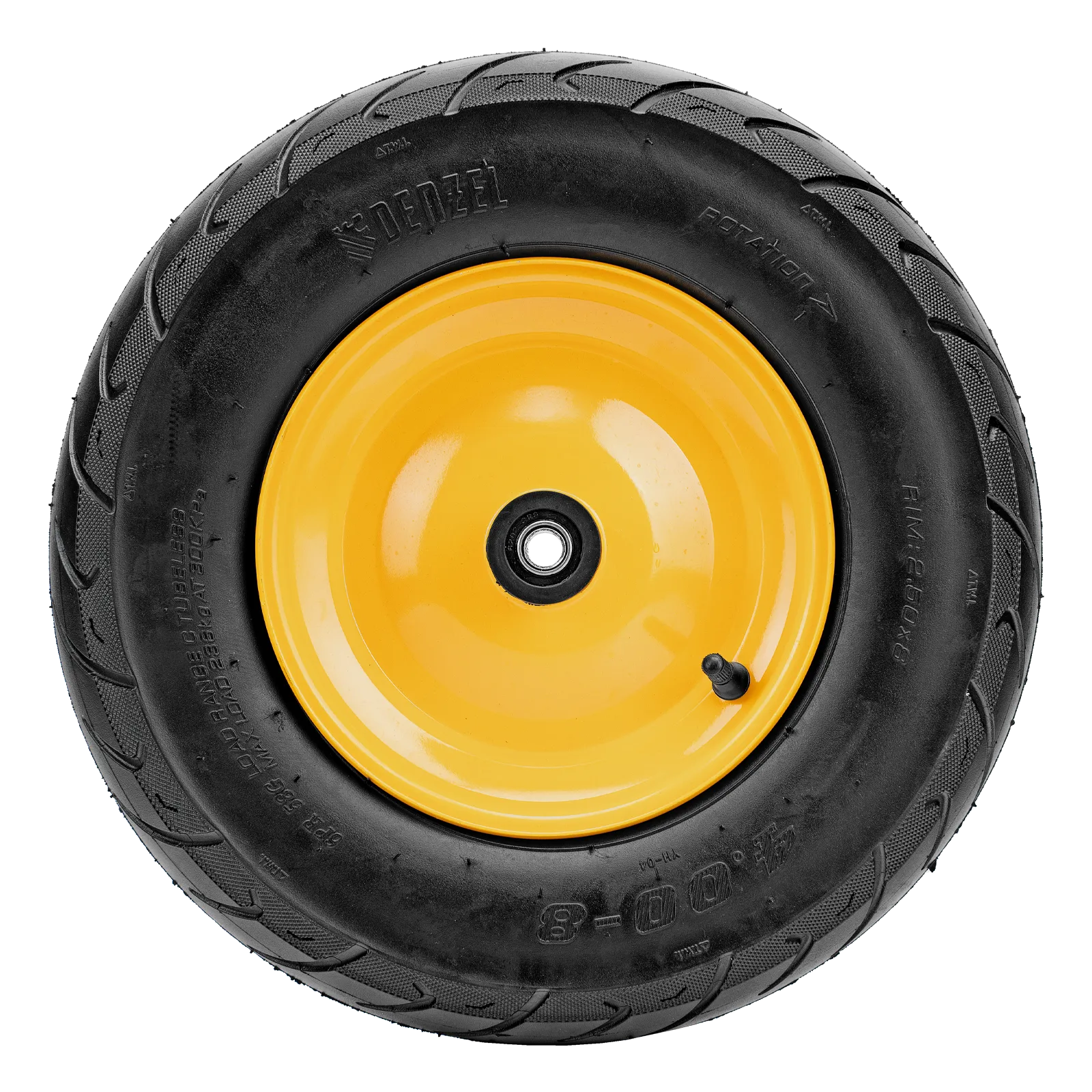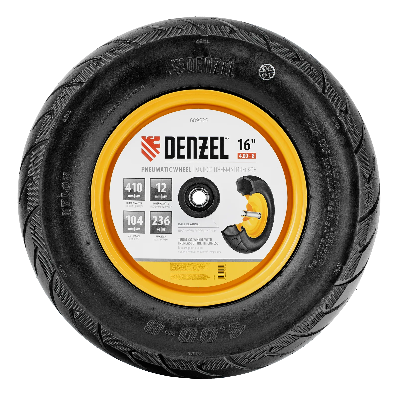Пневматическое бескамерное колесо Denzel 689535 размером 16 х 4.00-8 и диаметром 410 мм, с длиной оси 104 мм и посадочным диаметром 20 мм, совместимо с тачкой Denzel 689365. Обеспечивает плавный ход и выдерживает высокие нагрузки при перемещении тяжелых грузов, подходит для интенсивного использования.