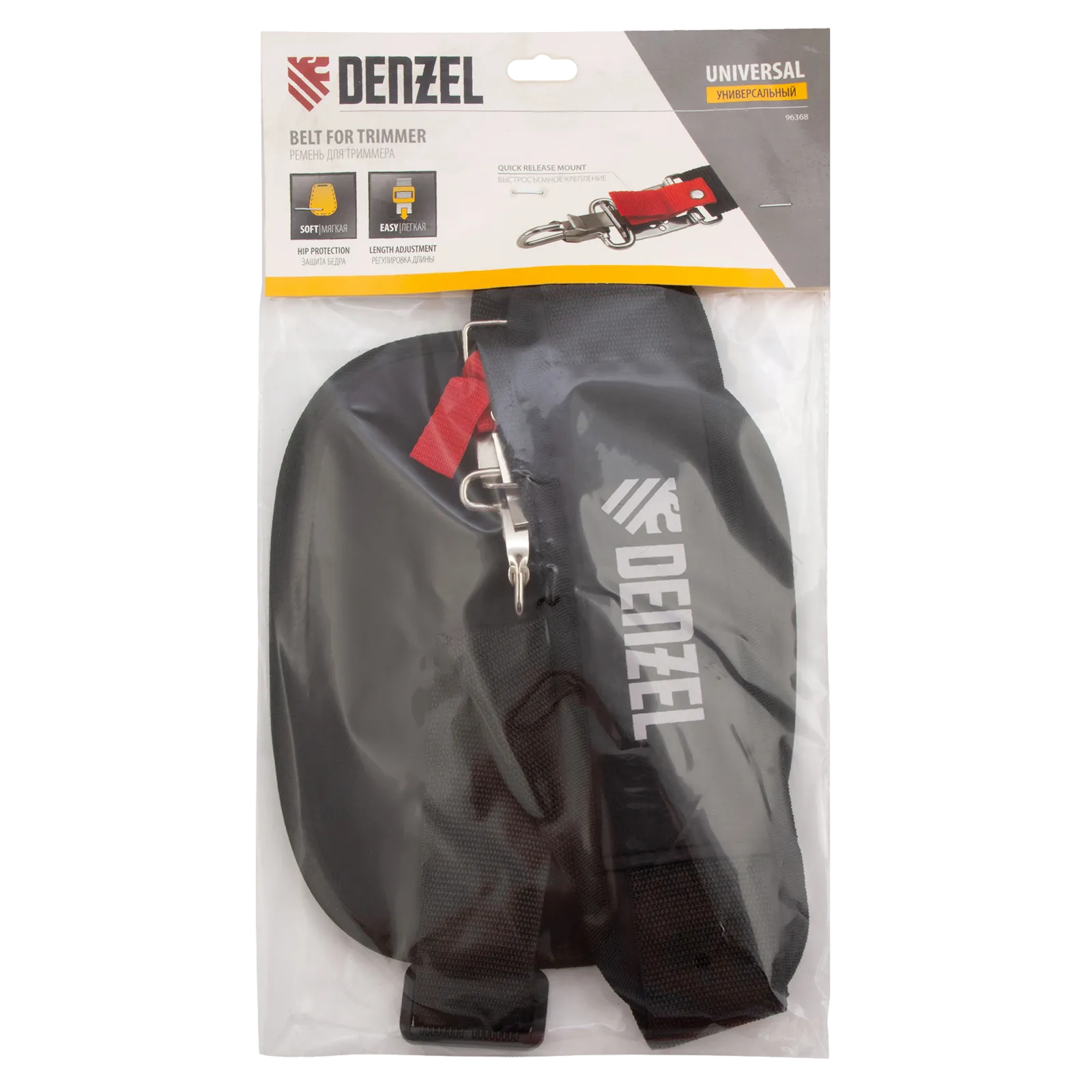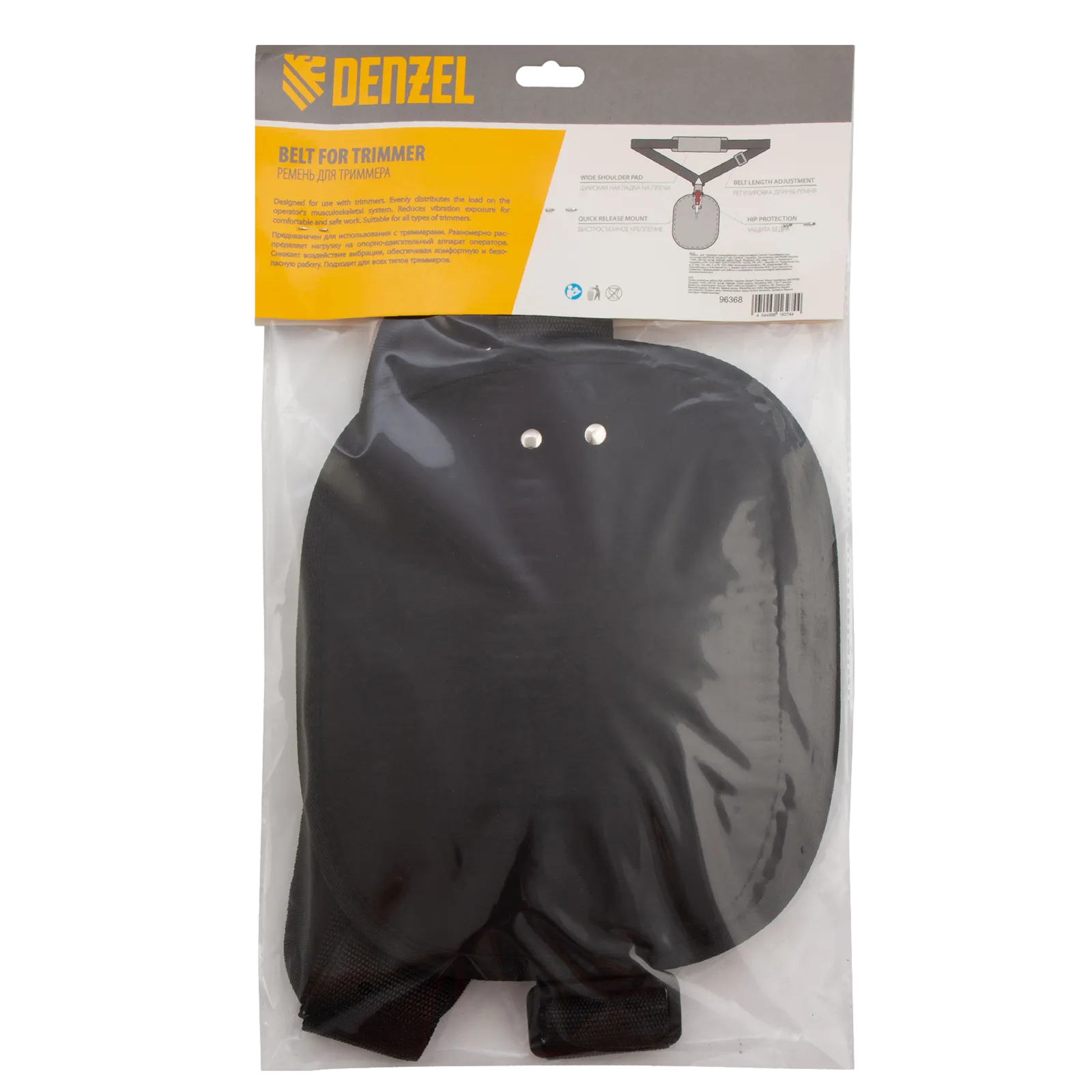 Универсальный ремень Denzel 96368 с защитой бедра предназначен для облегчения работы с триммерами. Он подвешивается на плечо, позволяя снизить нагрузку на руки, что удобно для выполнения работ средней продолжительности.