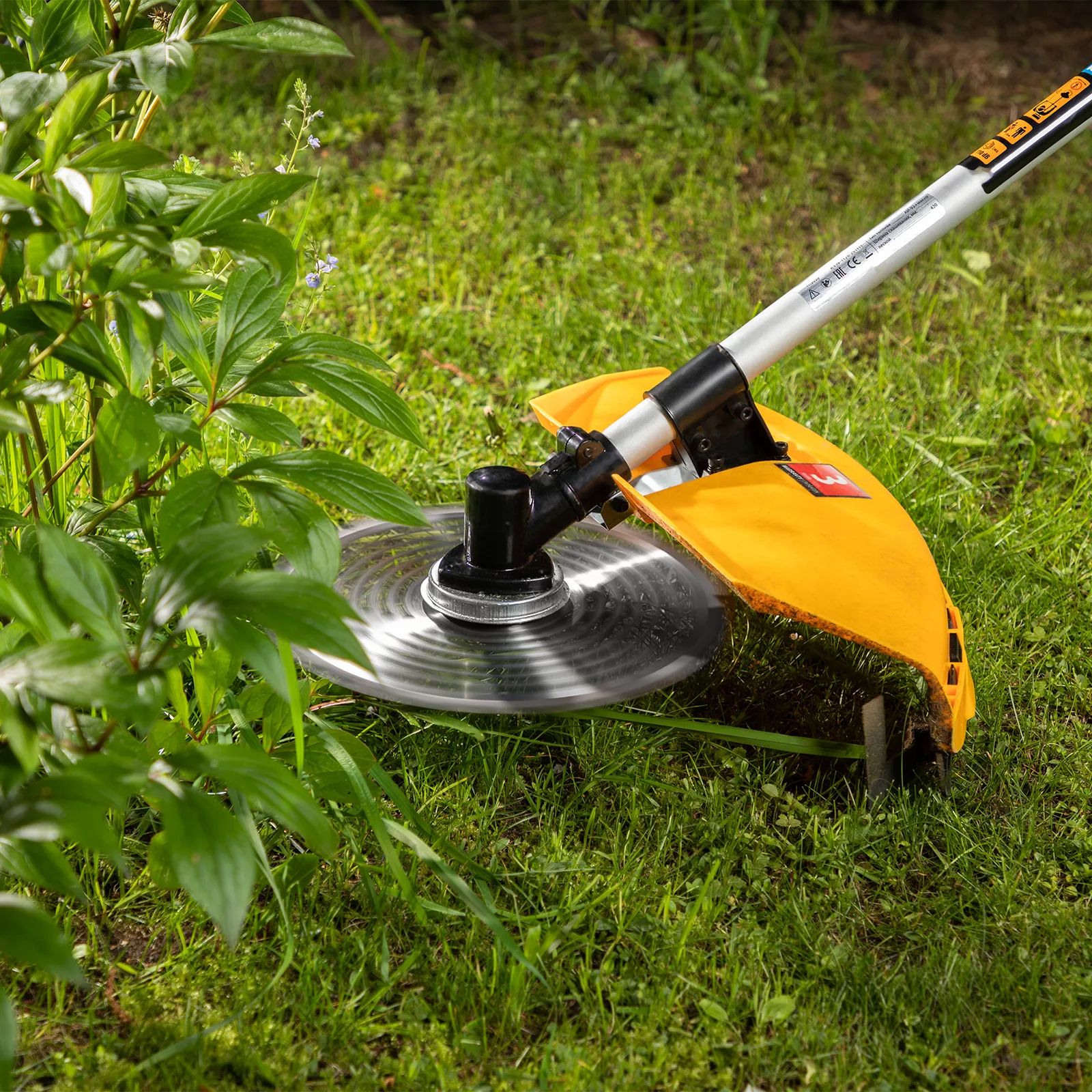 - Дополнительные возможности — можно приобрести диски Denzel 96323, 96325 для быстрого удаления растительности с жесткими стеблями (полыни, крапивы, лебеды), 96328 для скашивания молодых побегов кустарника диаметром до 3 мм.