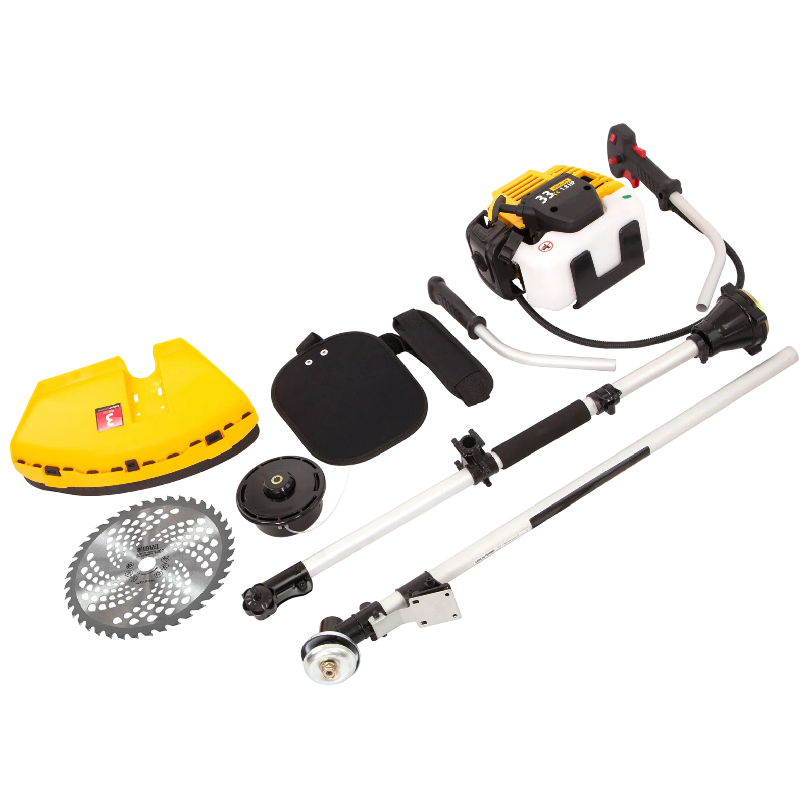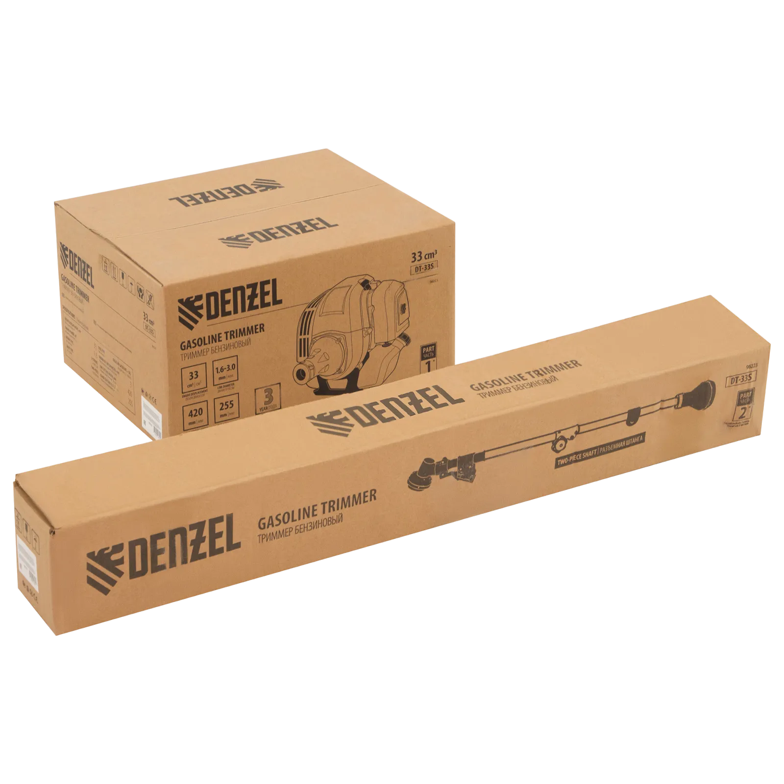Бензиновый триммер Denzel DT-33S 96223 с двигателем мощностью 1,8 л.с. и объемом 33 см³, с разъемной штангой, поставляется комплектом из 2 частей и предназначен для подравнивания газона и скашивания травы всех типов, в том числе с жесткими древовидными стеблями (полыни, крапивы, лебеды, борщевика), а также срезания кустарника и молодых побегов деревьев с диаметром стволов до 10 мм. Удобен для работы в труднодоступных местах, может работать с мокрой травой. В комплекте катушка с леской и пильный диск, ширина скашивания составляет 420 мм и 255 мм соответственно.