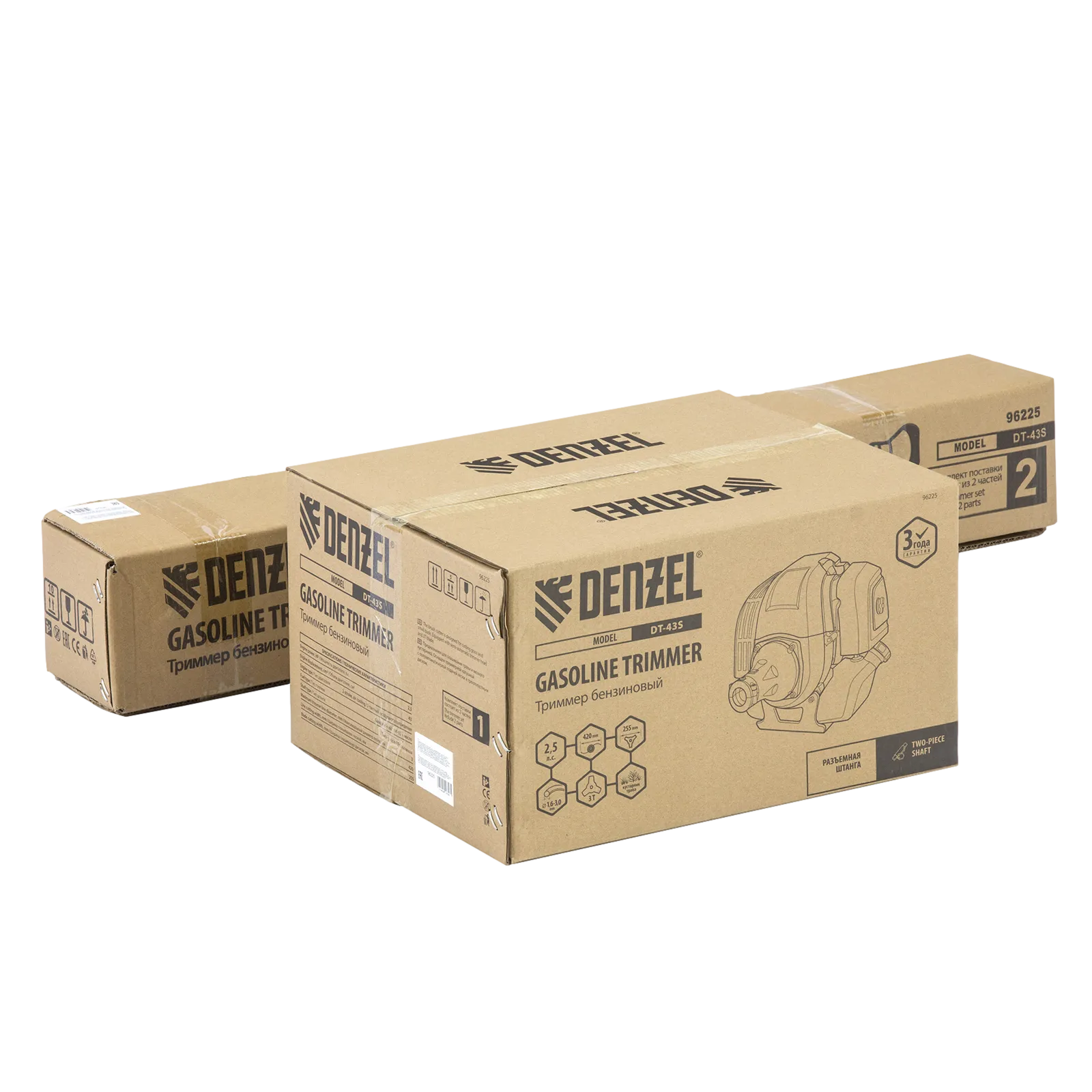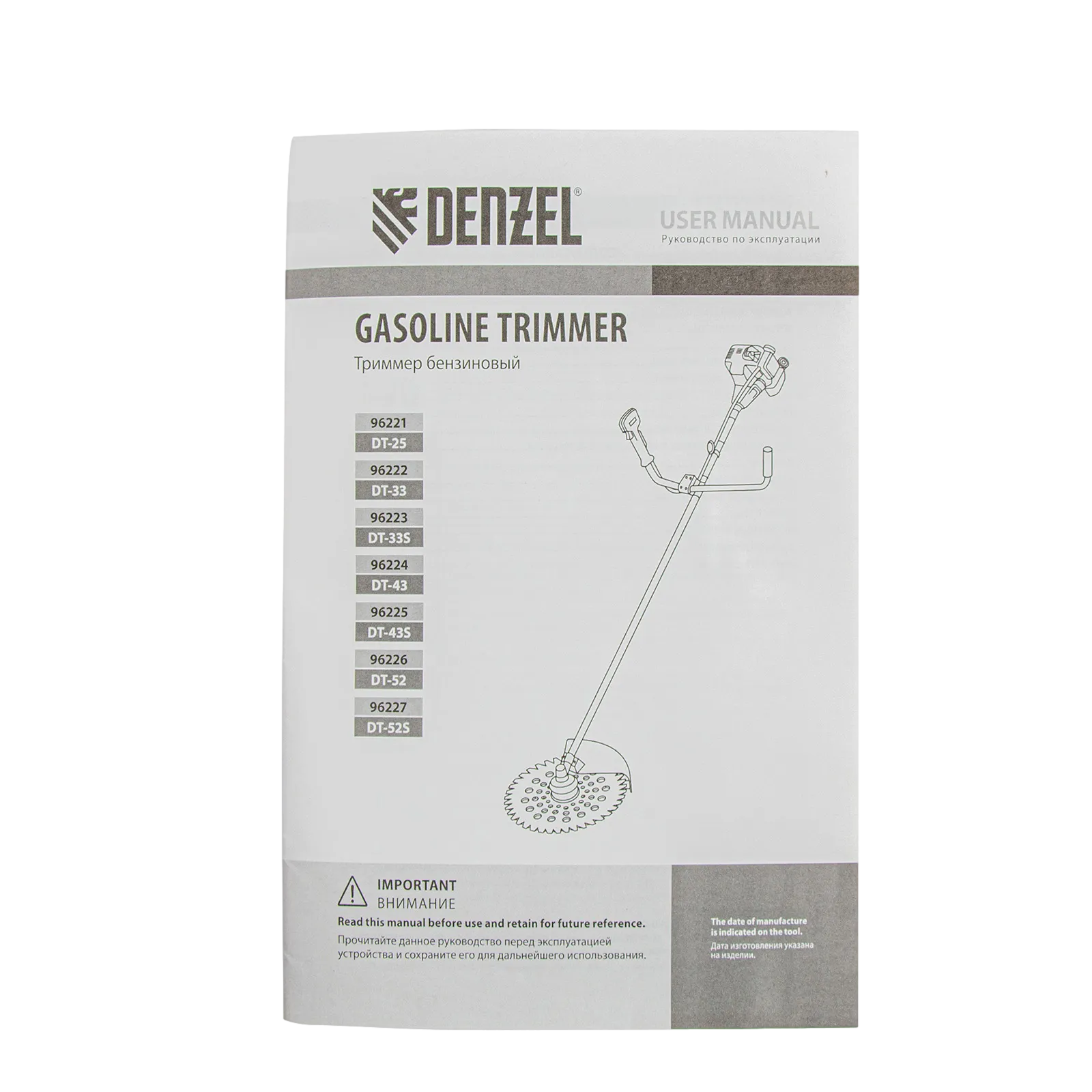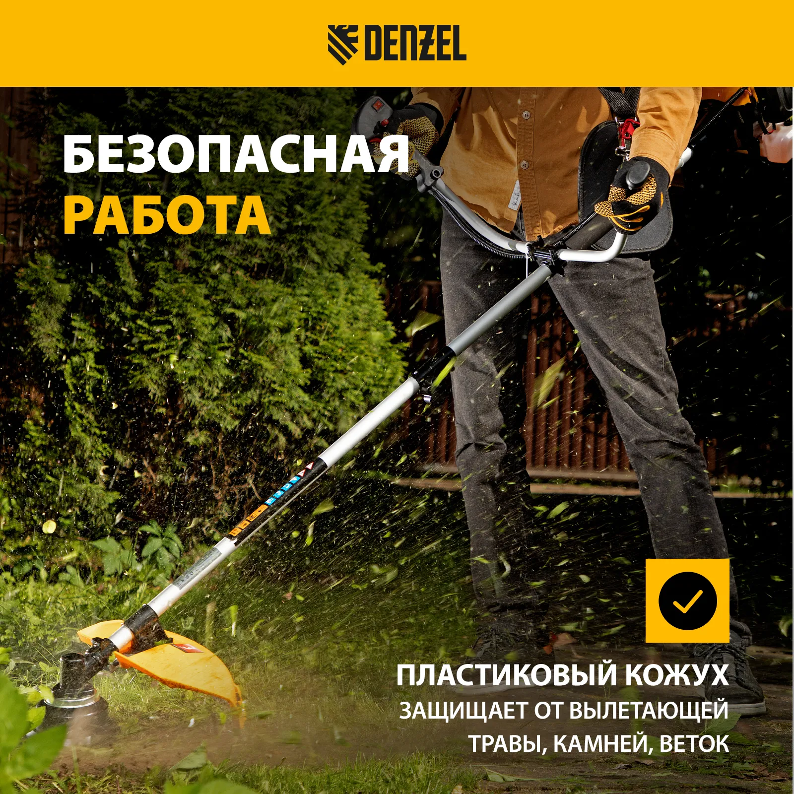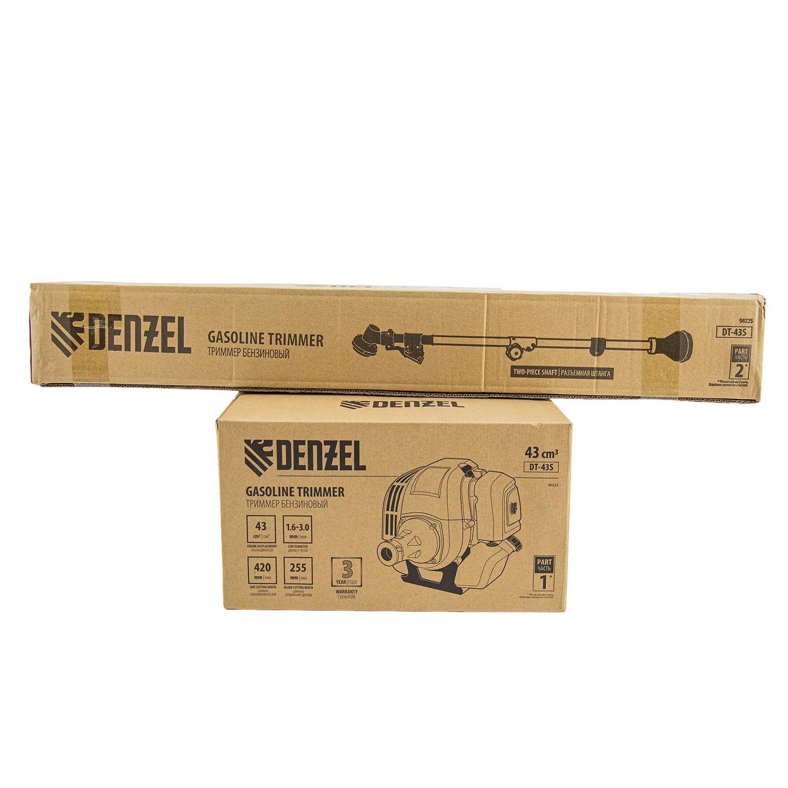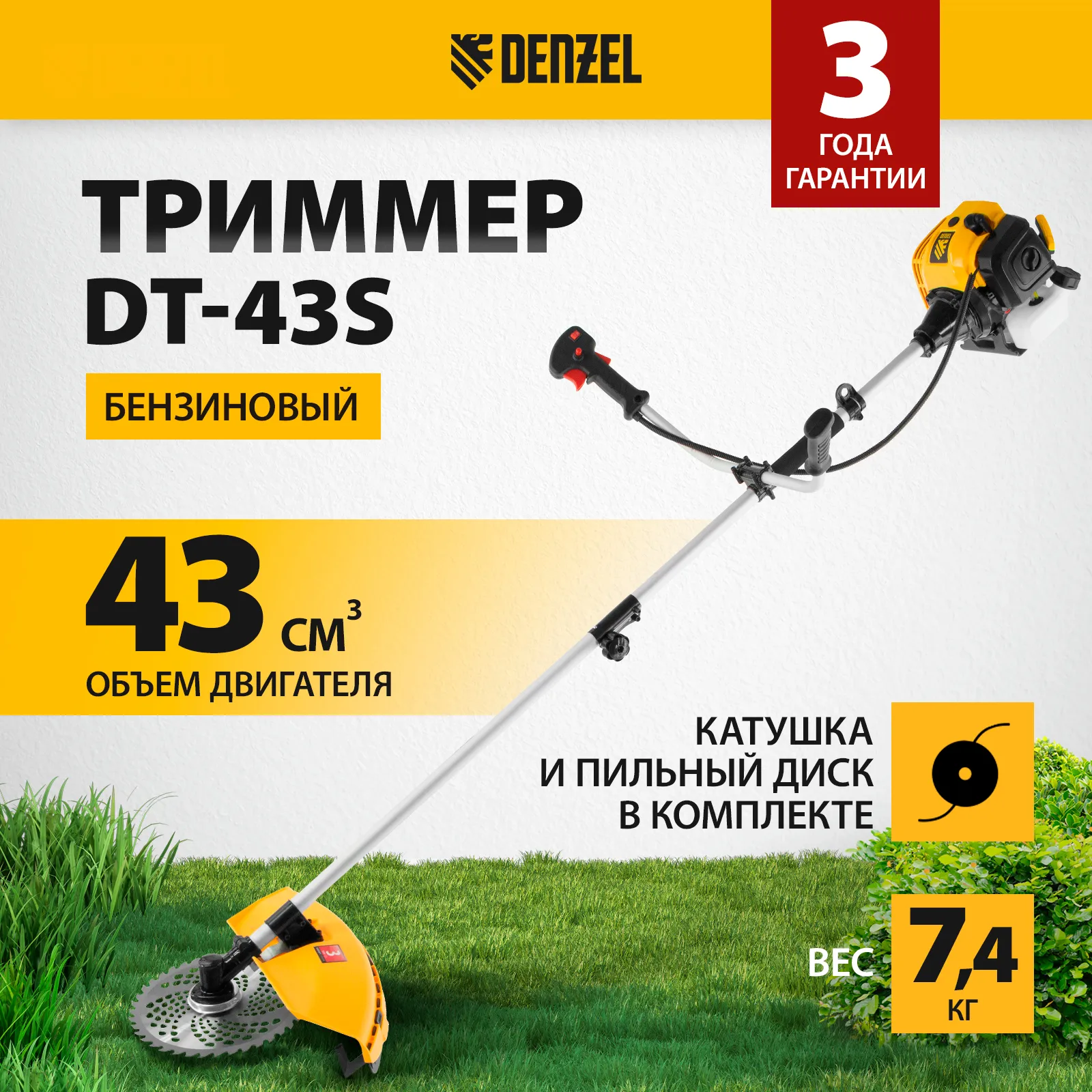 Бензиновый триммер Denzel DT-43S 96225 с двигателем объемом 43 см³ и мощностью 2,5 л.с., с разъемной штангой, состоит из 2 частей. Используется для подравнивания газона, скашивания травы всех типов, в том числе с жесткими древовидными стеблями (полыни, крапивы, лебеды, борщевика), а также срезания кустарника и молодых побегов деревьев с диаметром стволов до 10 мм. Это оптимальный вариант для работы в труднодоступных местах: вокруг насаждений, вдоль садовых дорожек, возле стен дома и т. д. Мощный двухтактный двигатель обеспечивает высокую частоту вращения оснастки 9500 об/мин. Ширина скашивания диском составляет 25,5 см, леской — 42 см.