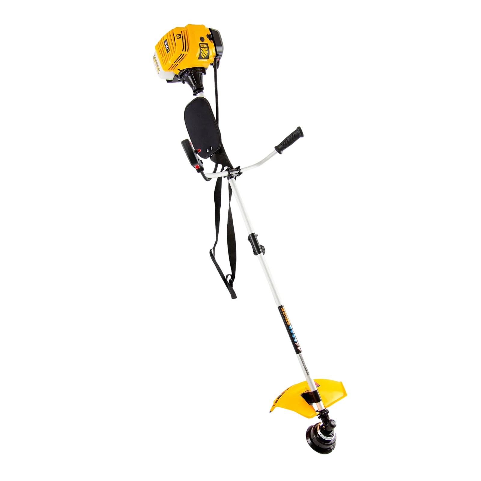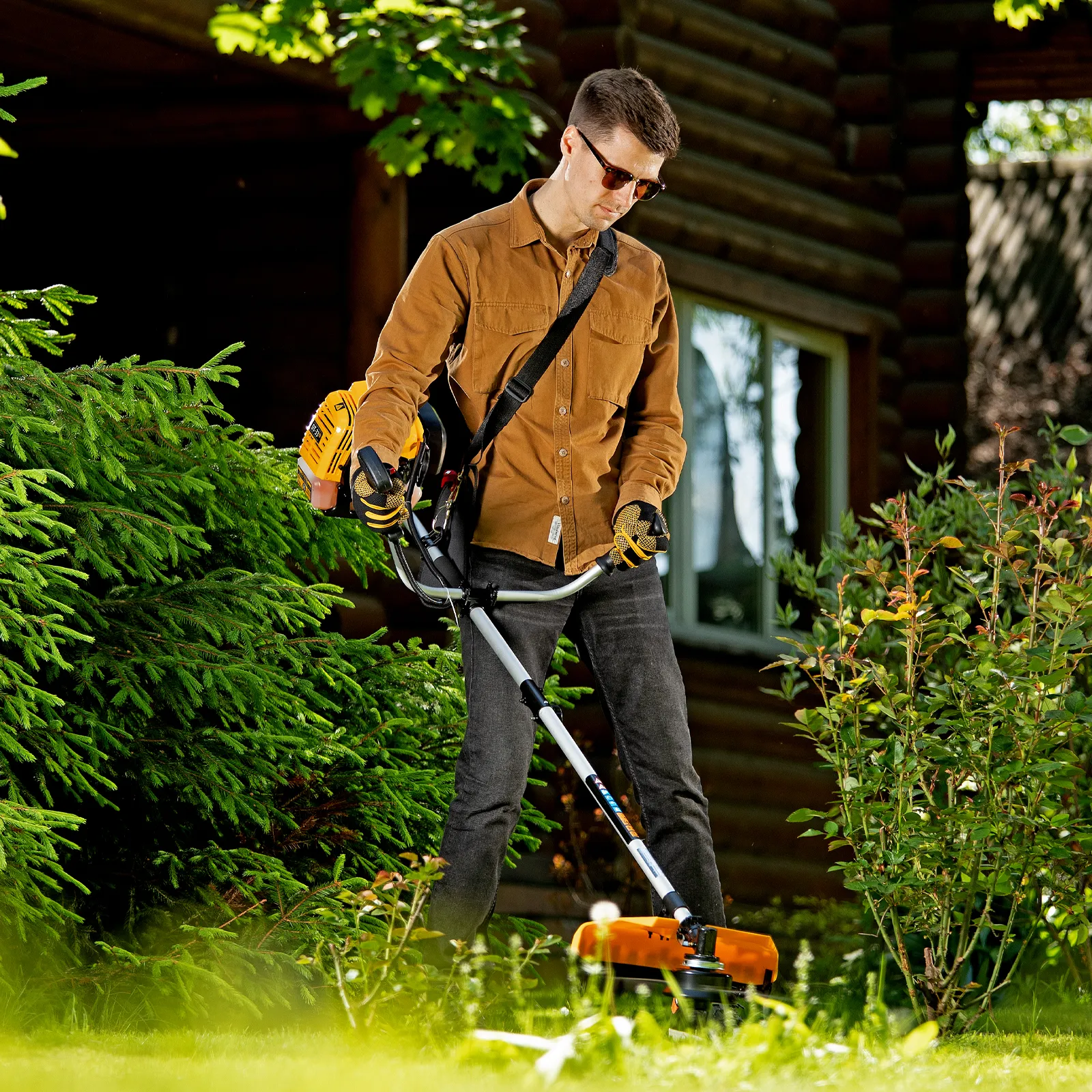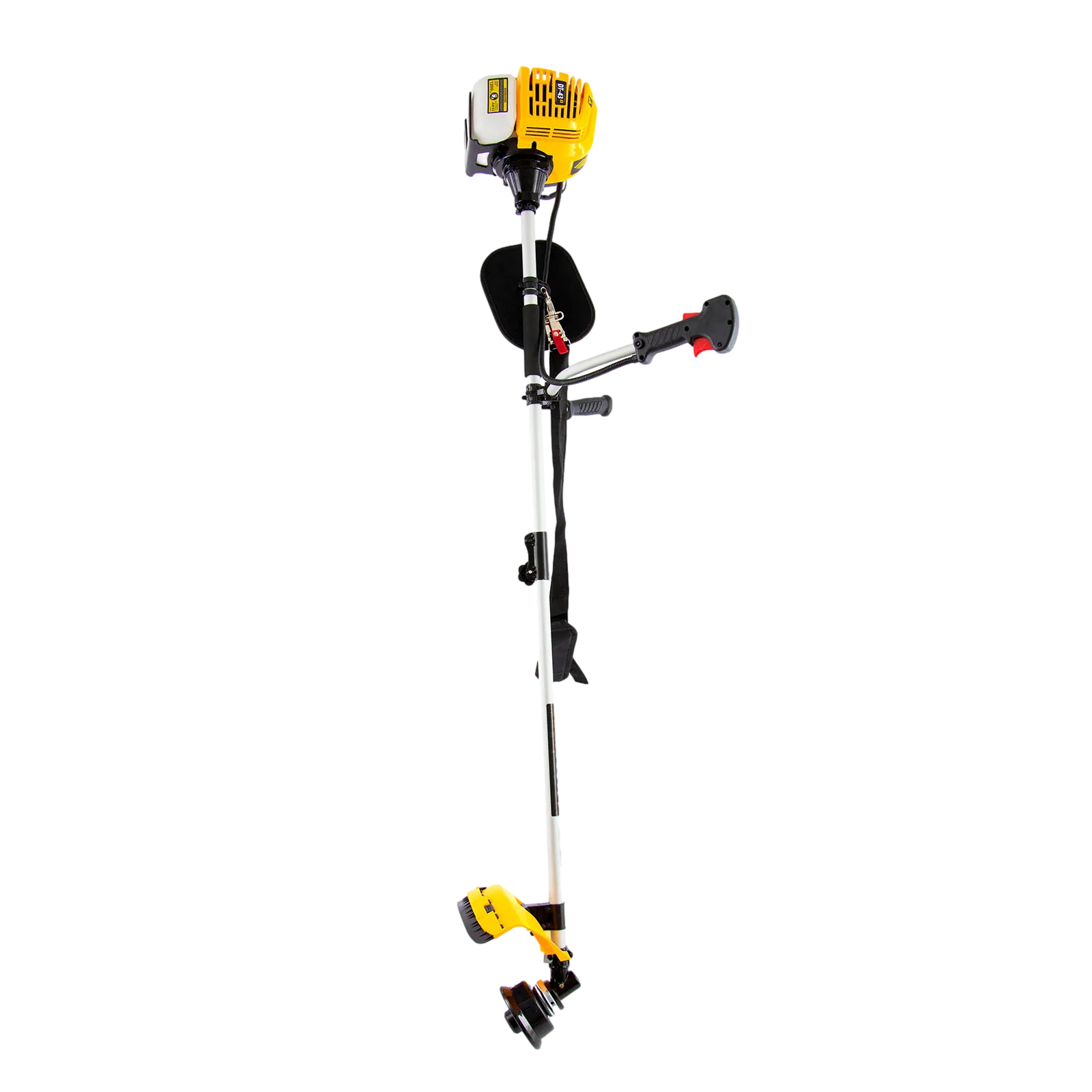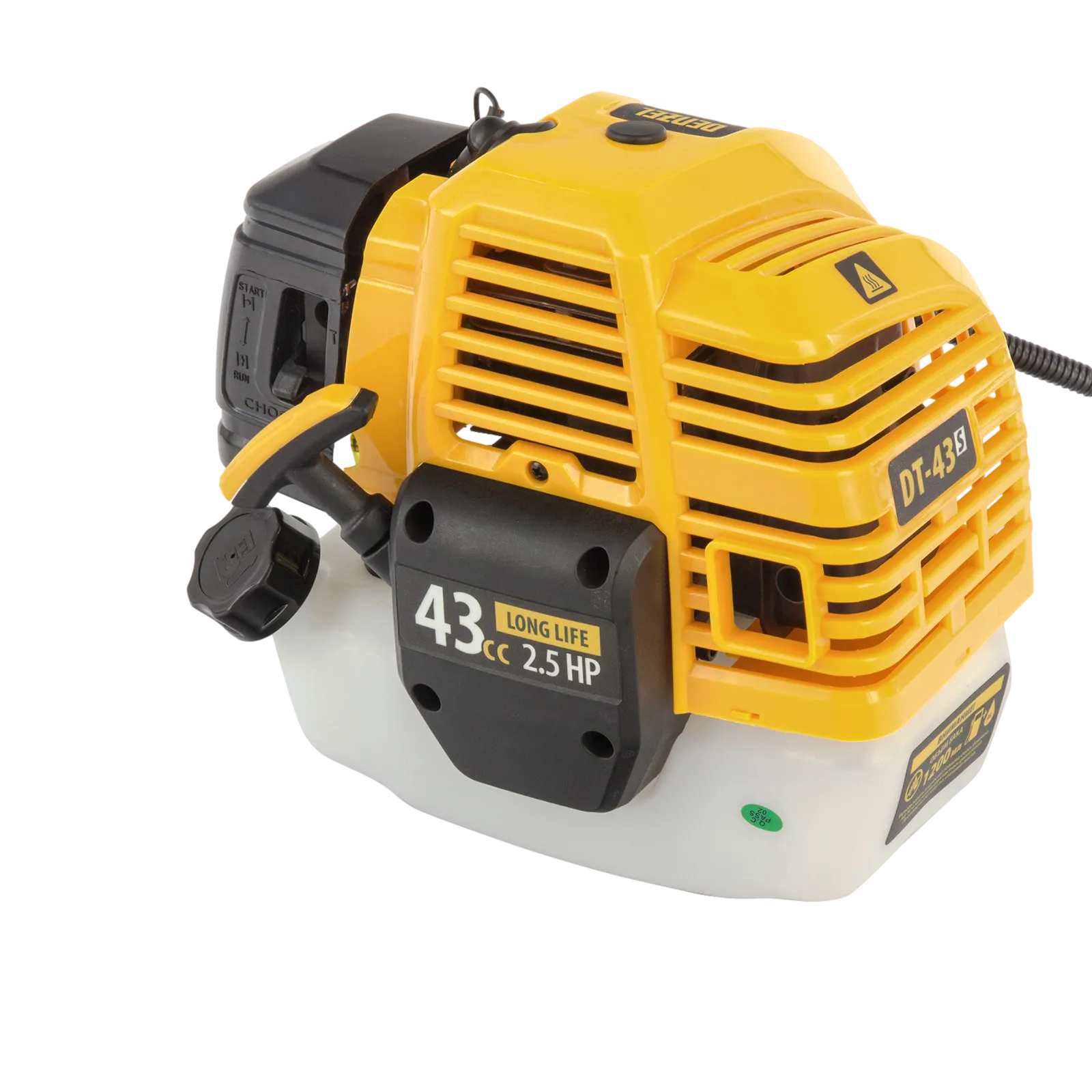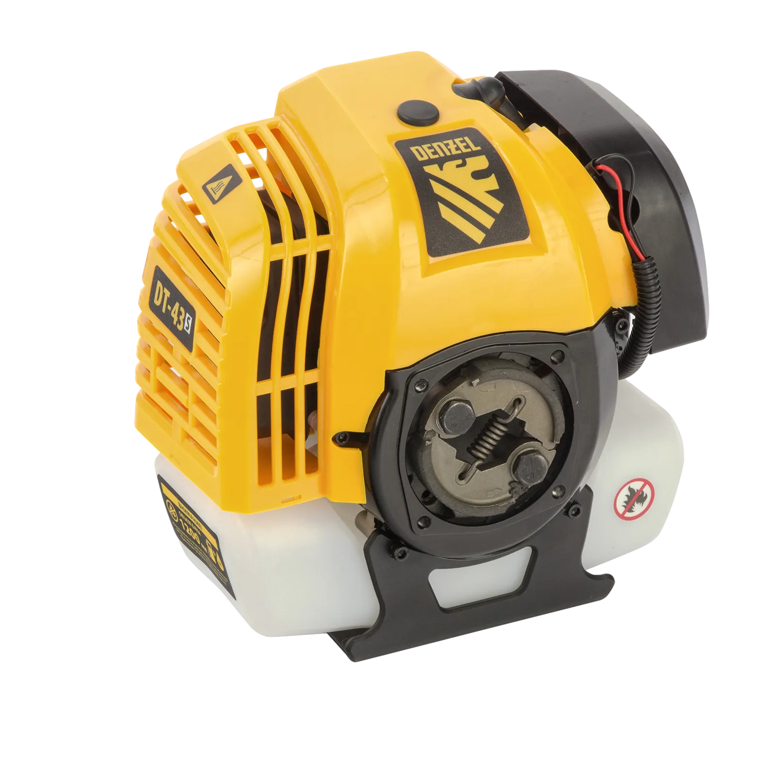 Бензиновый триммер Denzel DT-43S 96225 с двигателем объемом 43 см³ и мощностью 2,5 л.с., с разъемной штангой, состоит из 2 частей. Используется для подравнивания газона, скашивания травы всех типов, в том числе с жесткими древовидными стеблями (полыни, крапивы, лебеды, борщевика), а также срезания кустарника и молодых побегов деревьев с диаметром стволов до 10 мм. Это оптимальный вариант для работы в труднодоступных местах: вокруг насаждений, вдоль садовых дорожек, возле стен дома и т. д. Мощный двухтактный двигатель обеспечивает высокую частоту вращения оснастки 9500 об/мин. Ширина скашивания диском составляет 25,5 см, леской — 42 см.