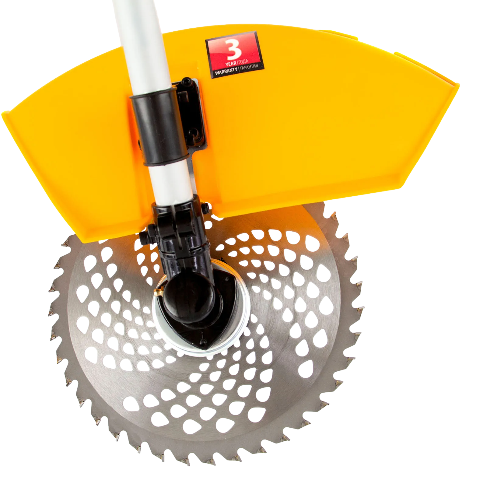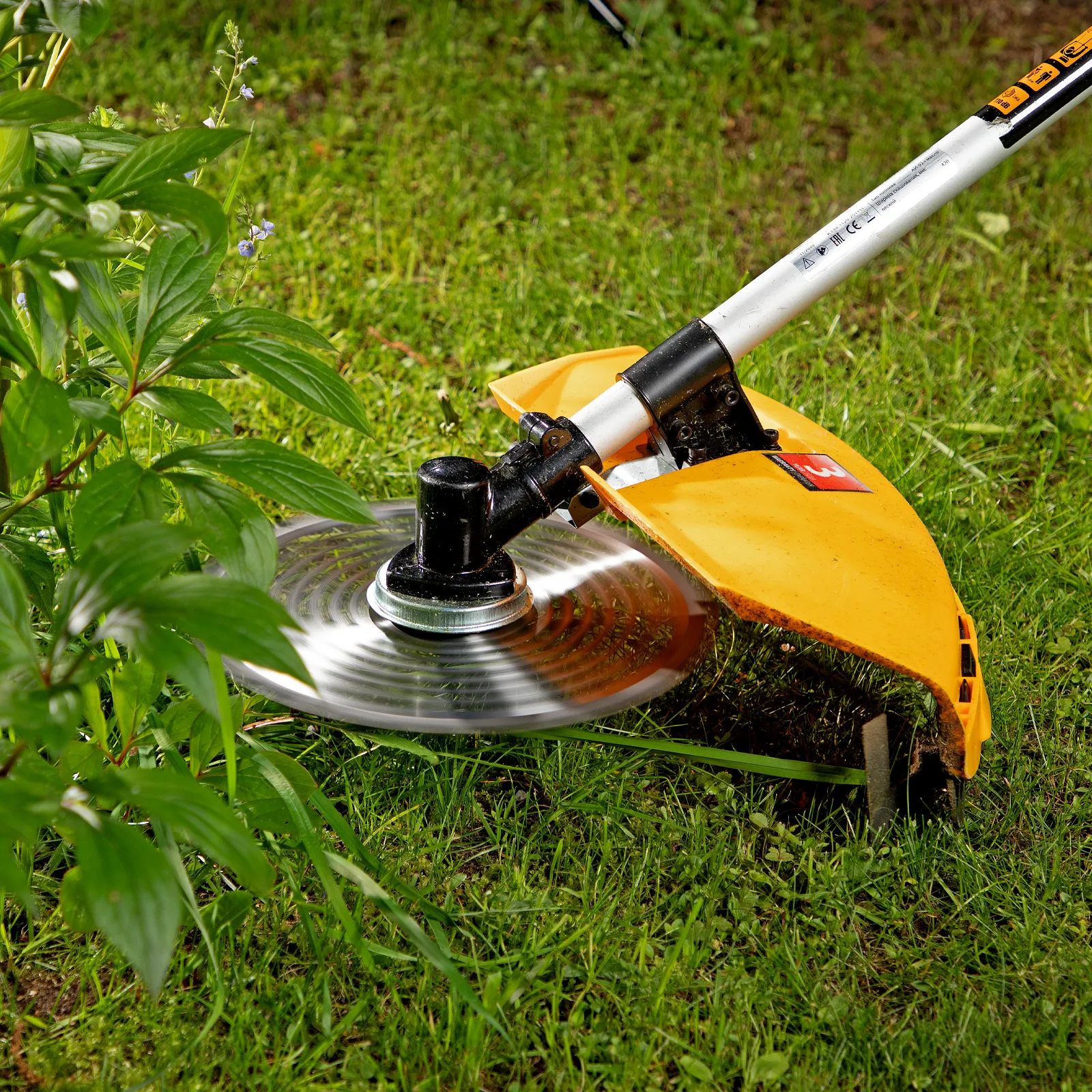 - Дополнительные возможности — можно приобрести диски Denzel 96323, 96325 для быстрого удаления растительности с жесткими стеблями (полыни, крапивы, лебеды) или 96328 для скашивания молодых побегов кустарника диаметром до 3 мм.