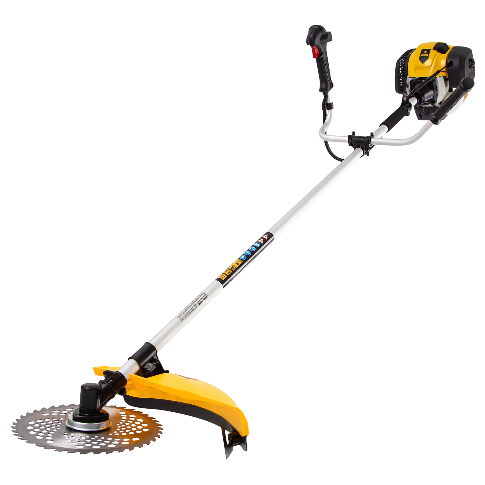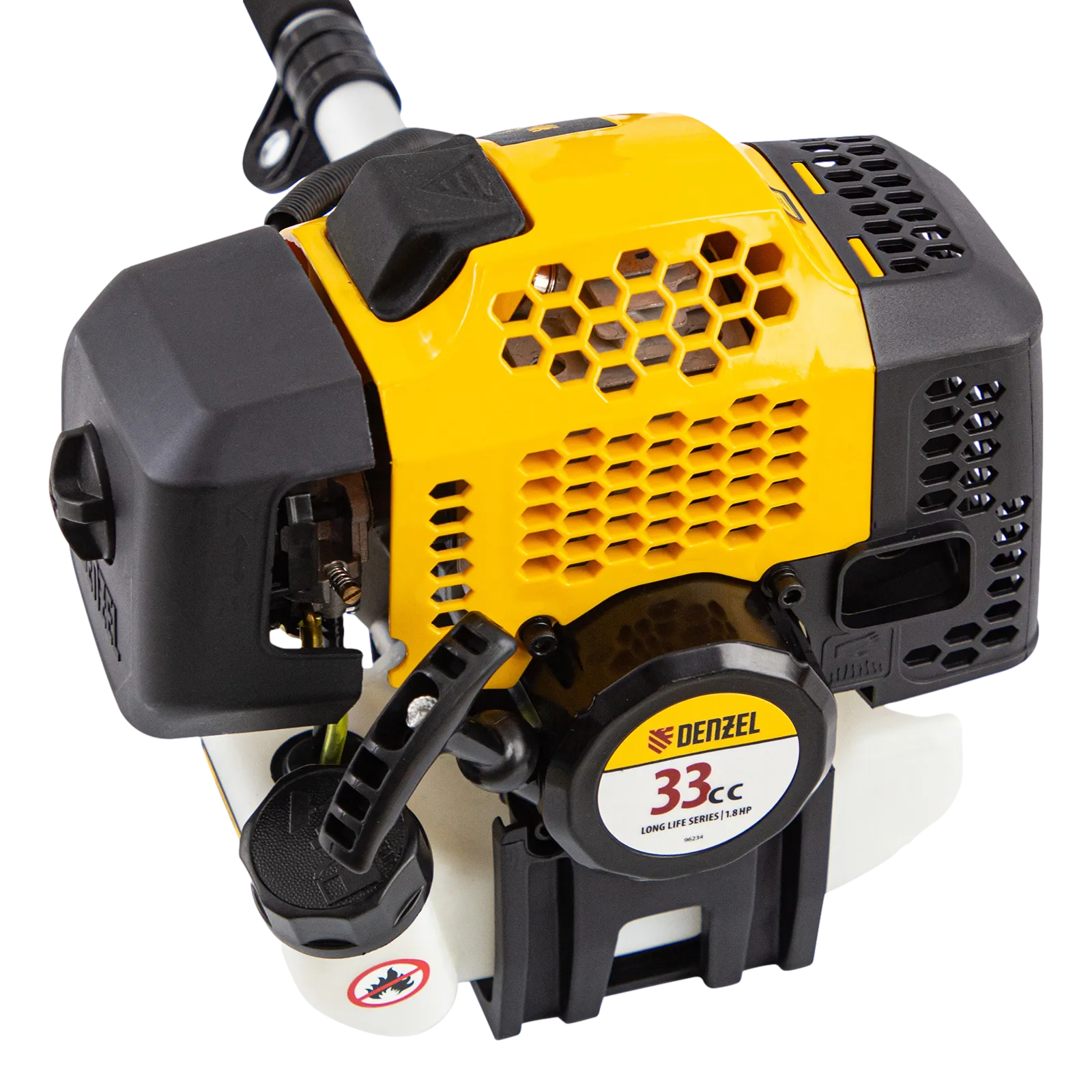 Бензиновый триммер Denzel DGT-330 93234 с двигателем объемом 33 см3 и мощностью 1,8 л. с., с неразъемной штангой, состоит из 2 частей. Комплектуется усиленной катушкой из полиамида, трехлопастным ножом и пильным диском. Предназначен для подравнивания газона, скашивания травы различных типов, в том числе с жесткими стеблями (полыни, крапивы, лебеды), а также срезания борщевика, кустарника и молодых побегов деревьев с диаметром стволов до 10 мм. Удобен для работы в местах, недоступных для колесной косилки.