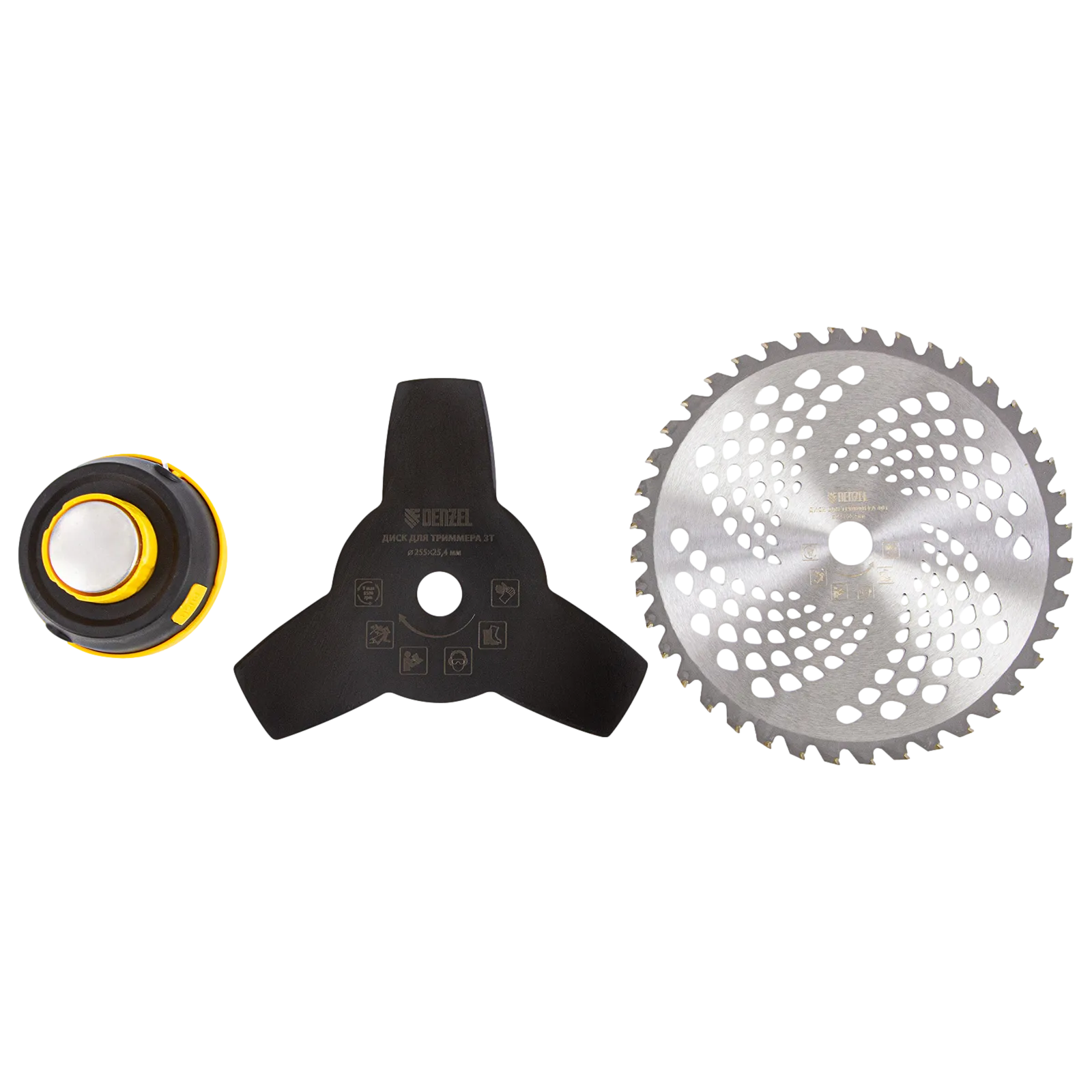 - Дополнительные возможности — можно приобрести и установить на триммер диск Denzel 96323 для быстрого удаления растительности с жесткими стеблями, 96328 для скашивания молодых побегов кустарника диаметром до 3 мм.