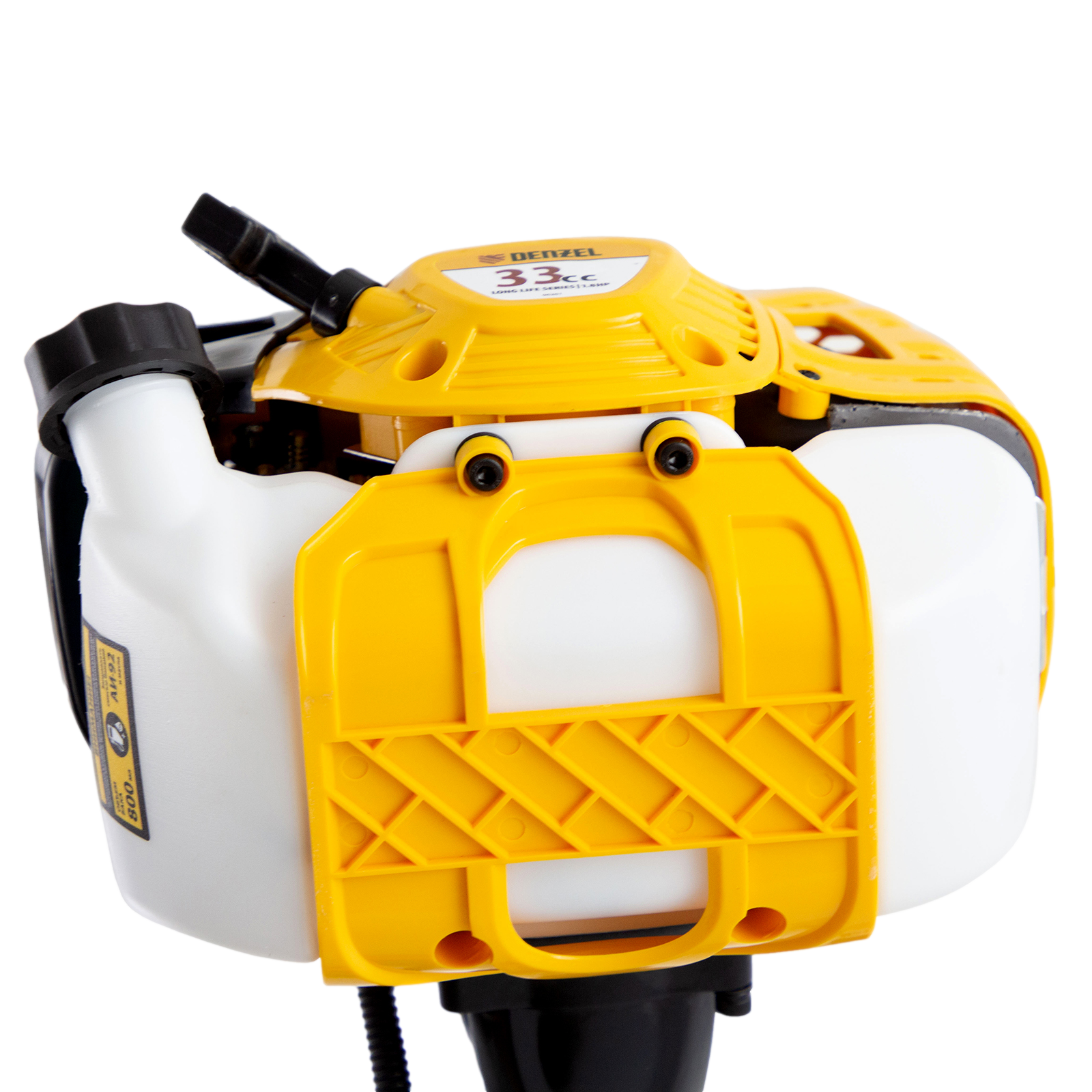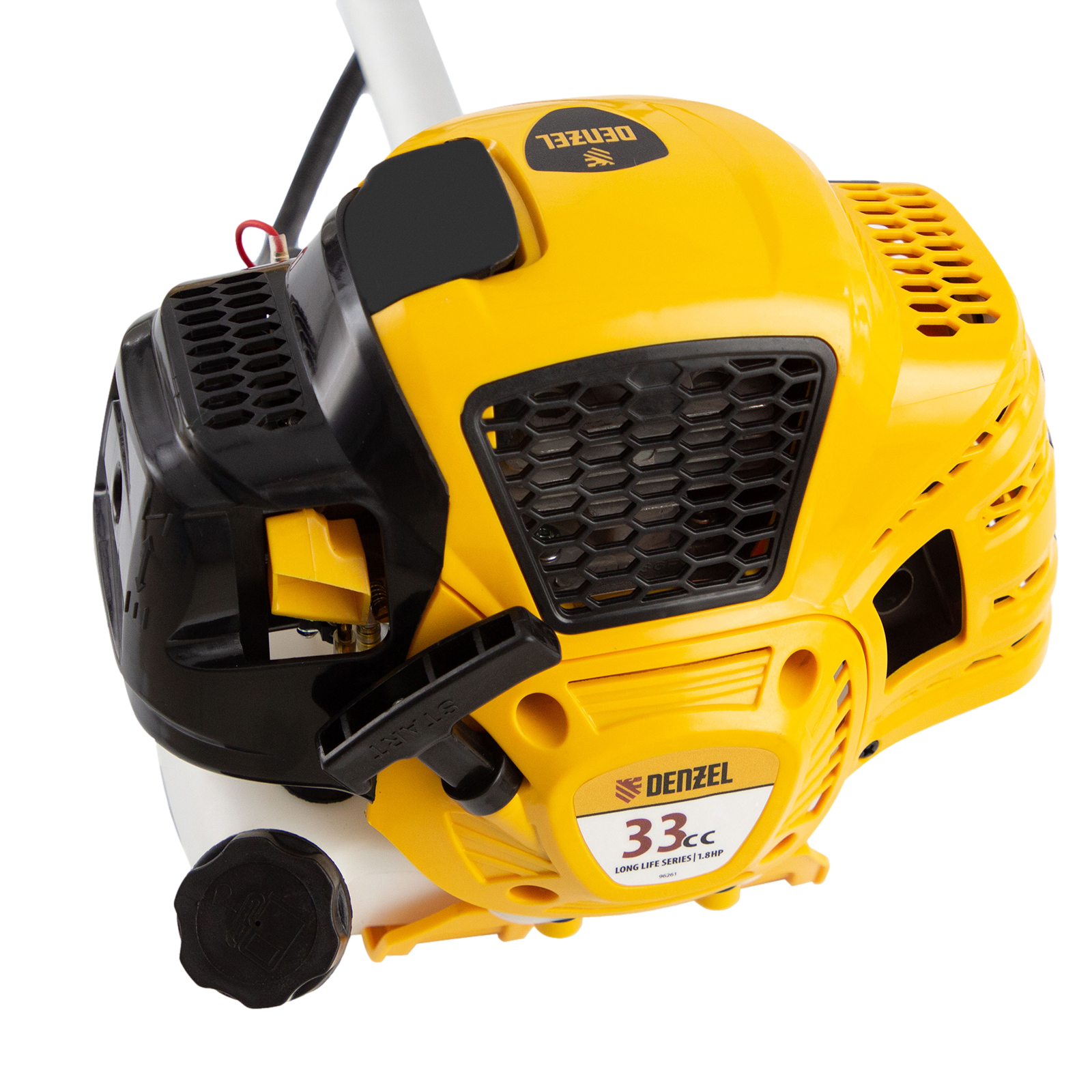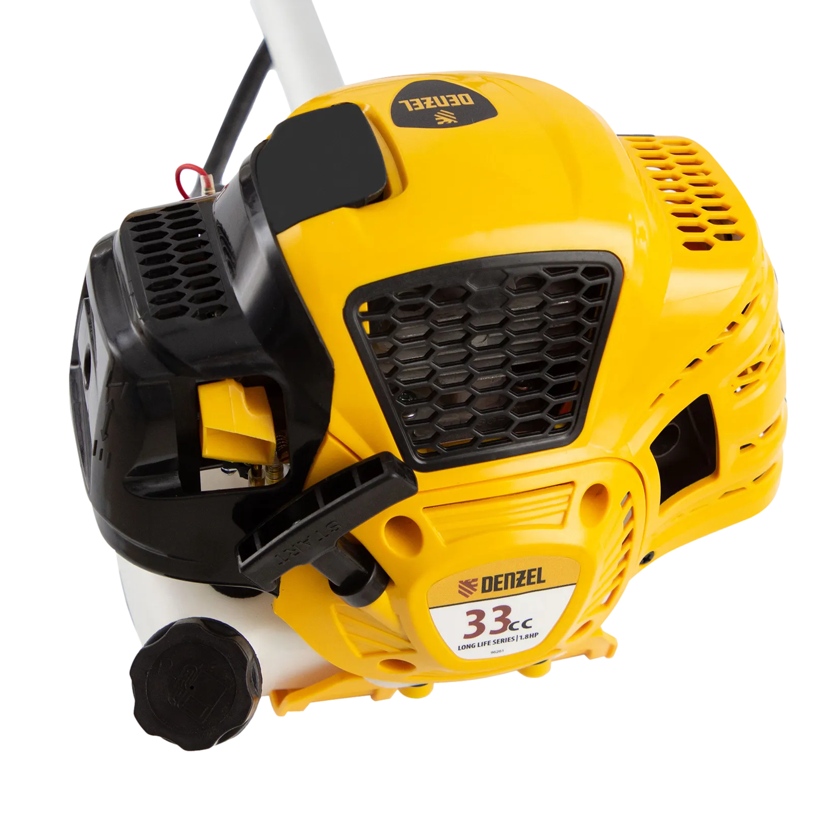 Бензиновый триммер Denzel DTL-33 96261 с объемом двигателя 33 см3 и неразъемной штангой подходит как для частичного подравнивания газона, так и скашивания травы всех типов, в том числе с жесткими древовидными стеблями (полыни, крапивы, лебеды, борщевика). Также эффективен для срезания кустарника и молодых побегов деревьев с диаметром стволов до 10 мм. Два режущих инструмента — леска и пильный диск — работают на скорости 9500 об/мин и обеспечивают ширину скашивания 42 и 25,5 см соответственно. Двигатель мощностью 1,8 л.с. экономично потребляет топливо, поэтому часто заправлять бак не придется. Триммер не требует подключения к стационарному источнику питания и может использоваться в самом отдаленном уголке дачного участка.