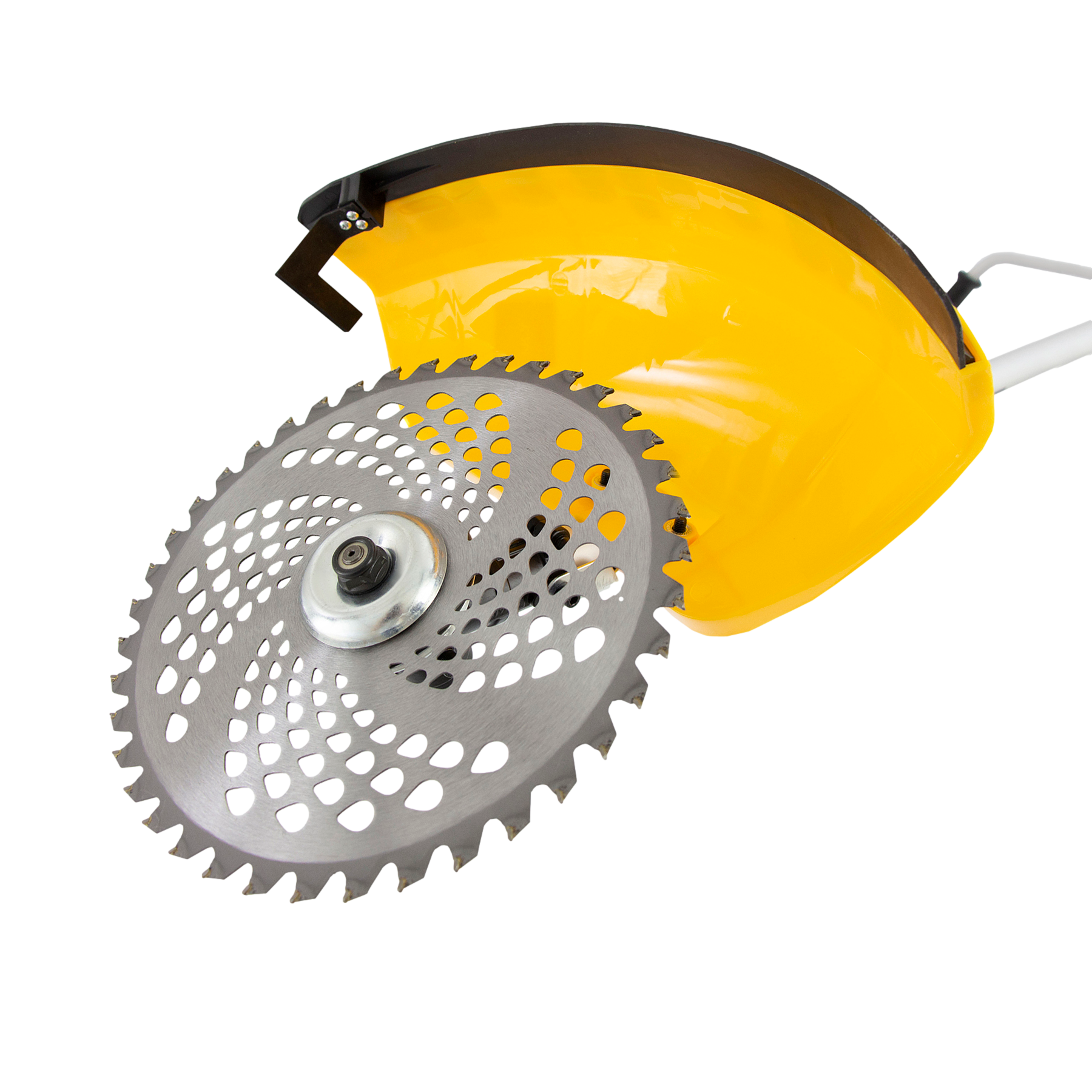 - Безопасная работа — защитный кожух закрывает режущую часть, поэтому в сторону пользователя не отлетают ветки и камни.