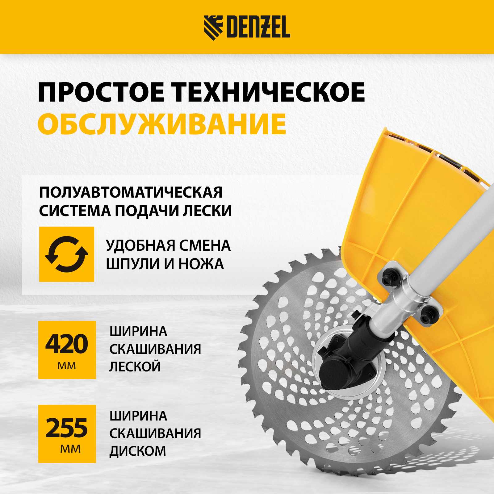 - Дополнительные возможности — можно приобрести и установить на триммер диски Denzel 96323, 96325 для быстрого удаления растительности с жесткими стеблями (полыни, крапивы, лебеды) или 96328 для скашивания молодых побегов кустарника диаметром до 3 мм.