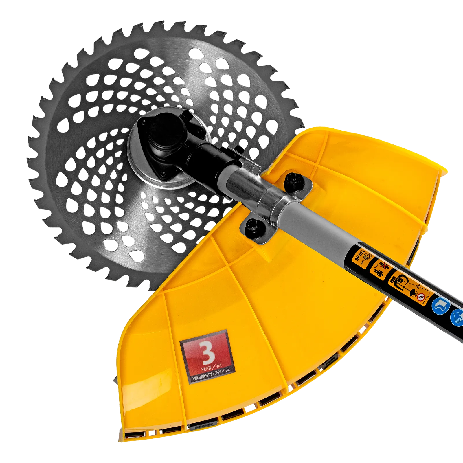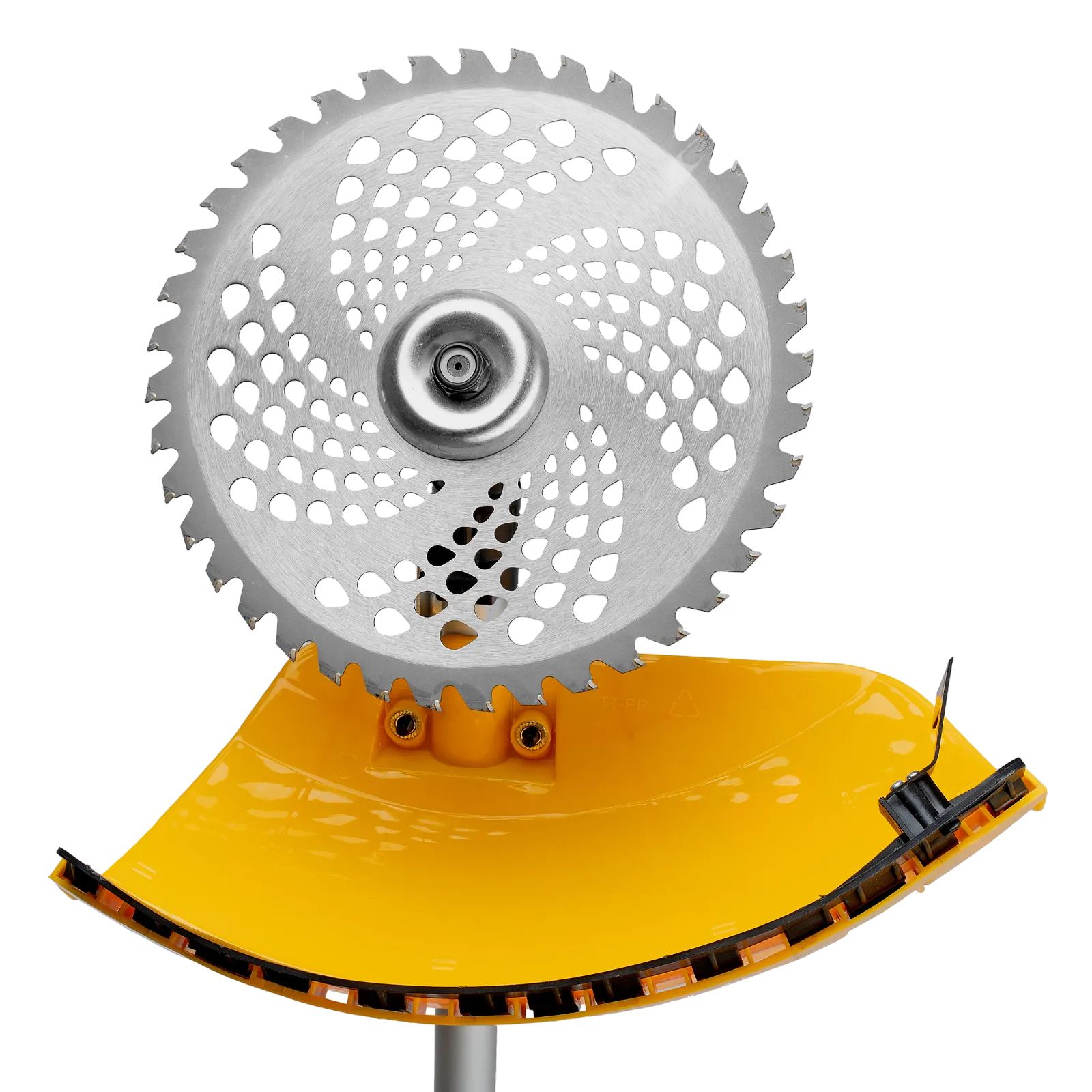 - Дополнительные возможности — можно приобрести и установить на триммер диски Denzel 96323, 96325 для быстрого удаления растительности с жесткими стеблями (полыни, крапивы, лебеды), 96328 для скашивания молодых побегов кустарника диаметром до 3 мм.