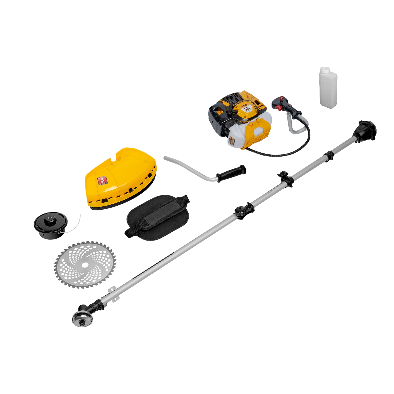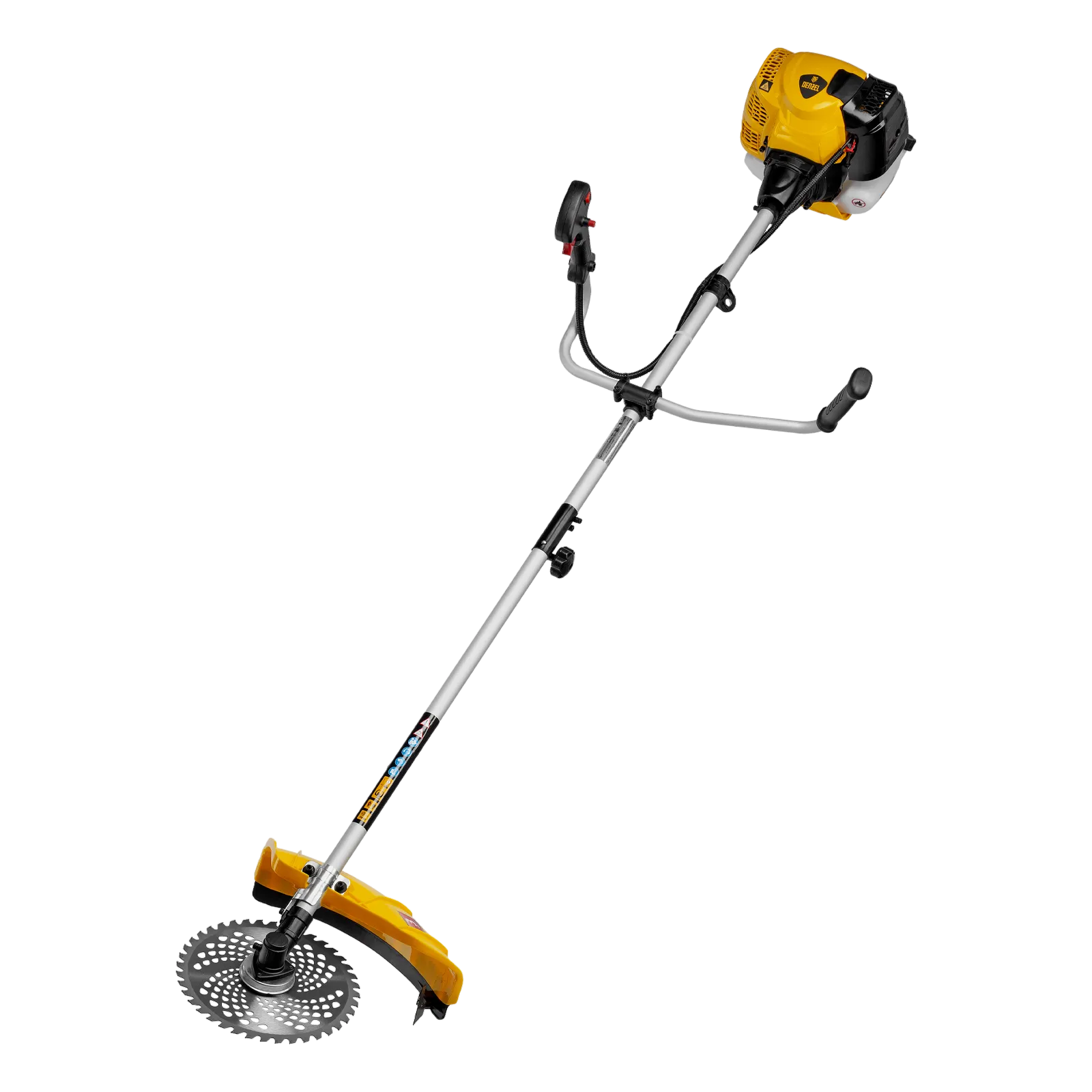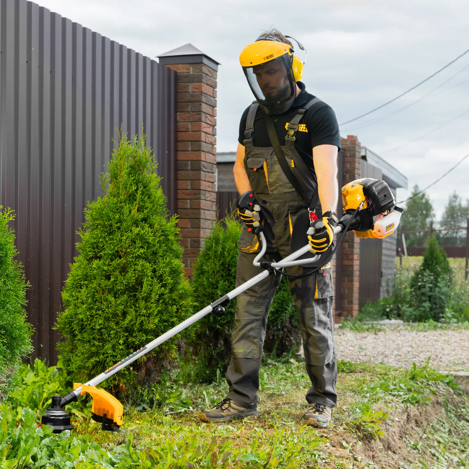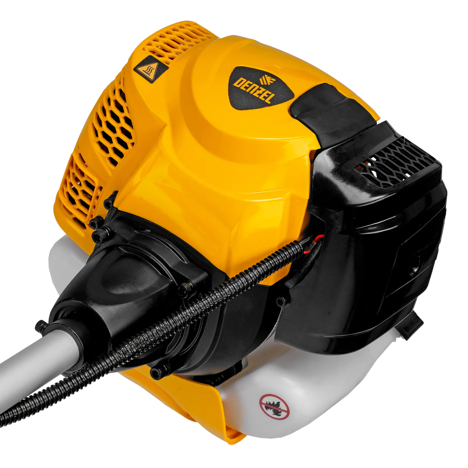 Бензиновый триммер Denzel DTL-52S 96266 с разъемной штангой, состоящей из 2 частей, оснащен 2-тактным двигателем объемом 52 см3 и предназначен для стрижки газона, скашивания травы всех типов, в том числе с жесткими древовидными стеблями (полыни, крапивы, лебеды, борщевика), а также срезания кустарника и молодых побегов деревьев с диаметром стволов до 10 мм. Усиленная катушка с леской и пильный диск обеспечивают ширину скашивания 42 и 25,5 см. Инструмент не требует подключения к электросети, поэтому подходит для работы с влажной травой и может использоваться на отдаленных от дома участках.