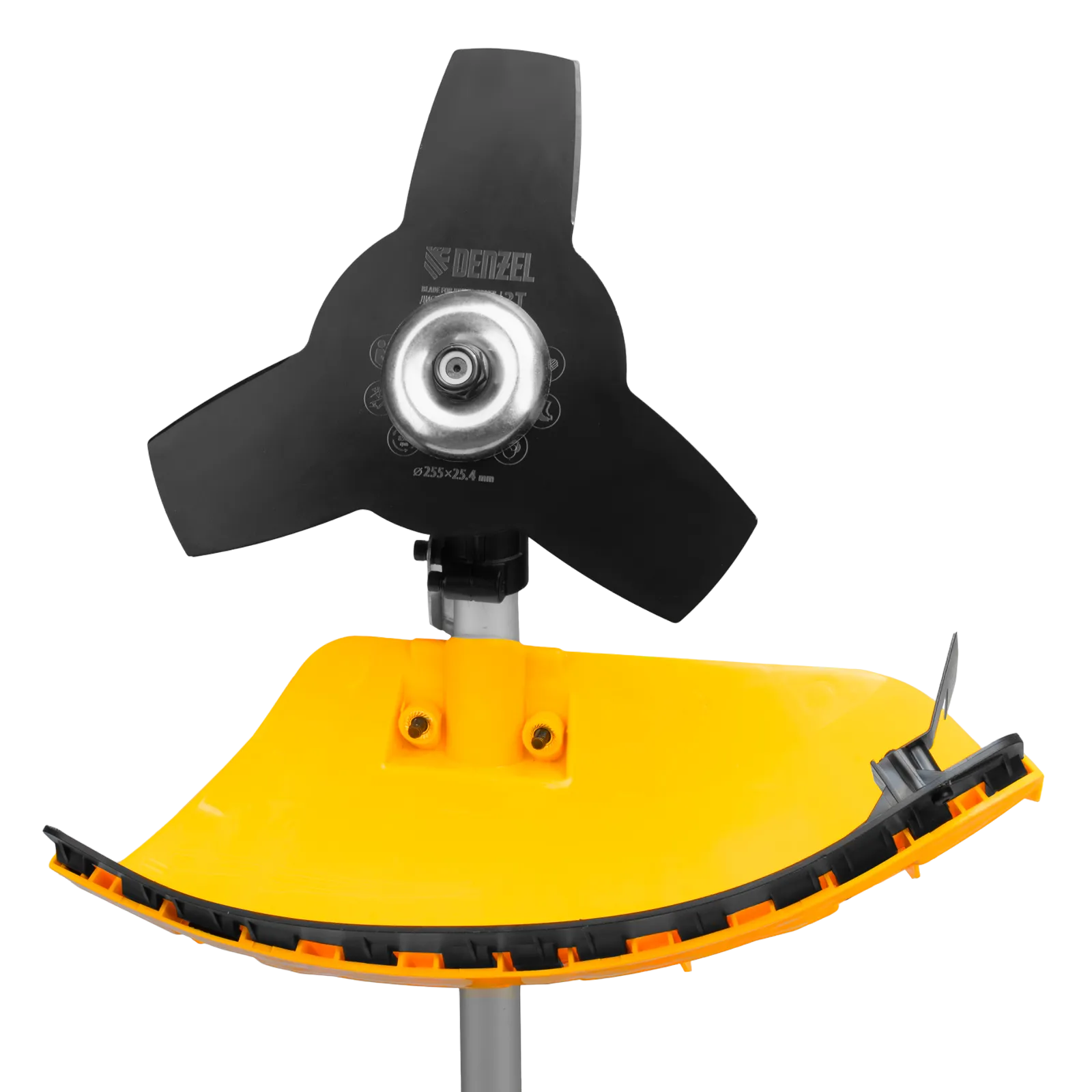 - Дополнительные возможности — можно приобрести диск Denzel 96323 с шириной скашивания 230 мм для быстрого удаления растительности с жесткими стеблями, 96328 для скашивания молодых побегов кустарника диаметром до 3 мм.