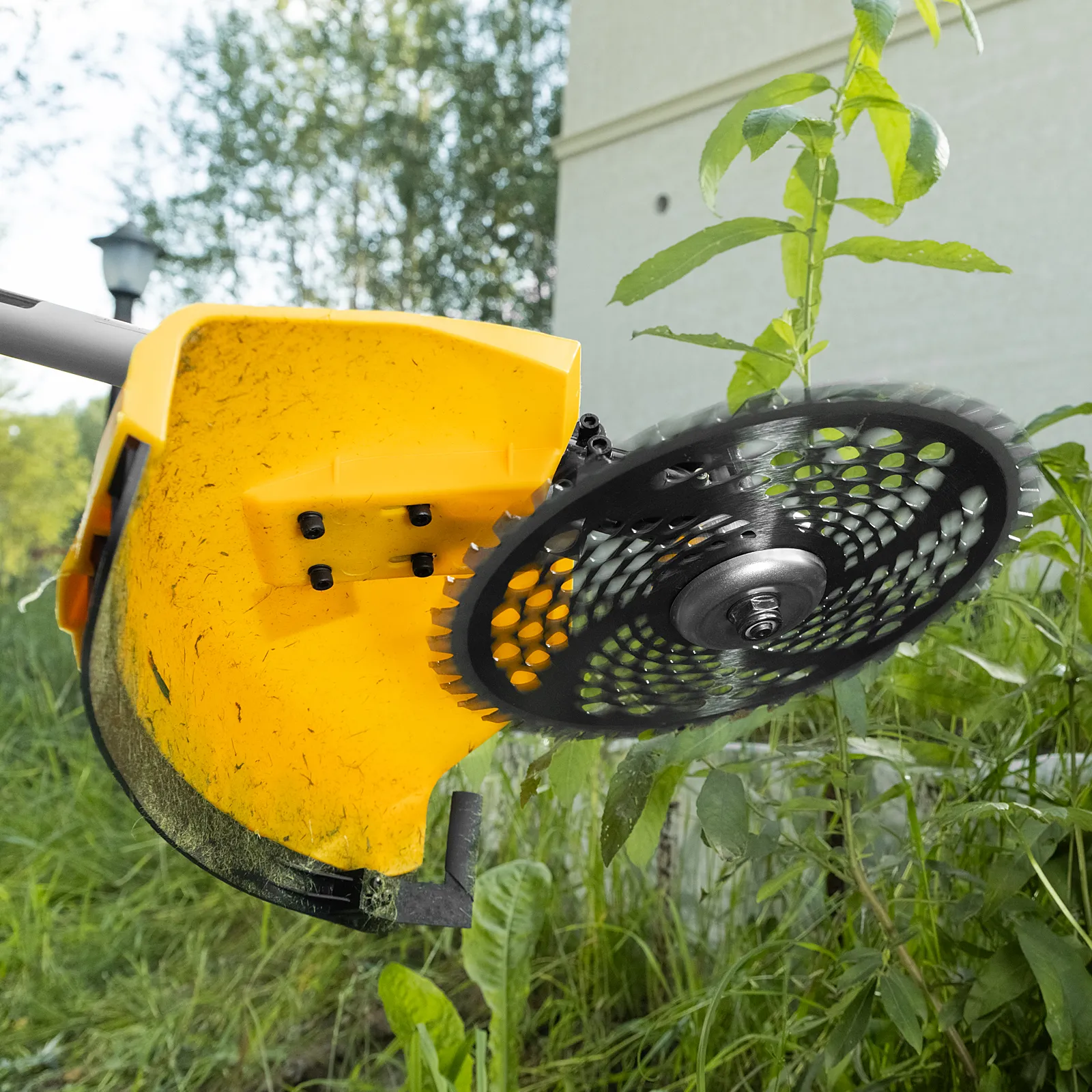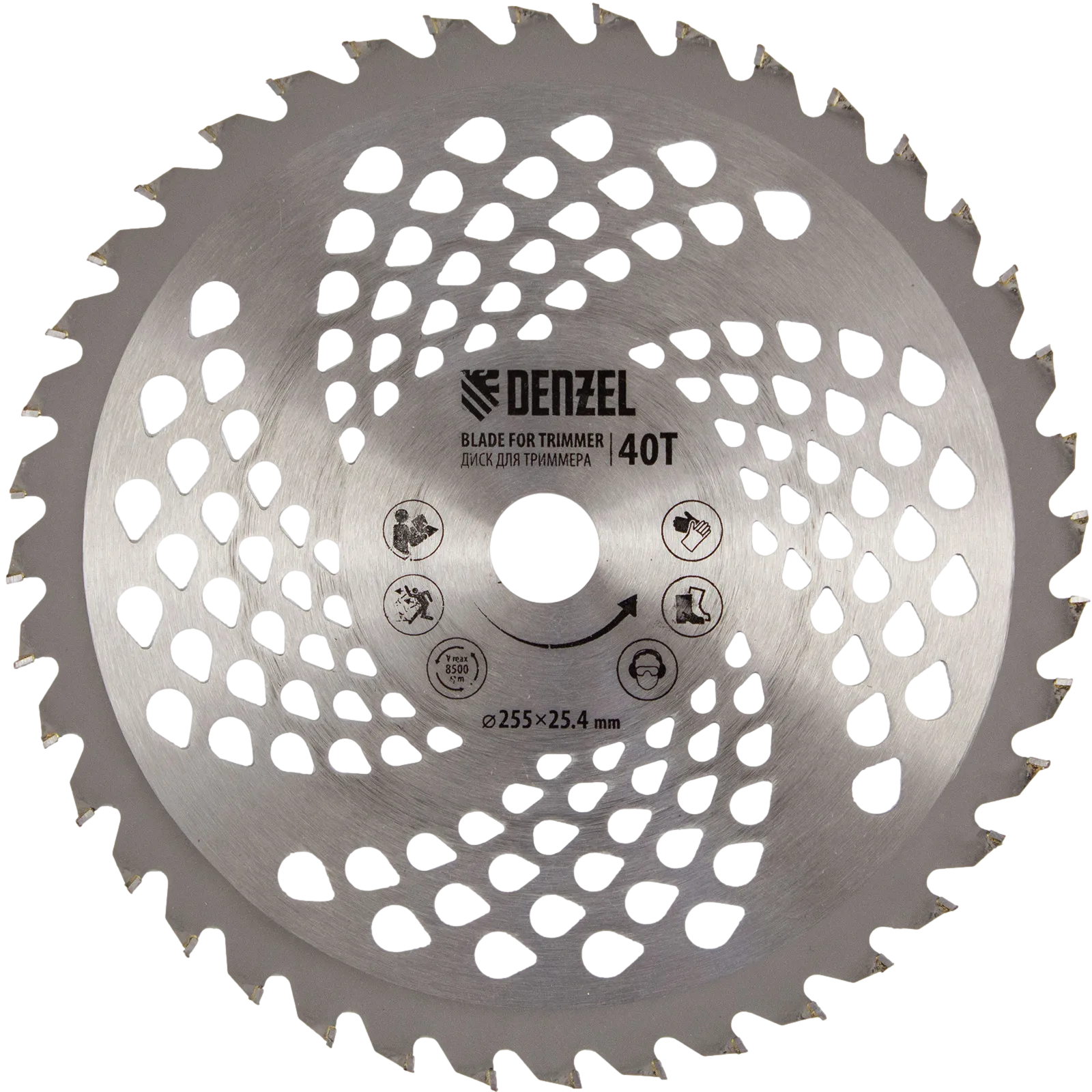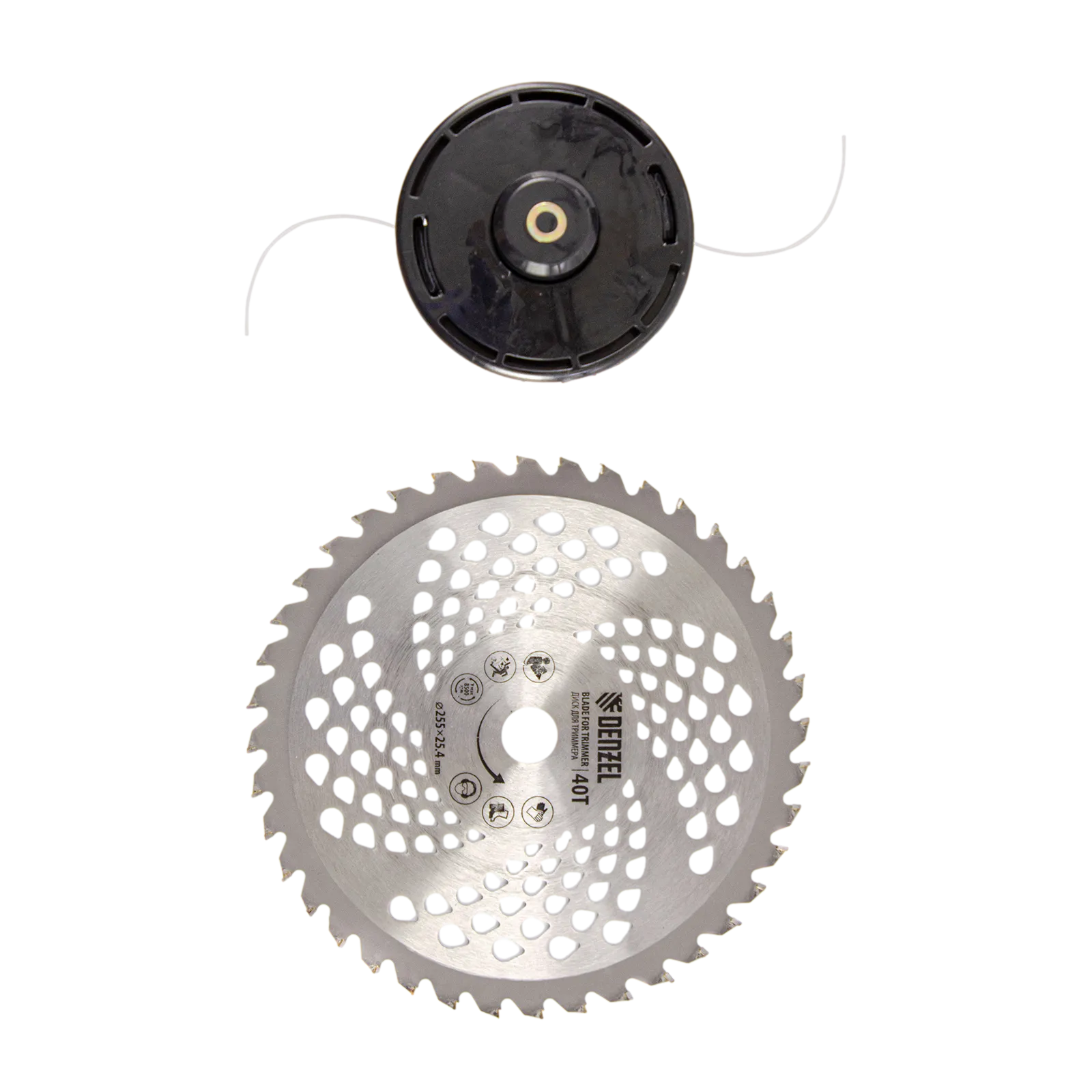 - Дополнительные возможности — можно приобрести диски Denzel 96323, 96325 для быстрого удаления растительности с жесткими стеблями, 96328 для скашивания молодых побегов кустарника диаметром до 3 мм.