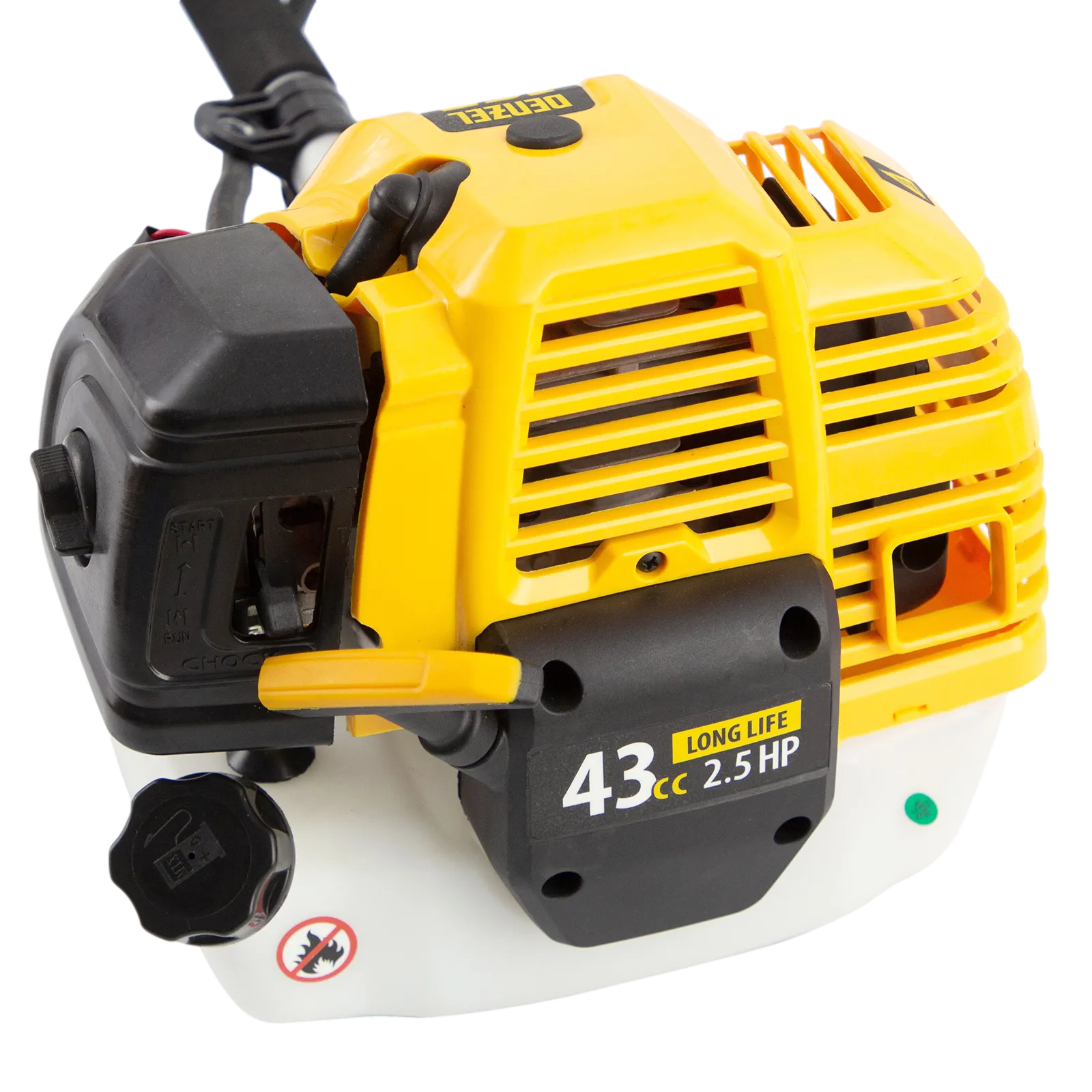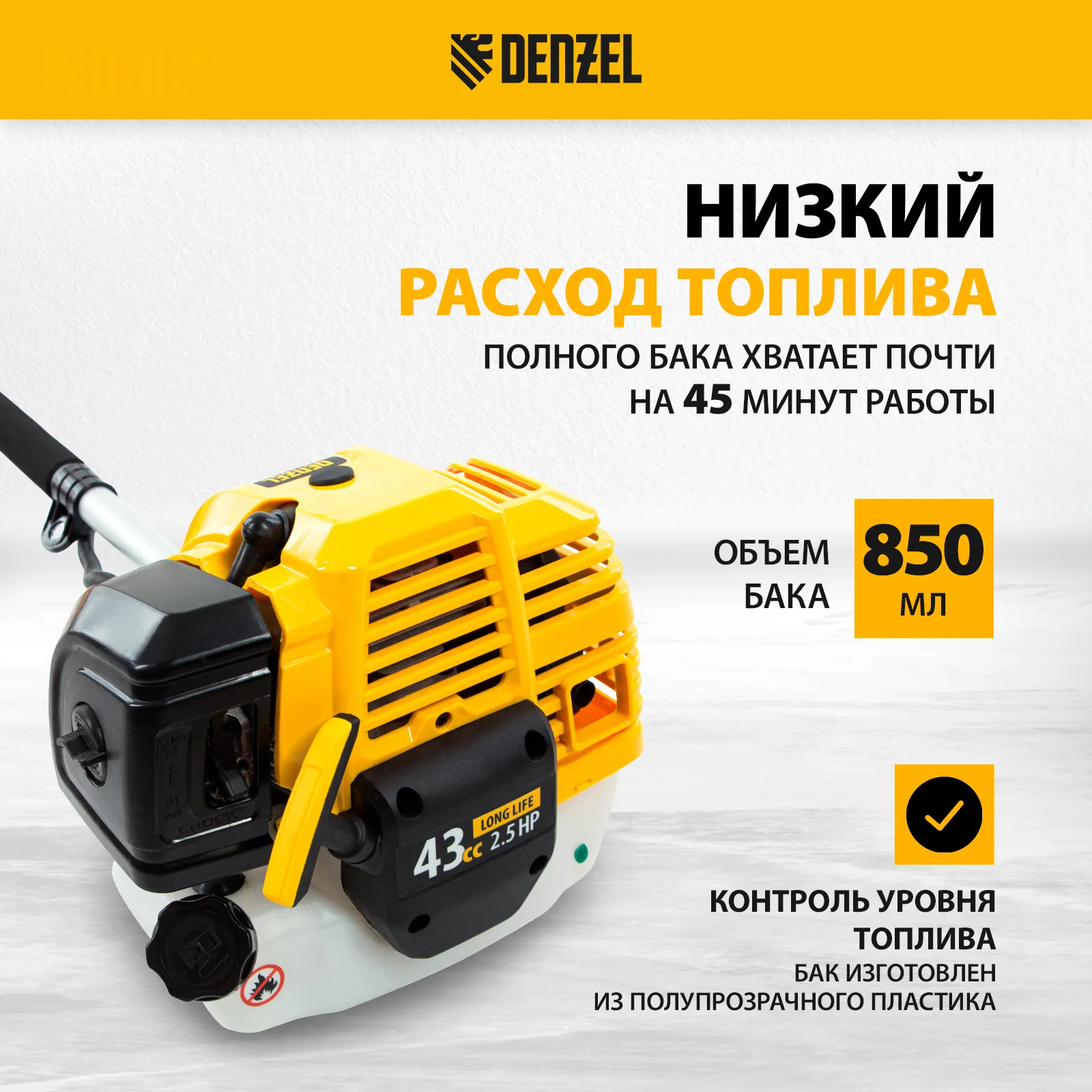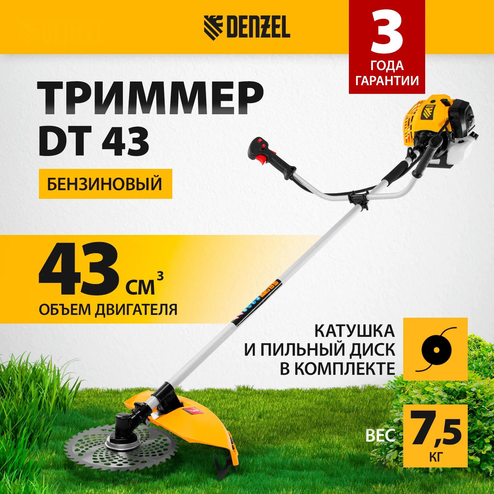 Бензиновый триммер Denzel DT-43 96224 оснащен экономичным, надежным и простым в эксплуатации двигателем мощностью 2,5 л.с. и объемом 43 см³, имеет неразъемную штангу и поставляется комплектом из 2 частей. Оптимален для подравнивания газона и скашивания травы с жесткими древовидными стеблями (полыни, крапивы, лебеды, борщевика), а также срезания кустарника и молодых побегов деревьев с диаметром стволов до 10 мм. Эффективно скашивает траву в труднодоступных местах: вдоль кромок дорожек, стен строений и вокруг деревьев. В комплекте катушка с леской и пильный диск, ширина скашивания составляет 420 мм и 255 мм соответственно.