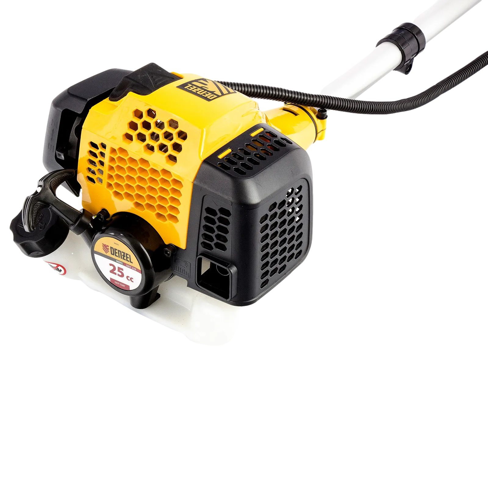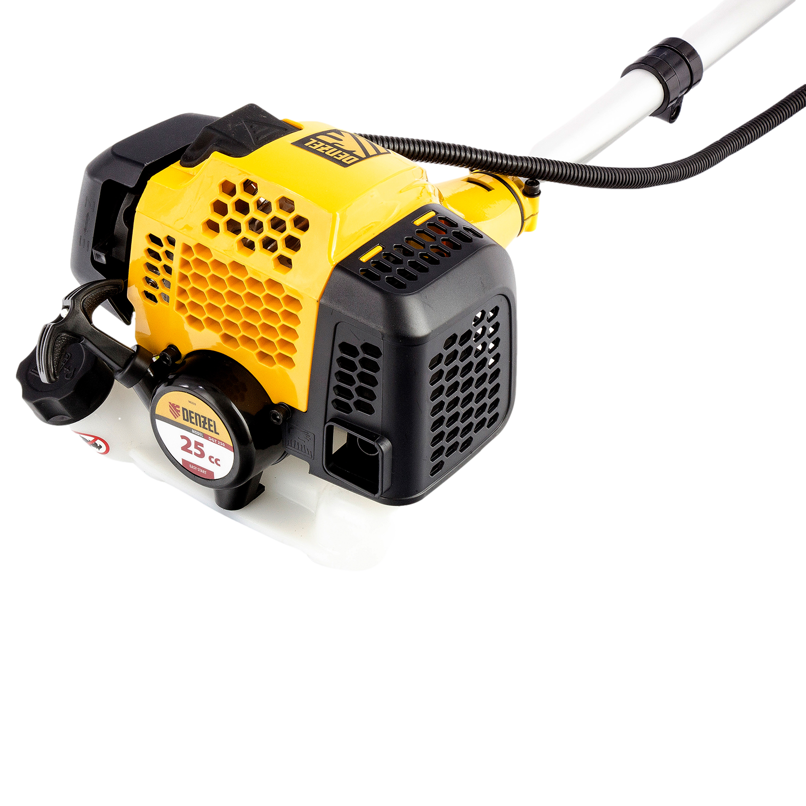 Бензиновый триммер Denzel DGT-250 96223 с двигателем объемом 25 см3 и мощностью 1,3 л. с., с неразъемной штангой, состоит из 2 частей. Комплектуется усиленной катушкой, трехлопастным ножом и пильным диском. Предназначен для подравнивания газона, скашивания травы различных типов, в том числе с жесткими стеблями (полыни, крапивы, лебеды), а также срезания борщевика, кустарника и молодых побегов деревьев с диаметром стволов до 10 мм. Удобен для работы в местах, недоступных для колесной косилки.
